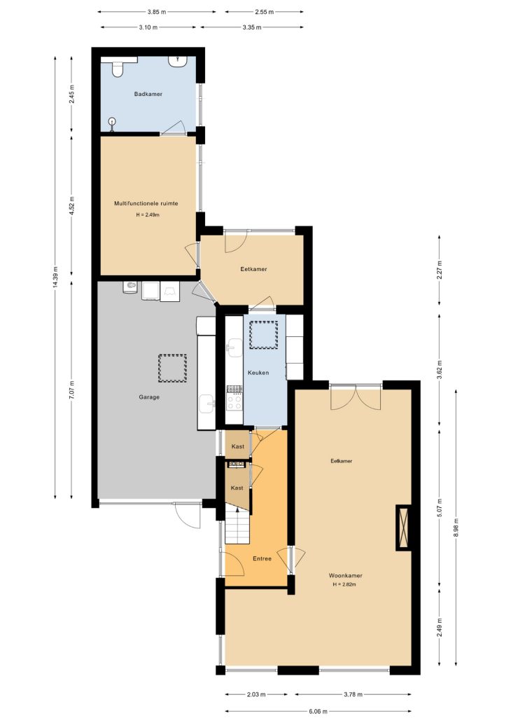 Begane grond: entree/hal met trapopgang, vaste kast (geschikt om weer als toilet in te richten) en een kelderkast. Via een mooie glasdeur stapt u de heerlijk lichte en riante woonkamer binnen met een stijlvolle schouw met openhaard, openslaande tuindeuren en voldoende ruimte voor een aparte tv-hoek of speelhoek. Dichte keuken, voorzien van een moderne keukenopstelling o.a. uitgerust met inductiekookplaat, gaskookplaat, oven, quooker, vaatwasmachine en koelkast, aangebouwde eetkamer met tuindeur, toegang naar de aanbouw, waarin de slaapkamer en aangrenzende badkamer (voorzien van wastafel, toilet en douche) zich bevinden. Vanuit de hal ook toegang naar de praktische garage met lichtkoepel en openslaande deuren.