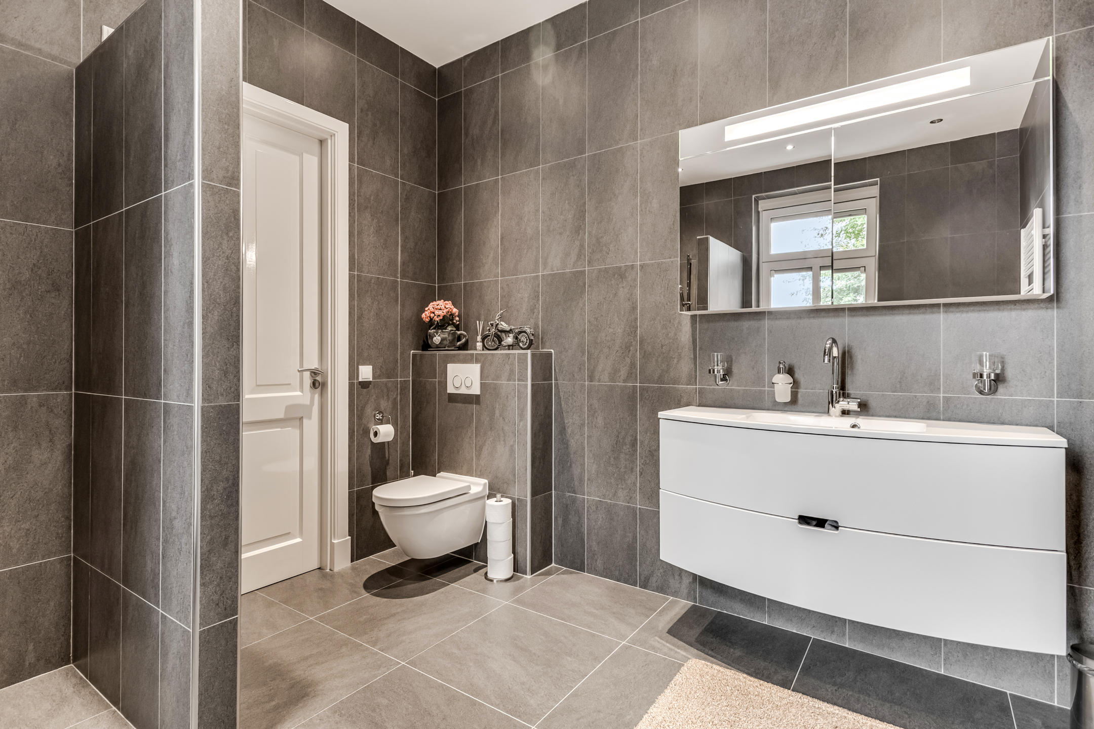 Ook bevindt zich op de verdieping een tweede badkamer in neutrale kleurstelling. Deze beschikt over een douche, wastafel en toilet.