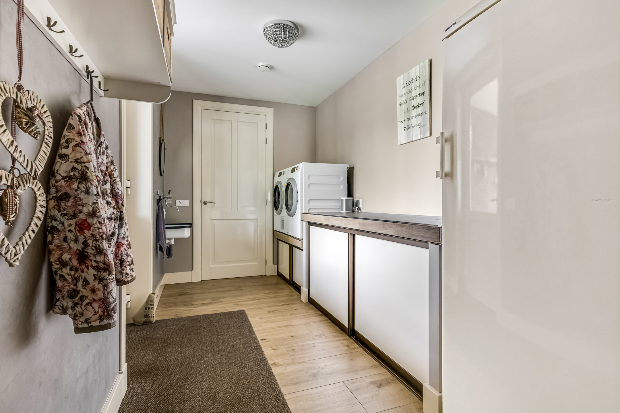 Aan de achterzijde van de woning verbindt een hal/bijkeuken de woning vanuit de keuken met de aangebouwde garage. In deze bijkeuken is er een vaste kastenwand geplaatst met aansluitingen voor de witgoedapperatuur.