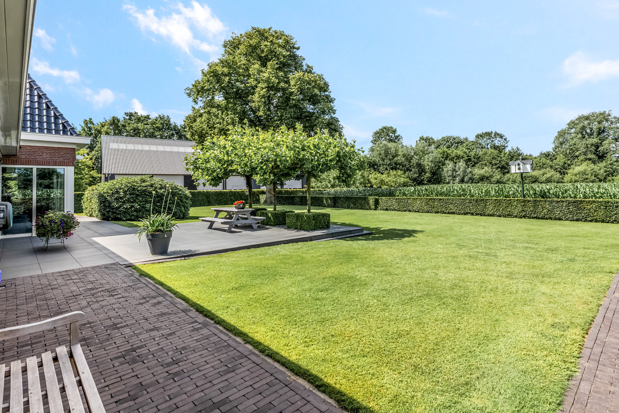 De fraai aangelegde en uitstekend onderhouden tuin heeft een speelse uitstraling dankzij de sierlijke rondingen in het ontwerp. Op één van de zonnige terrassen geniet u in alle rust van het weidse uitzicht, terwijl de automatische beregeningsinstallatie zorgt voor een gezonde en groene beplanting en een strak gazon, zonder dat u hier omkijken naar heeft.