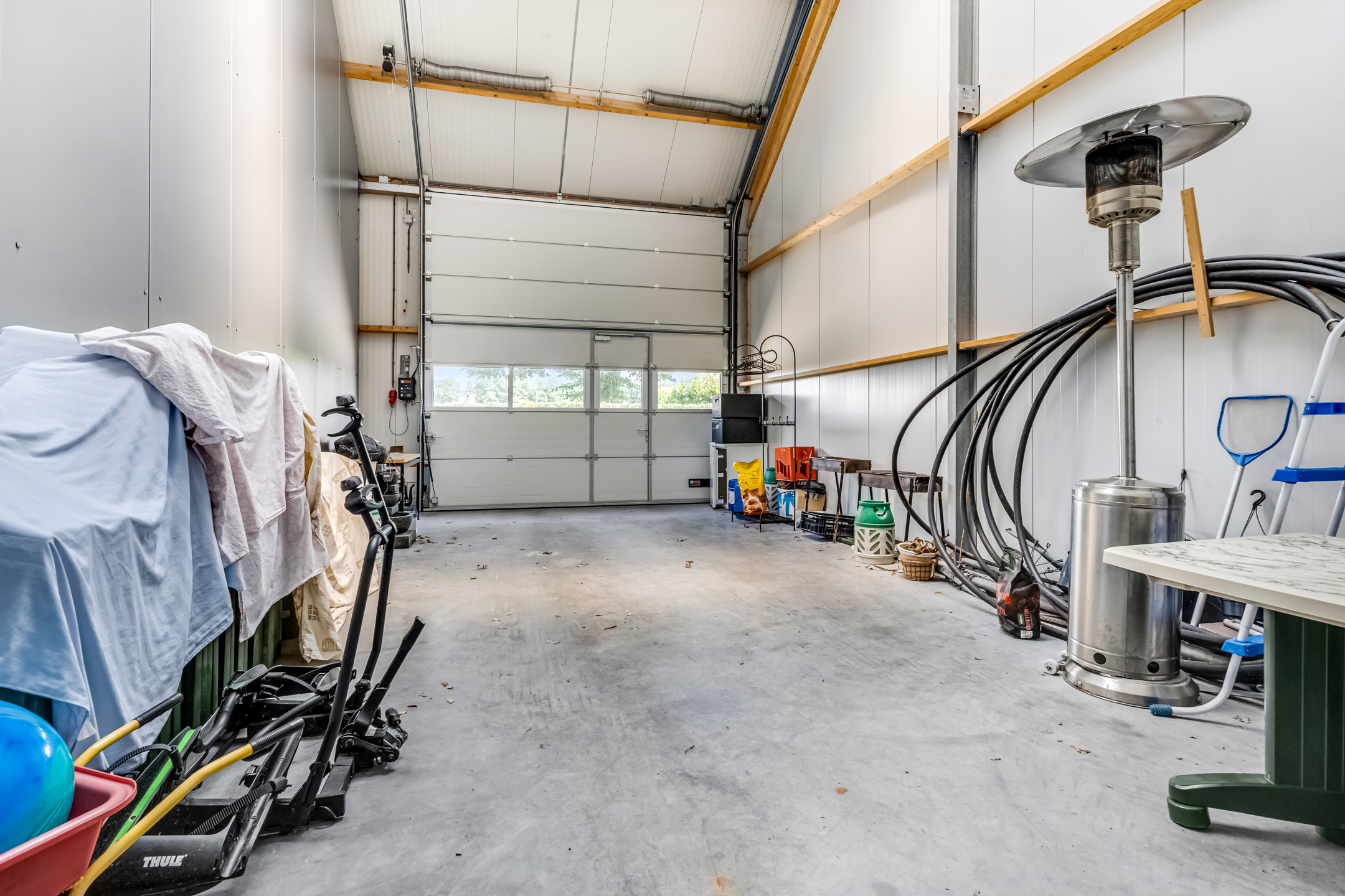 Zowel de garage als de hal hebben een achter entree. De ruime dubbele garage beschikt over automatisch op afstand bedienbare Horrmann deuren, een vaste kastenwand voorzien van een koel-/vriescombinatie, (stoom)oven en opstelplaats voor het stofzuigsysteem. Tot slot is er een zolderruimte welke bereikbaar is middels een vlizotrap.