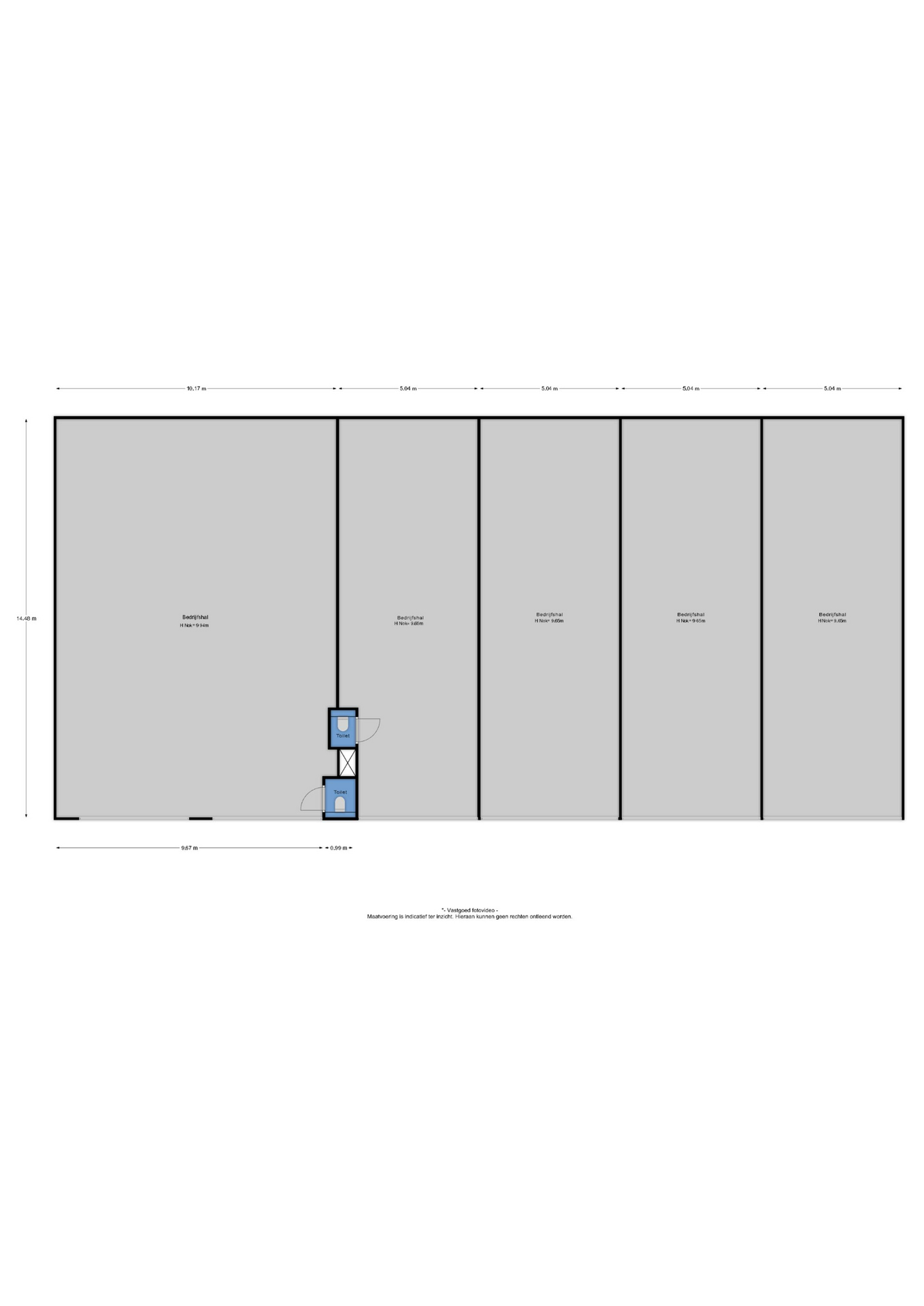 De multifunctionele bedrijfsruimte is onderverdeeld in een vijftal compartimenten. Eén compartiment van 14,5 x 10 meter, voorzien van een separaat toilet. Vier compartimenten met een afmeting van 14,5 x 5 meter. Eén van deze vier compartimenten is voorzien van een separaat toilet én entresol van ca. 50 m². Iedere ruimte is afzonderlijk toegankelijk middels een eigen sectionaaldeur met loopdeur.