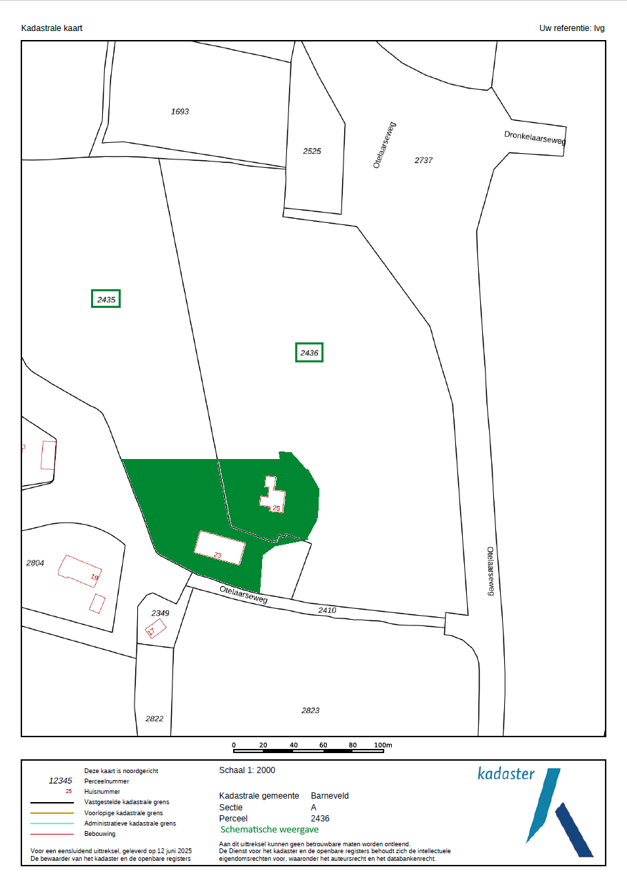 Het totale perceel is kadastraal bekend gemeente Barneveld, sectie A, nummers 2435 (gedeeltelijk) en 2436 (gedeeltelijk), totaal groot ca. 9.000 m².