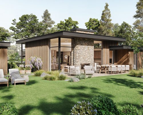 De subtiele combinatie van hout, natuursteen en glas geeft deze bungalow een exclusieve en ontspannen uitstraling. De grote dakoverstekken zorgen voor schaduwwerking, privacy en een krachtige horizontale vorm. De woning biedt het gevoel van een luxe retreat midden in het groen, maar met het comfort van nieuwbouw en alle moderne technieken.