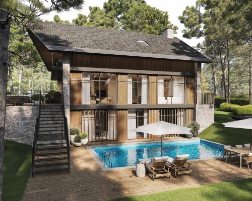 Het exterieur bestaat uit een hoogwaardige gevelafwerking in Thermo Fraké hout gecombineerd met natuurstenen elementen, zoals bevestigd in de Technische Omschrijving.