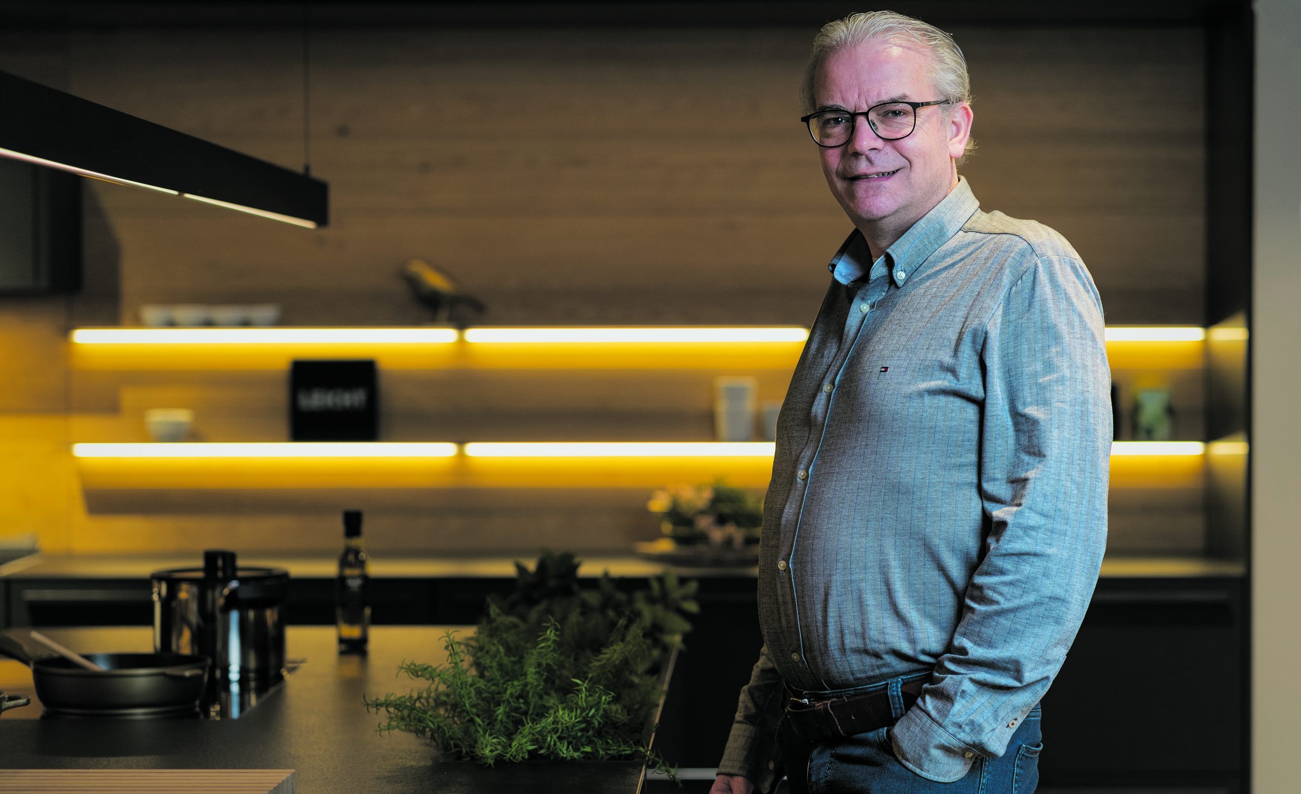 Toen het stel voor het eerst de showroom binnenliep, was er nog weinig concreets. “Ze hadden een ruwe schets in gedachten”, vertelt Hars Bakkenes, ontwerp- en verkoopadviseur bij Van Manen Keukens. “We zijn begonnen met het bespreken van hun apparatuurwensen. De kookplaat stond bovenaan hun lijst: inductie, vijf zones én ingebouwde afzuiging. Dat leek eerst niet mogelijk, omdat de meeste kookplaten met afzuiging maar vier zones hebben.” Maar Hars wist beter: “We hebben een model van 120 centimeter breed, waarbij de afzuiging aan de achterkant zit. Daarmee konden we precies bieden wat ze wilden.” Ook de kleurstelling was snel gevonden. “Ze zagen een opstelling in onze showroom die meteen aansprak”, zegt Hars. “Die had een kunststof keukenblad, maar zij kozen voor een keramische variant in dezelfde tint. De stijl is strak landelijk, met een warme twist. Een beetje de hotellook waar Herma van houdt.”