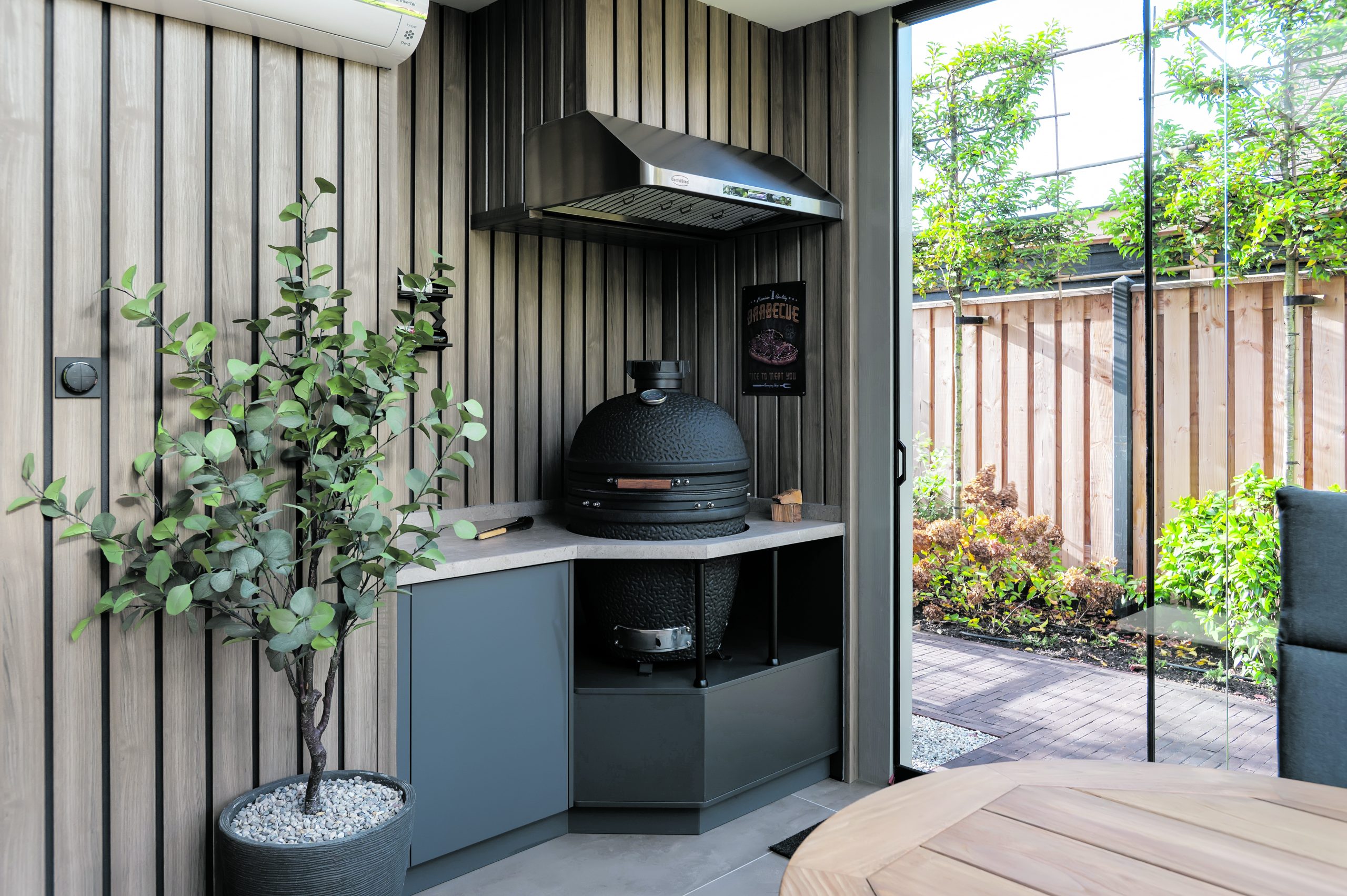 Naast de keuken ontwierp Van Manen ook de bijkeuken van het stel en een maatwerk buitenkeuken. “Ze kwamen later terug met de vraag of we ook de opstelling rondom hun Black Bastard-barbecue konden maken”, aldus Hars. “We kregen de maatvoering aangeleverd en hebben het ontwerp daarop afgestemd. De houten latjes hebben ze zelf aangebracht, maar het blad en de kasten zijn volledig door ons getimmerd. Echt maatwerk.” De bijkeuken bevat onder andere een vriezer, koelkast en ruime opbergkasten in dezelfde kleurstelling als de keuken. “Dat maakt het huis heel samenhangend,” zegt Herma. “We hebben ook in de hal een kastenwand laten maken in dezelfde stijl. Het is fijn dat alles in het geheel klopt.”