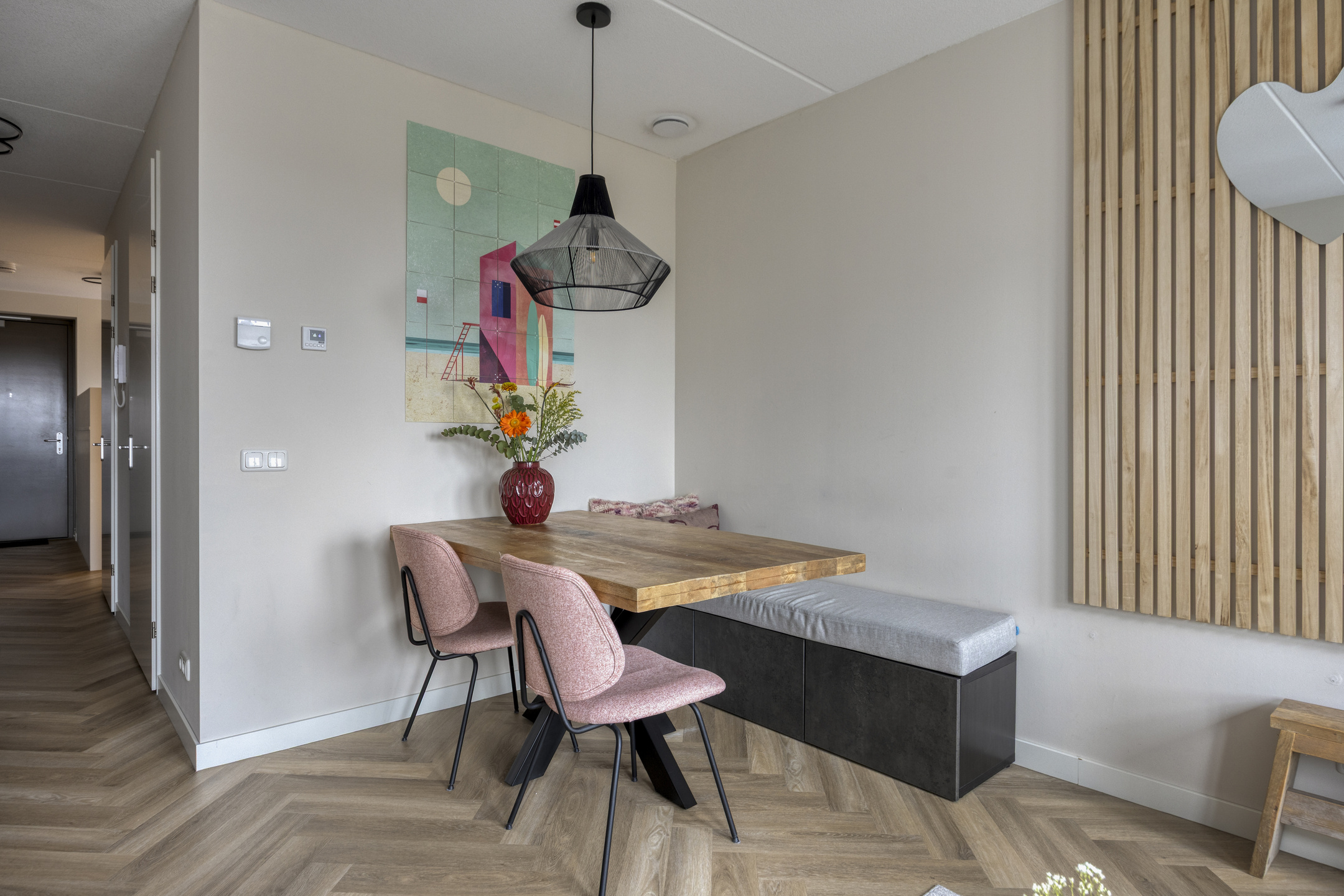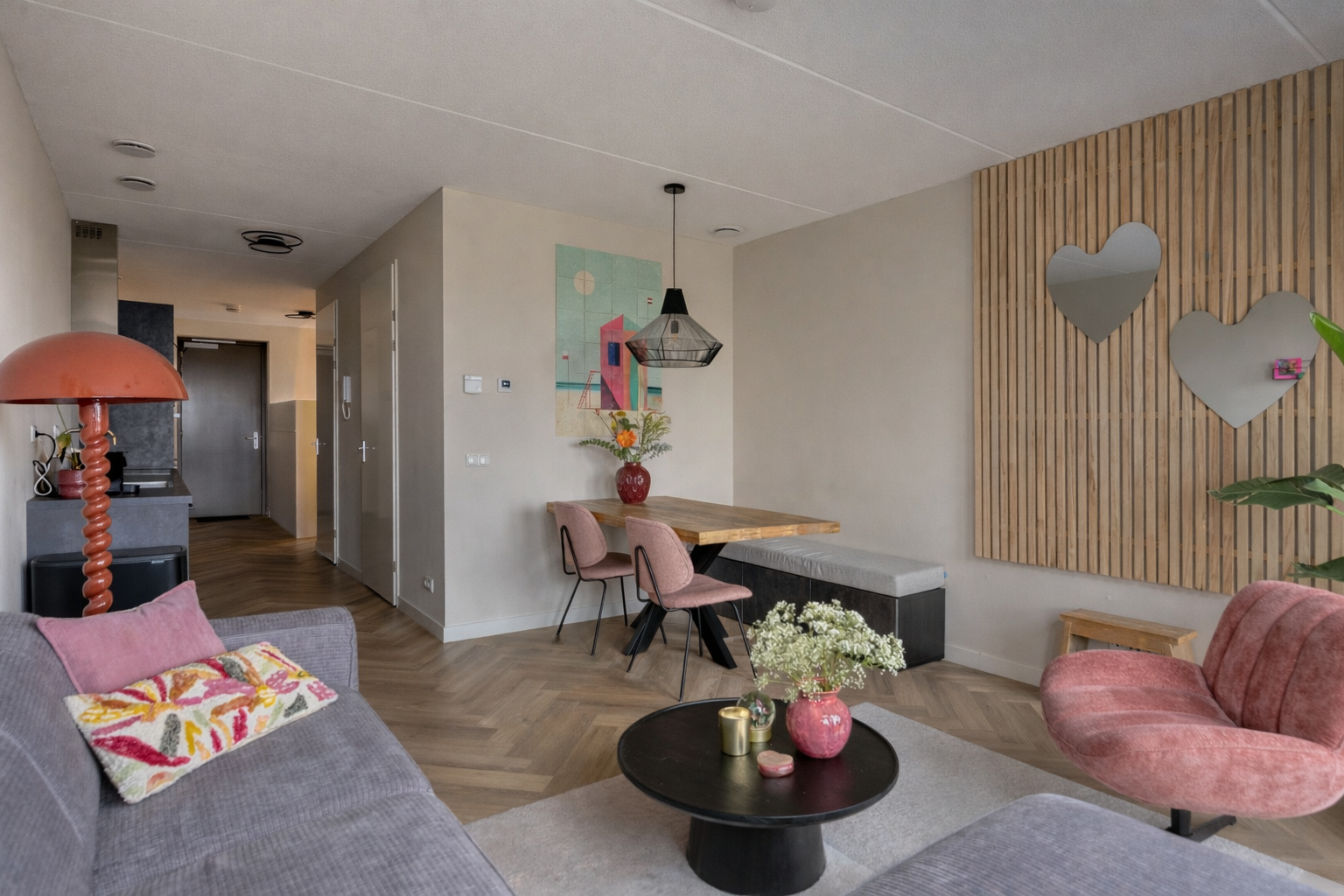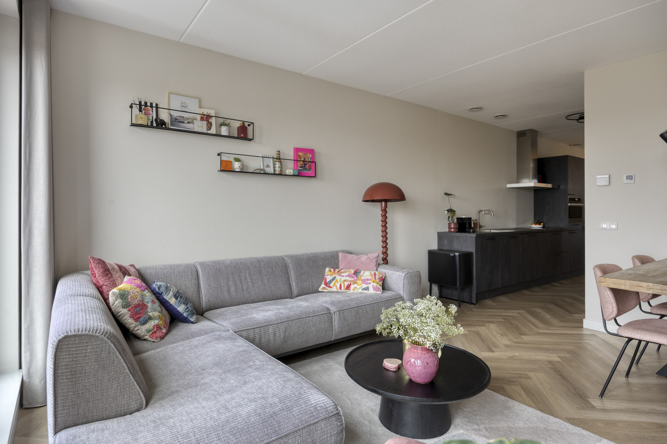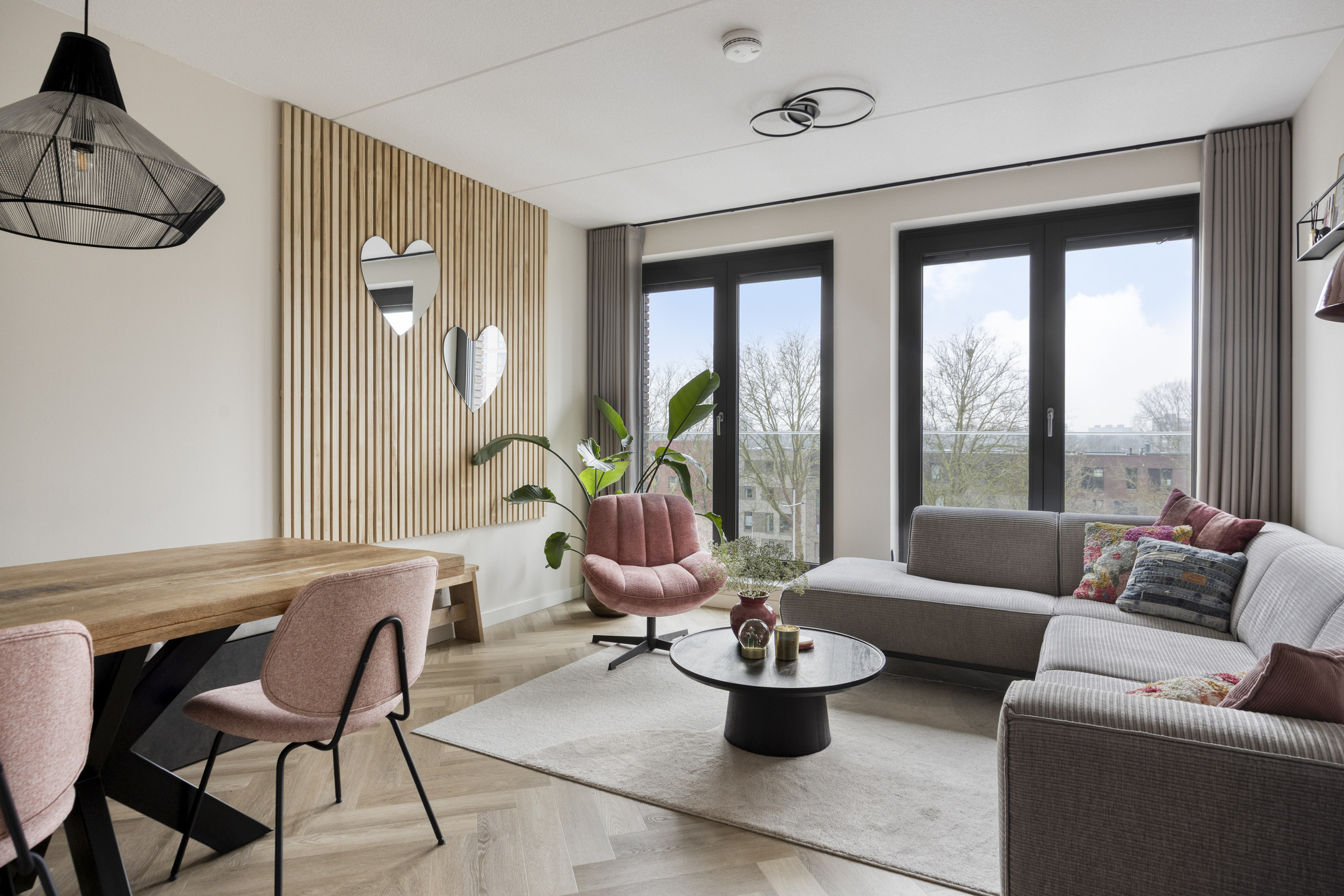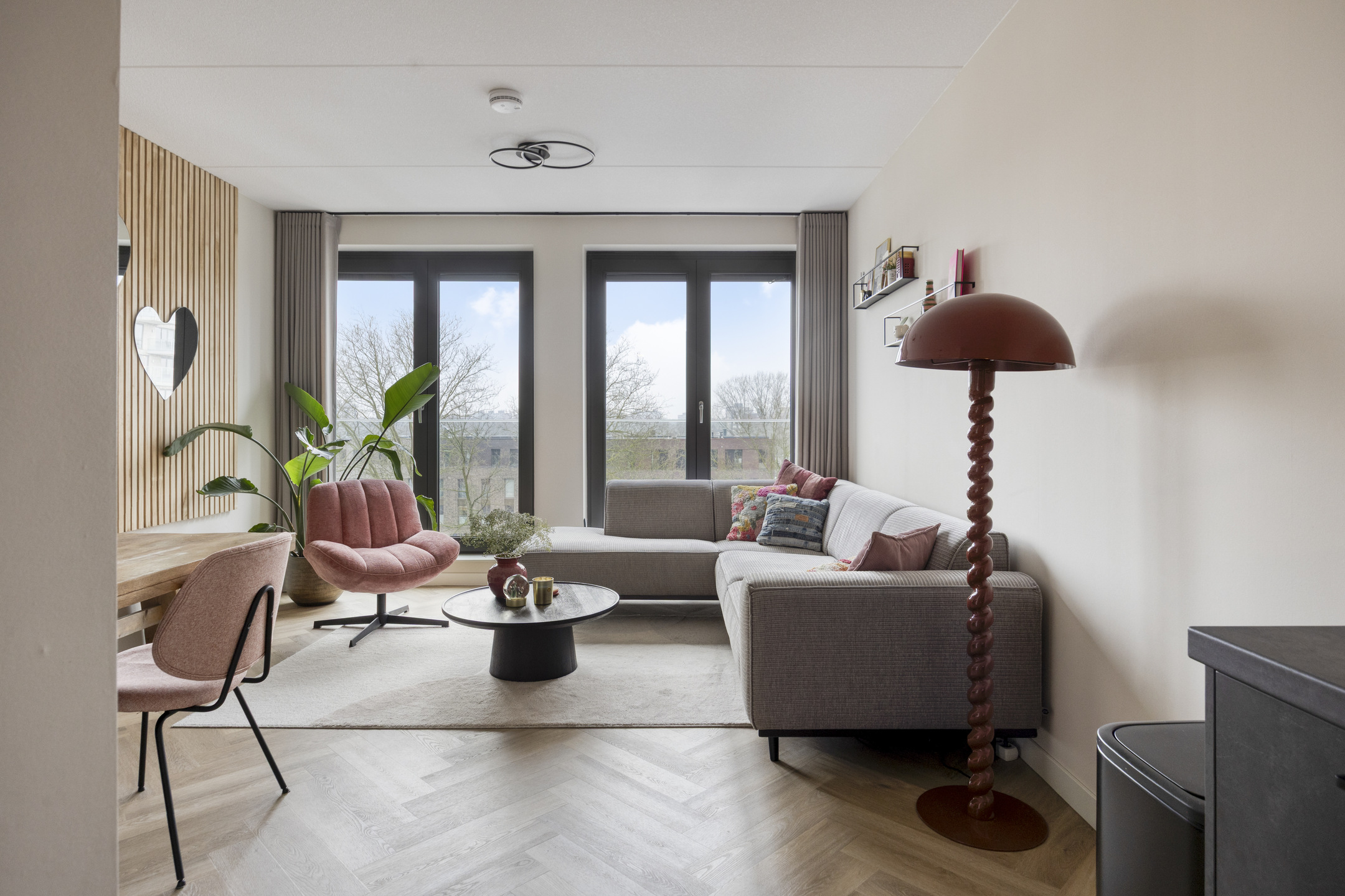 Zodra je het appartement binnenstapt, voel je het meteen: dit is een plek om thuis te komen. Vanuit de lichte woonkamer met dubbele openslaande deuren naar het Franse balkon heb je vrij uitzicht over de wijk. De moderne afwerking met houten lattenframe tegen de wand geeft het geheel een warme uitstraling.