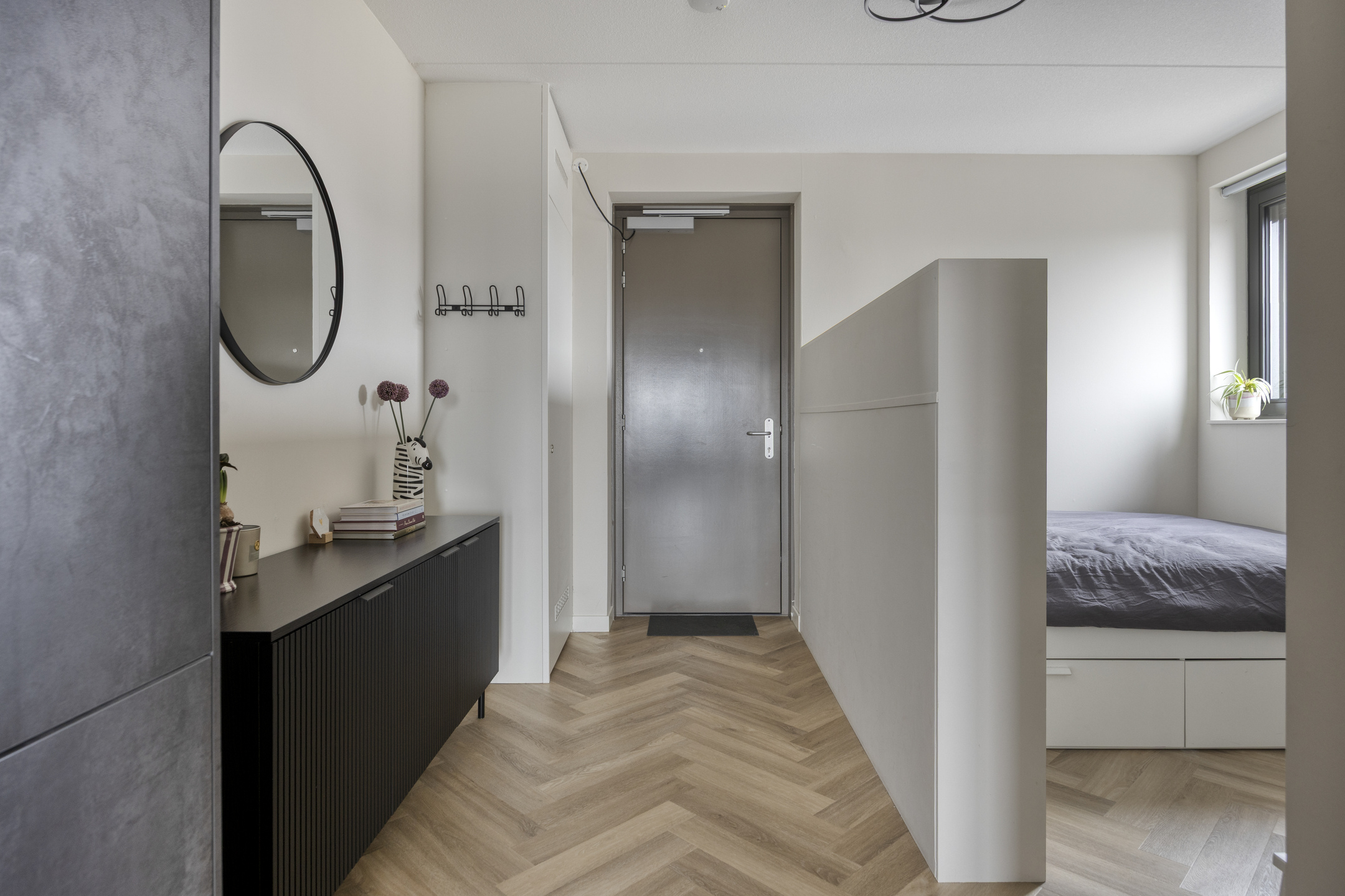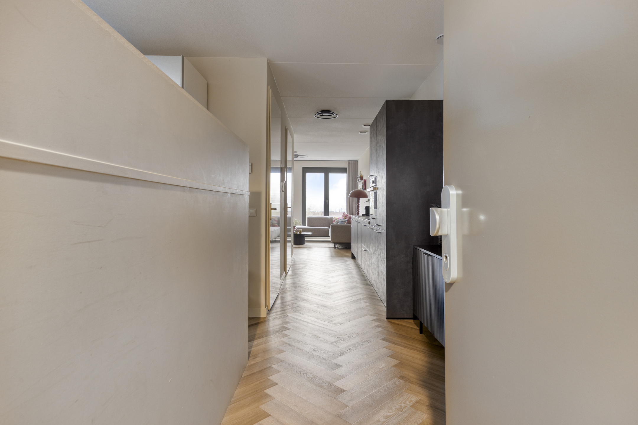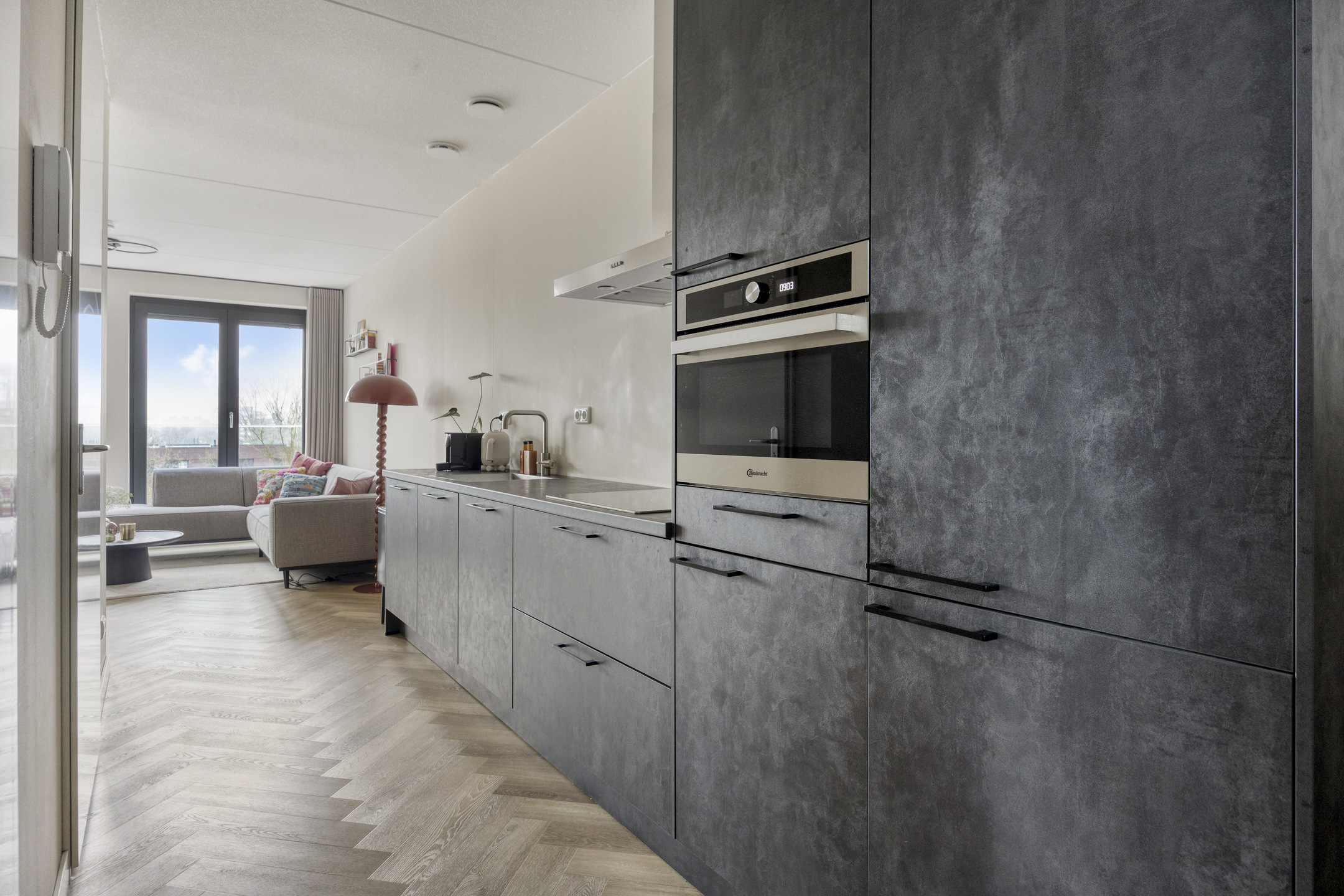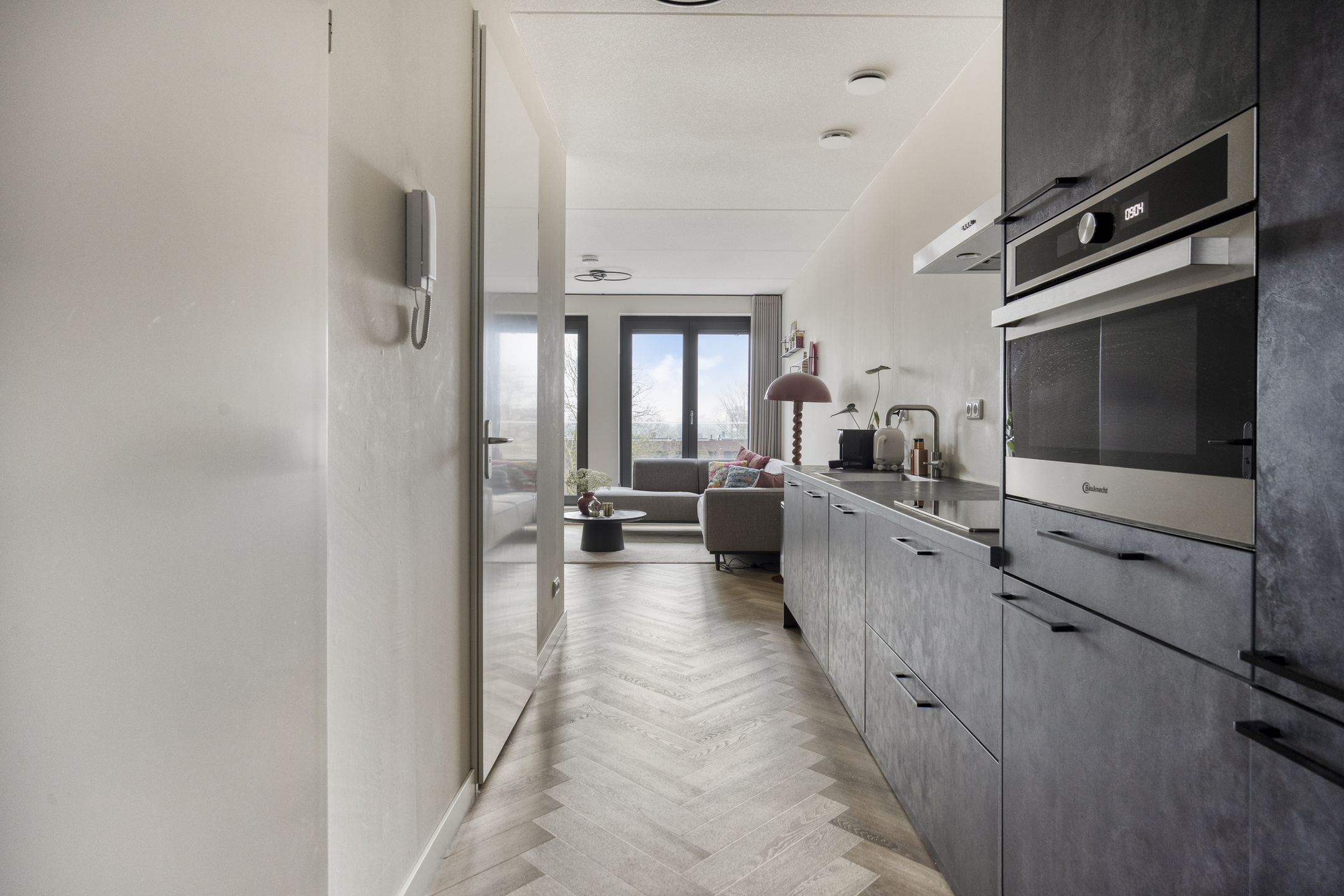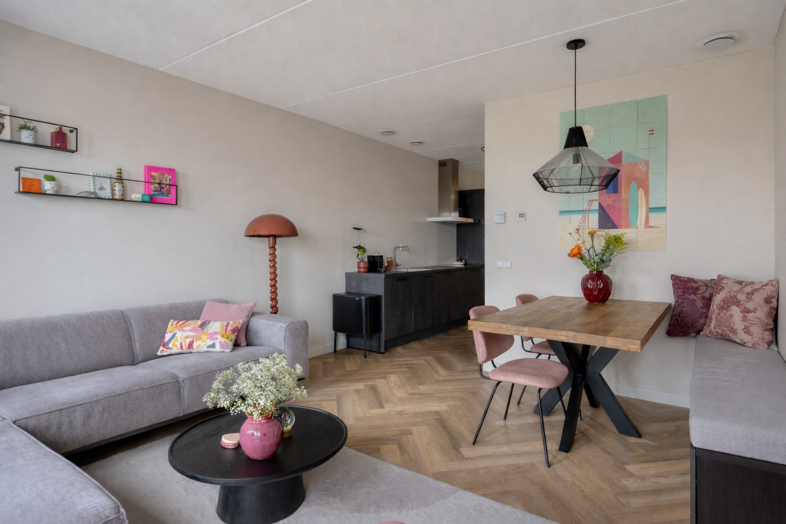 Zodra je het appartement binnenstapt, voel je het meteen: dit is een plek om thuis te komen. Vanuit de lichte woonkamer met dubbele openslaande deuren naar het Franse balkon heb je vrij uitzicht over de wijk. De moderne afwerking met houten lattenframe tegen de wand geeft het geheel een warme uitstraling.