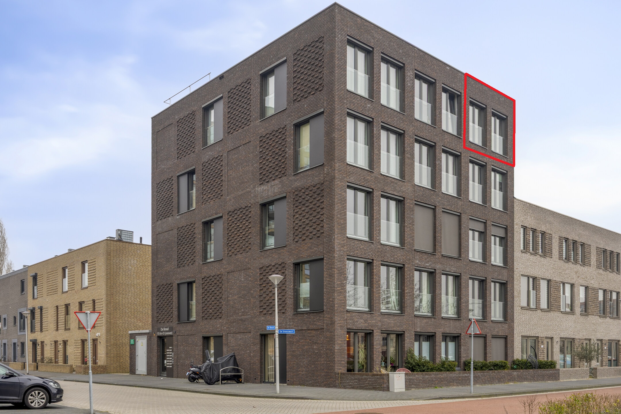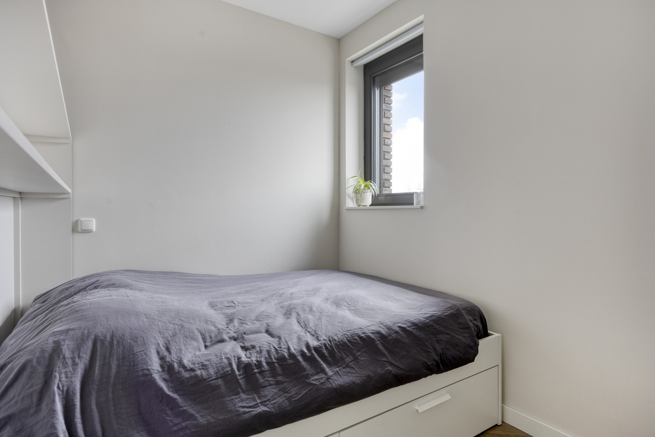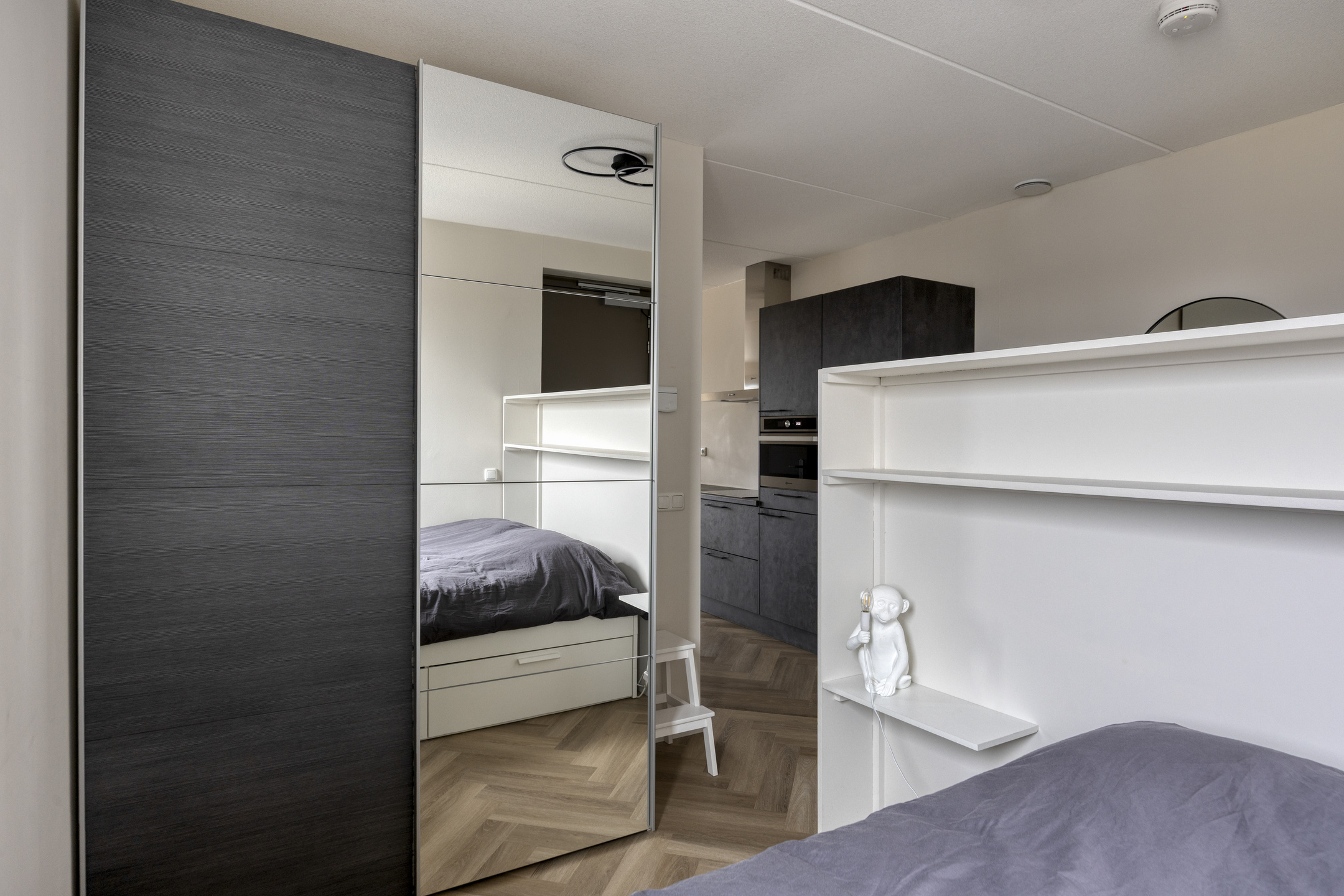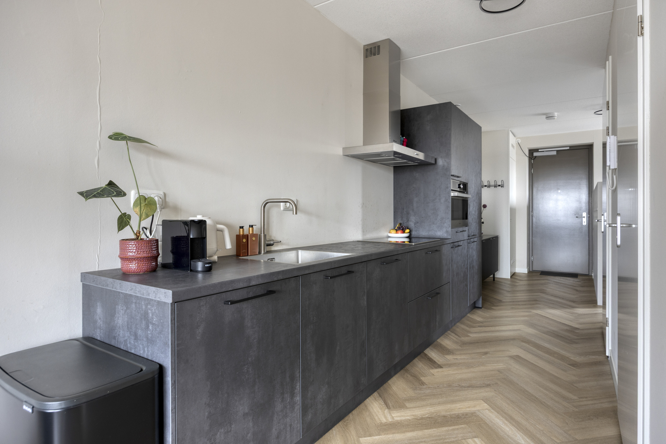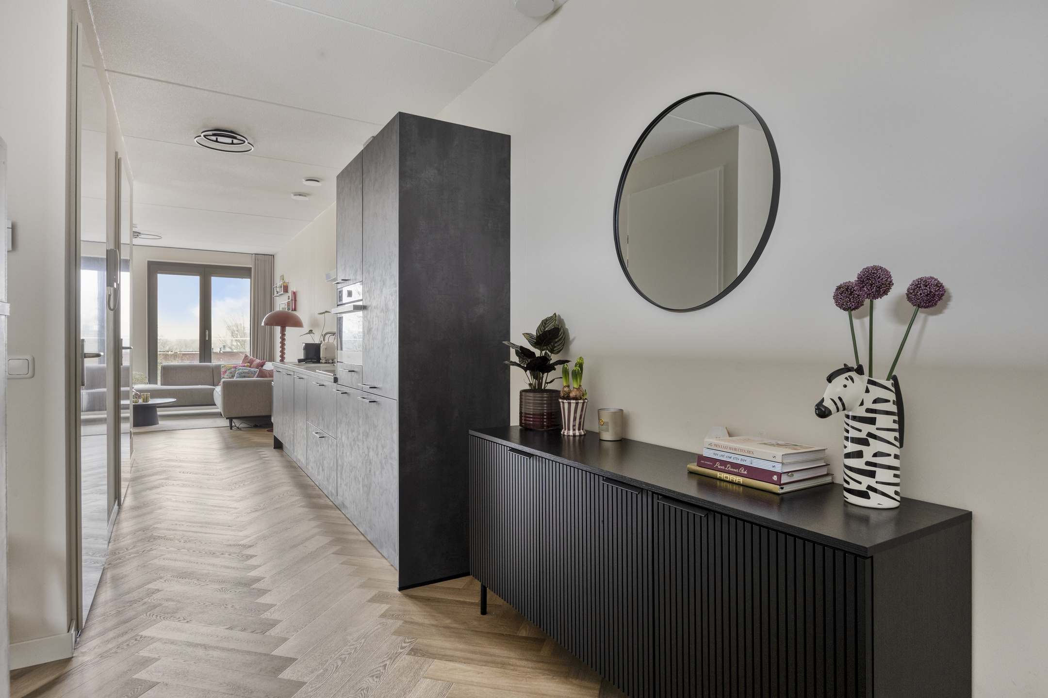 Zodra je het appartement binnenstapt, voel je het meteen: dit is een plek om thuis te komen. Vanuit de lichte woonkamer met dubbele openslaande deuren naar het Franse balkon heb je vrij uitzicht over de wijk. De moderne afwerking met houten lattenframe tegen de wand geeft het geheel een warme uitstraling.