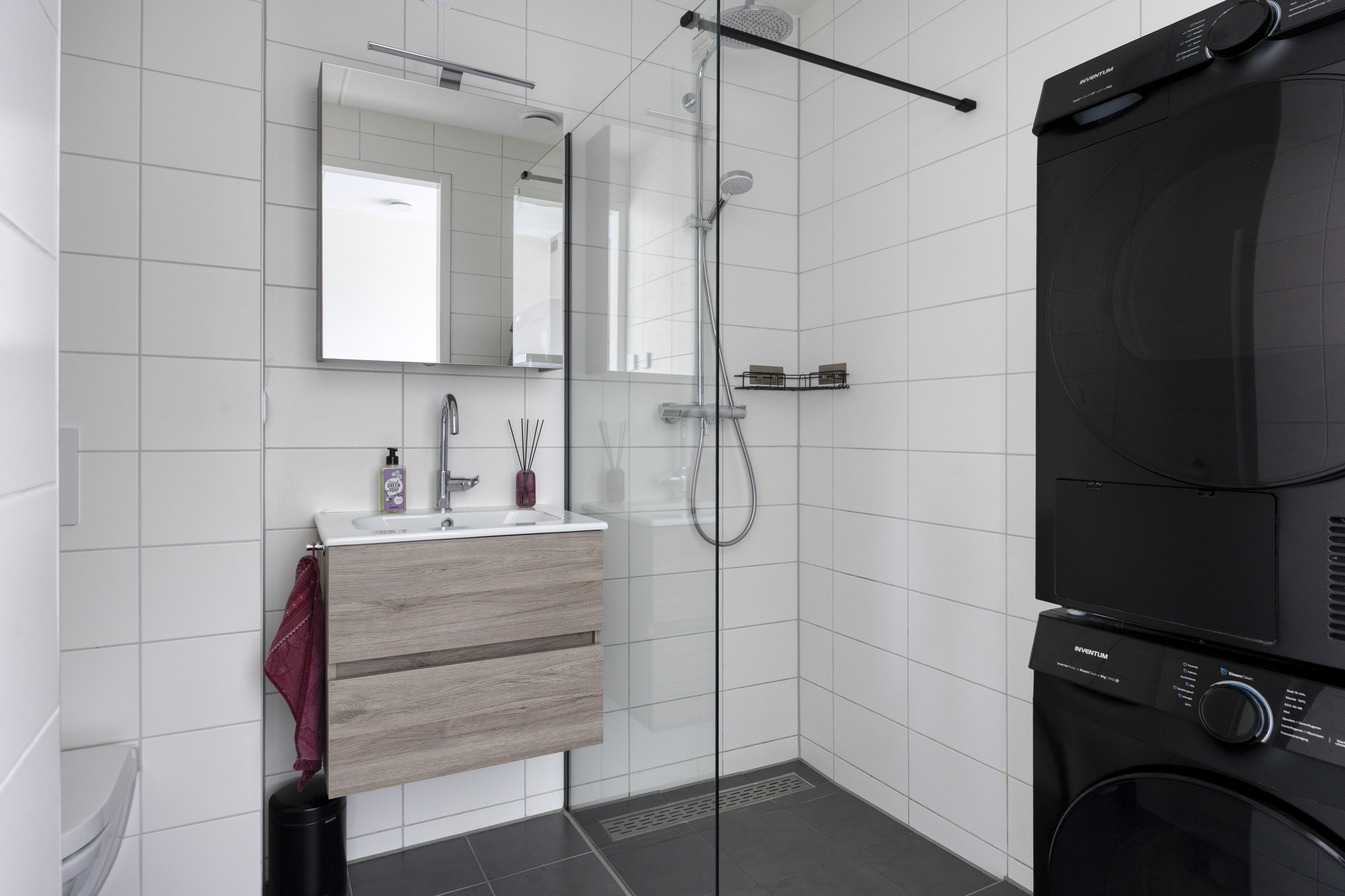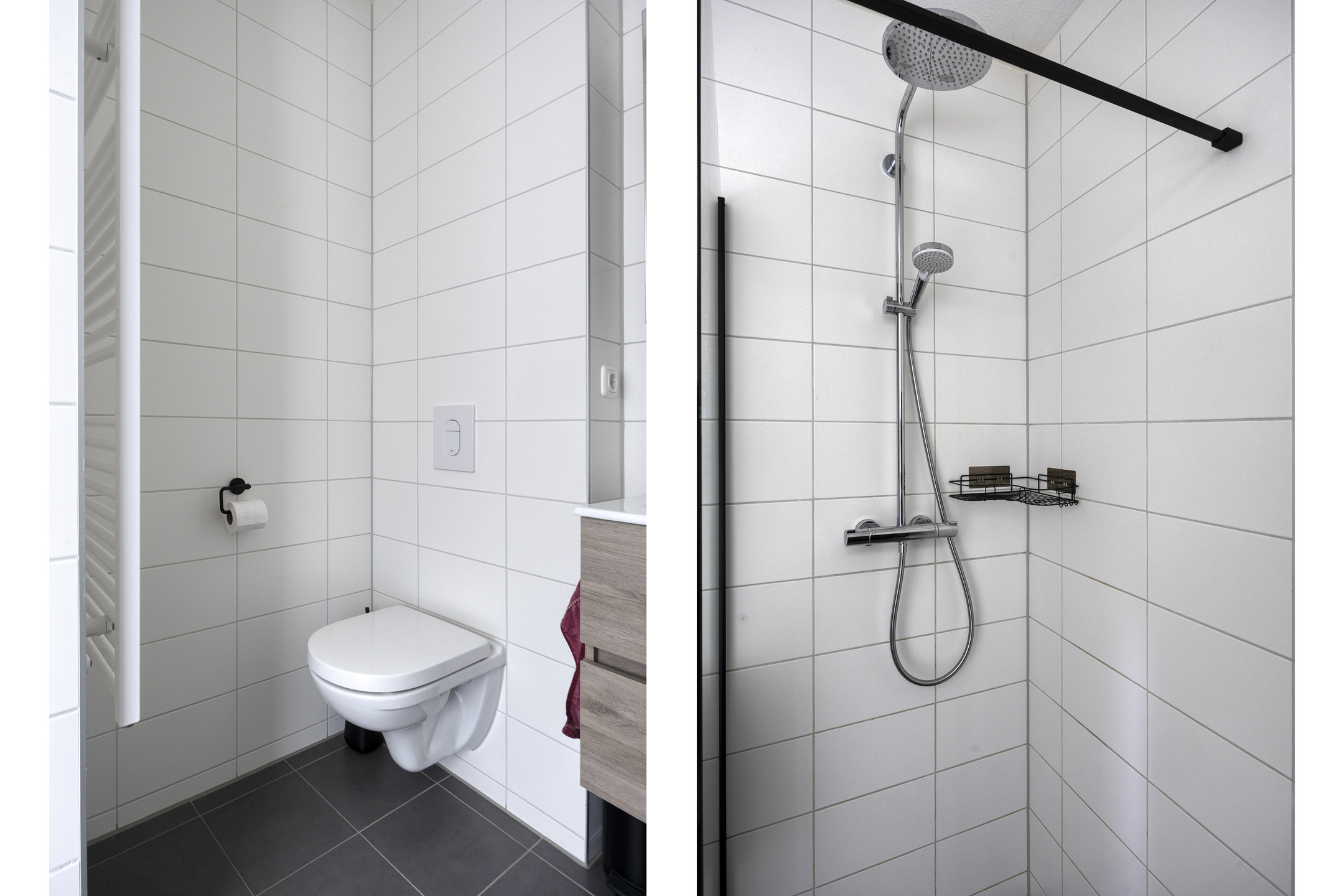 De badkamer is compleet met inloopdouche, wastafelmeubel, toilet én plek voor de wasmachine. Alles in huis voor een modern en comfortabel dagelijks leven.