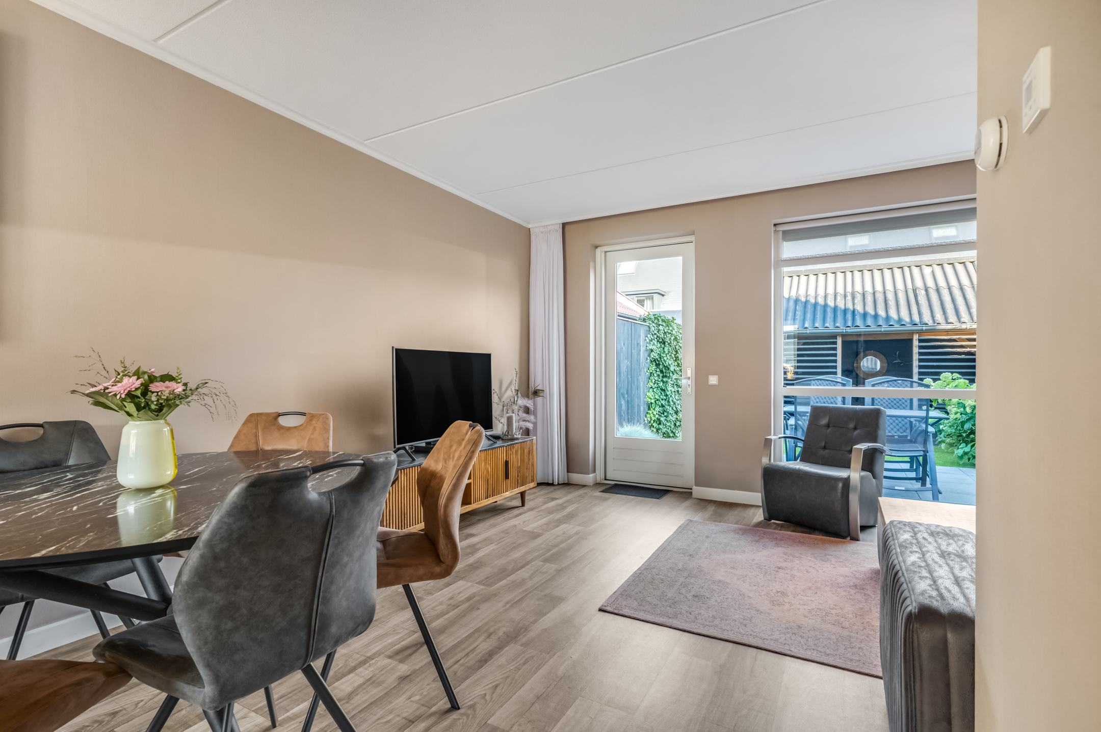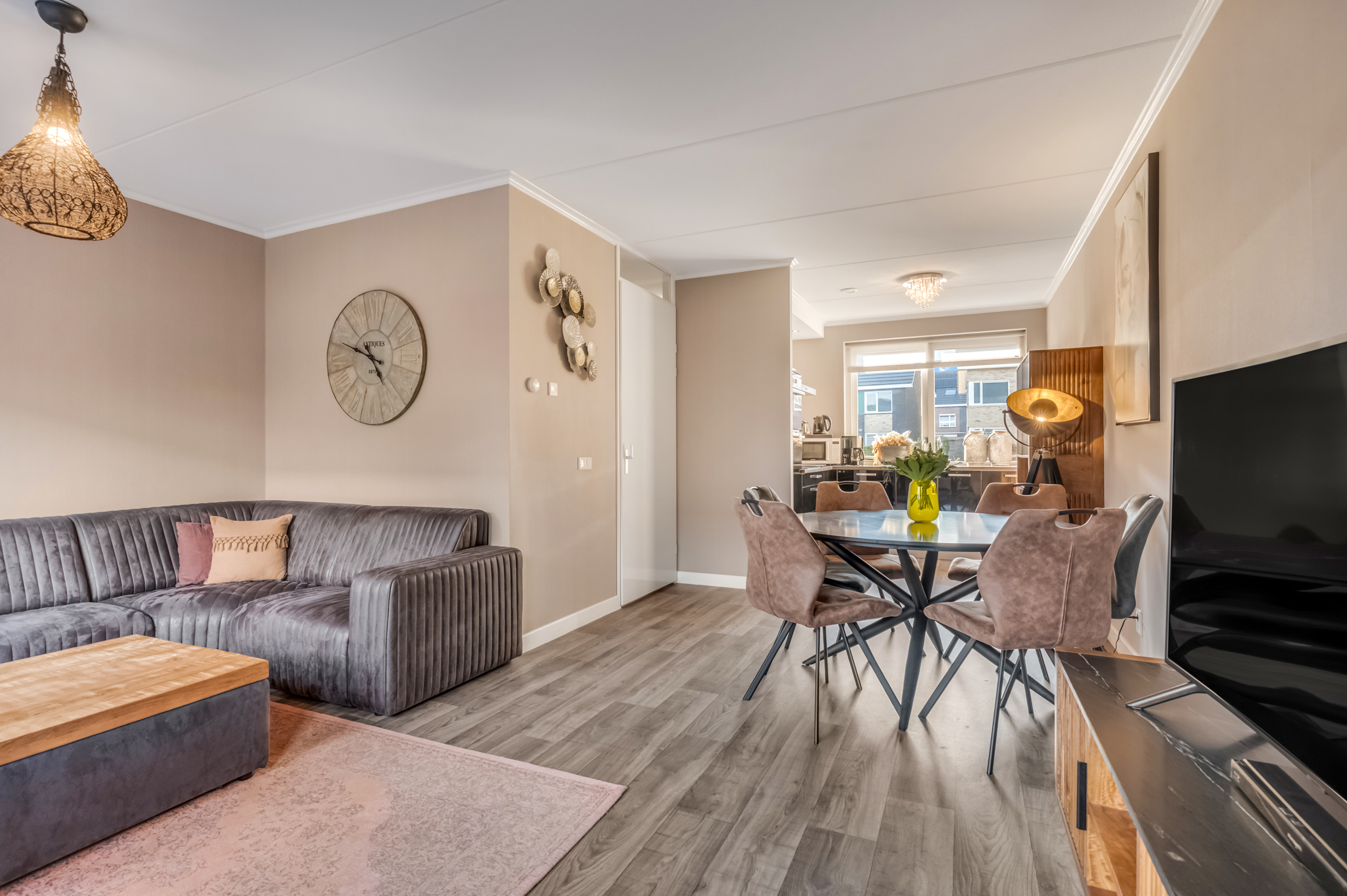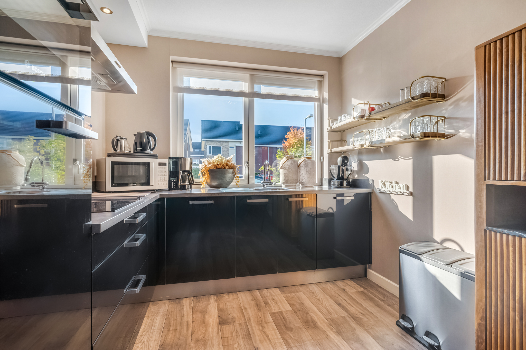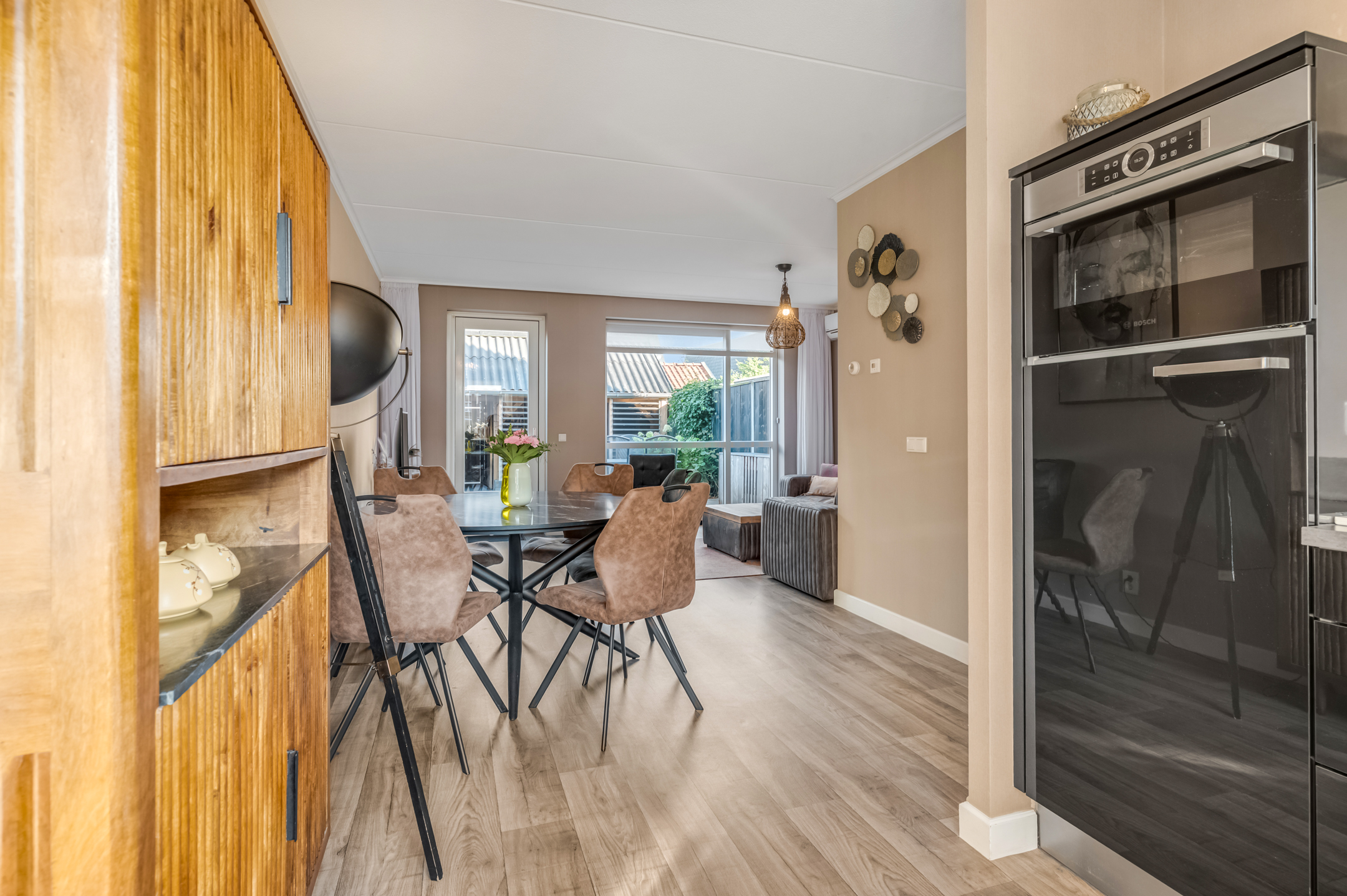 De hal geeft toegang tot het toilet en leidt naar de tuingerichte woonkamer, waar grote raampartijen zorgen voor veel natuurlijk licht. De strakke wandafwerking, de lichte vloer en de open indeling creëren een aangename leefruimte. Aan de voorzijde bevindt zich de stijlvolle hoekkeuken met uitzicht op de straat. Deze keuken is voorzien van diverse inbouwapparatuur en biedt alle ruimte voor kookliefhebbers.