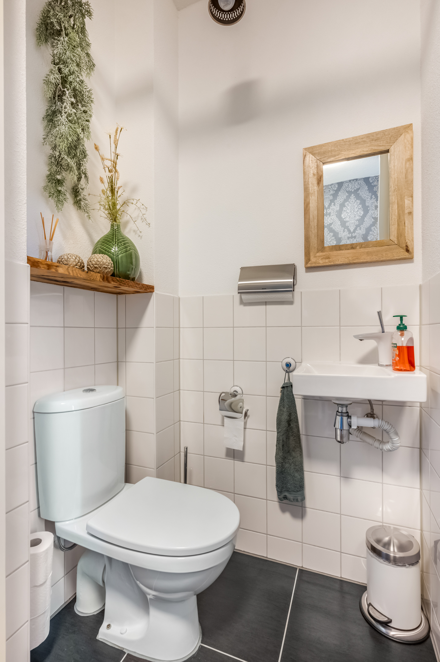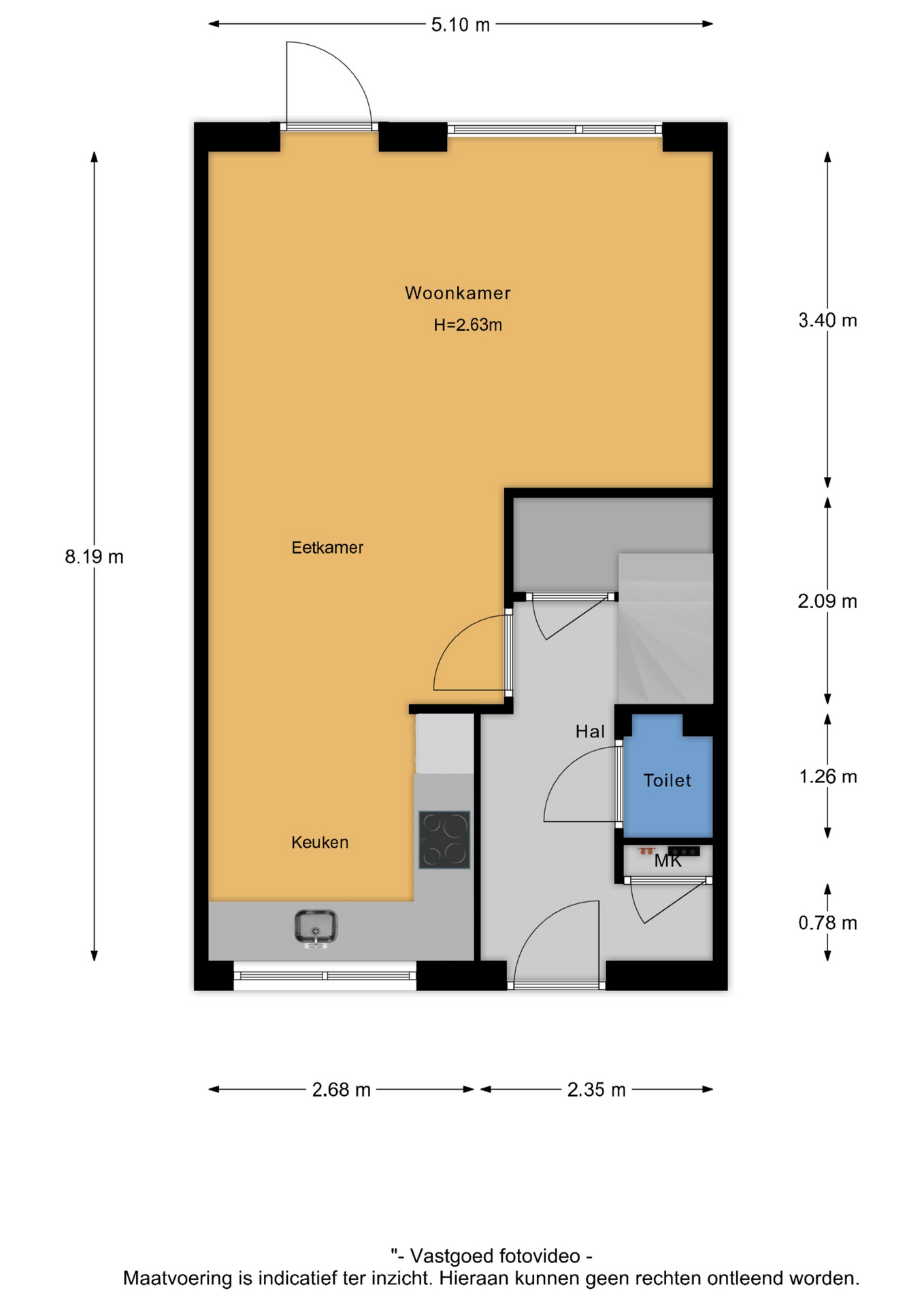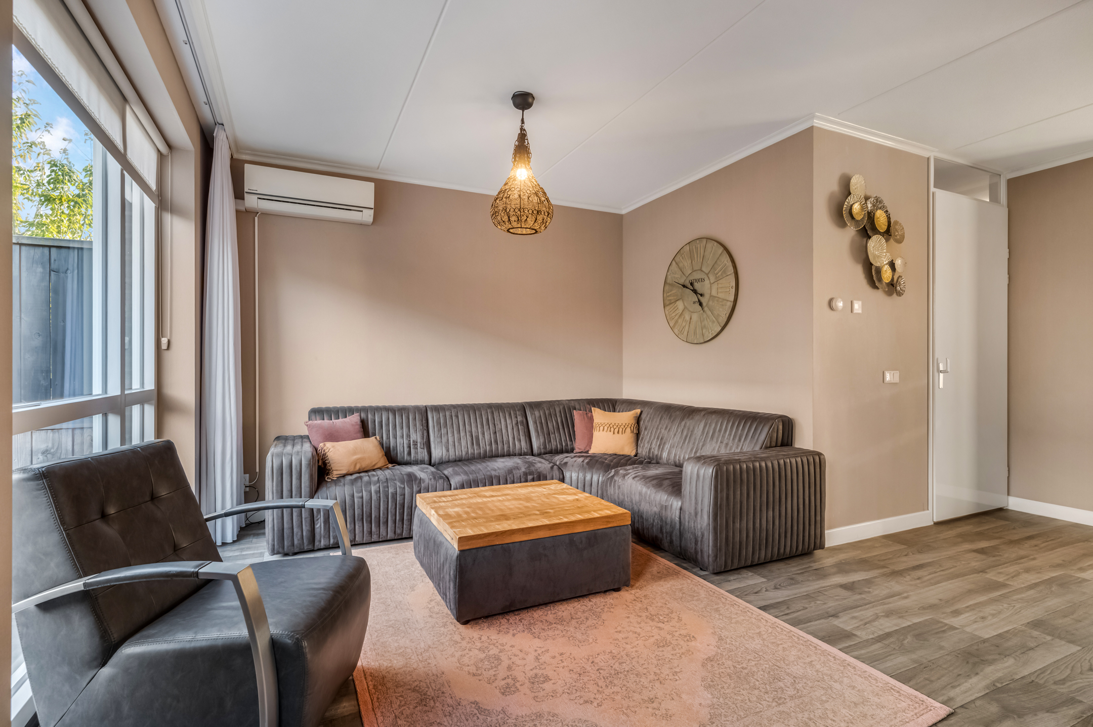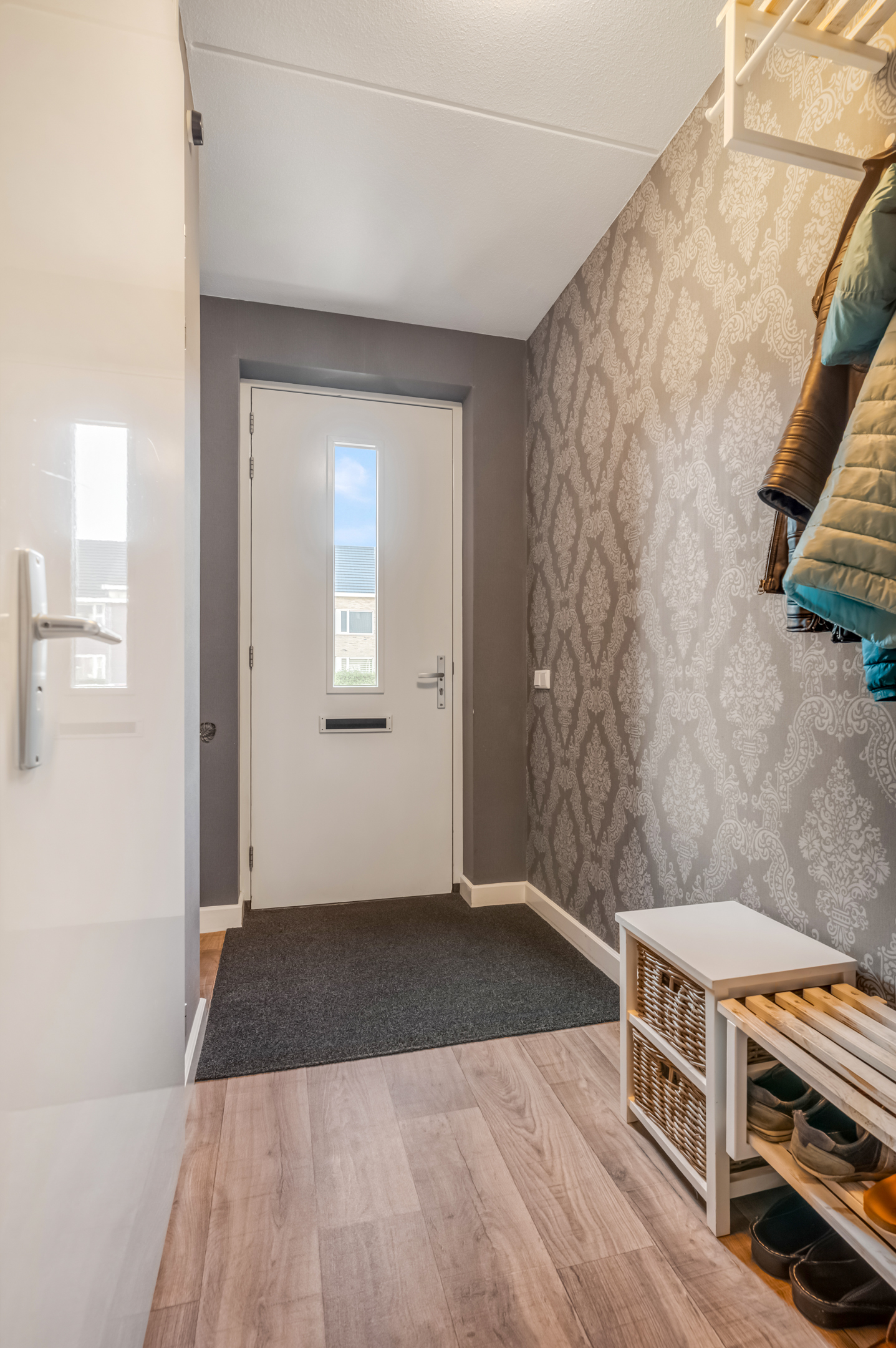De hal geeft toegang tot het toilet en leidt naar de tuingerichte woonkamer, waar grote raampartijen zorgen voor veel natuurlijk licht. De strakke wandafwerking, de lichte vloer en de open indeling creëren een aangename leefruimte. Aan de voorzijde bevindt zich de stijlvolle hoekkeuken met uitzicht op de straat. Deze keuken is voorzien van diverse inbouwapparatuur en biedt alle ruimte voor kookliefhebbers.