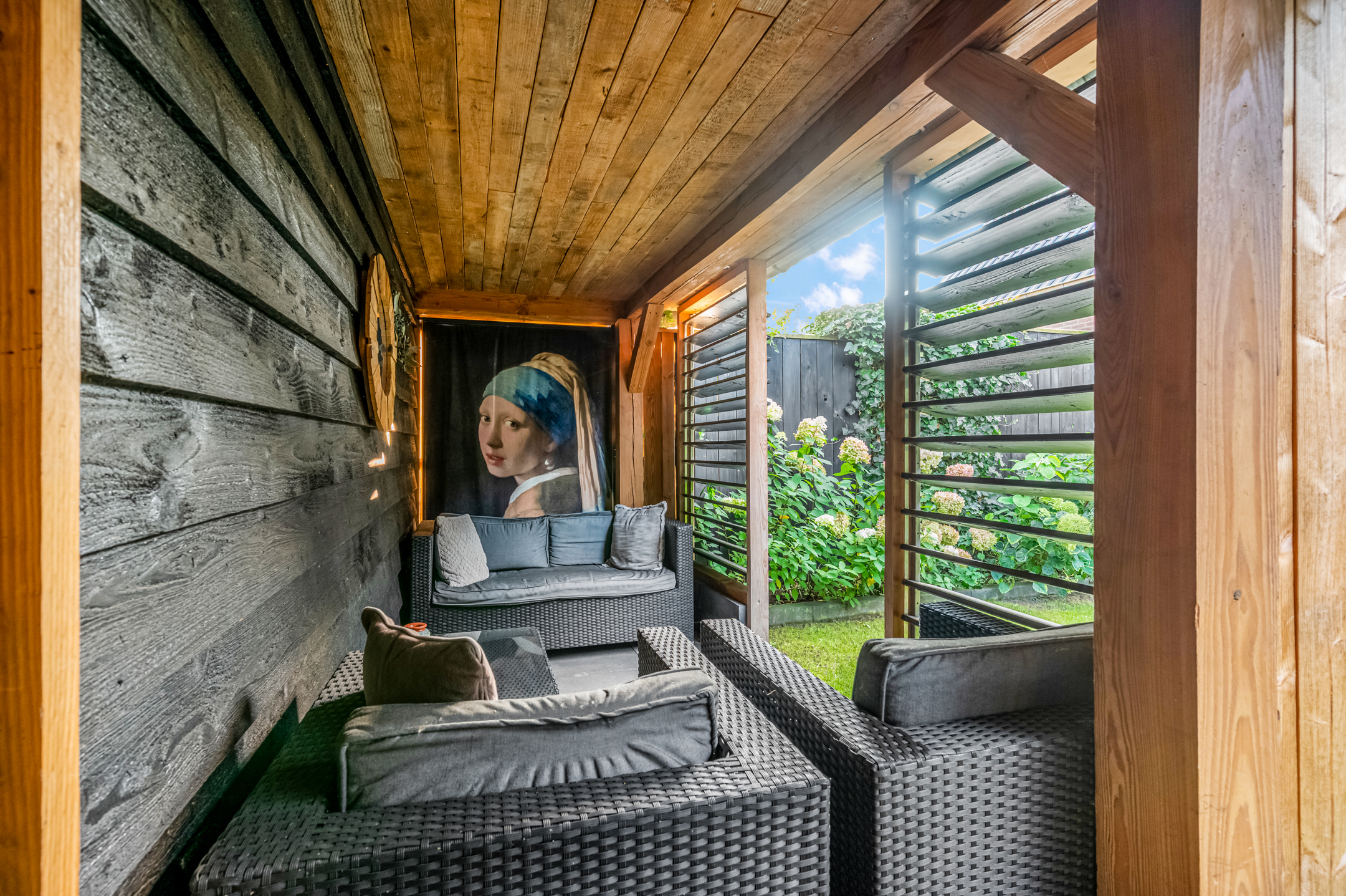 De fraai aangelegde achtertuin is onderhoudsvriendelijk en sfeervol. Achterin de tuin staat een robuuste houten veranda met berging, en ideale plek om het hele jaar door buiten te zitten of spullen op te bergen. De tuin is bereikbaar via een achterom.
