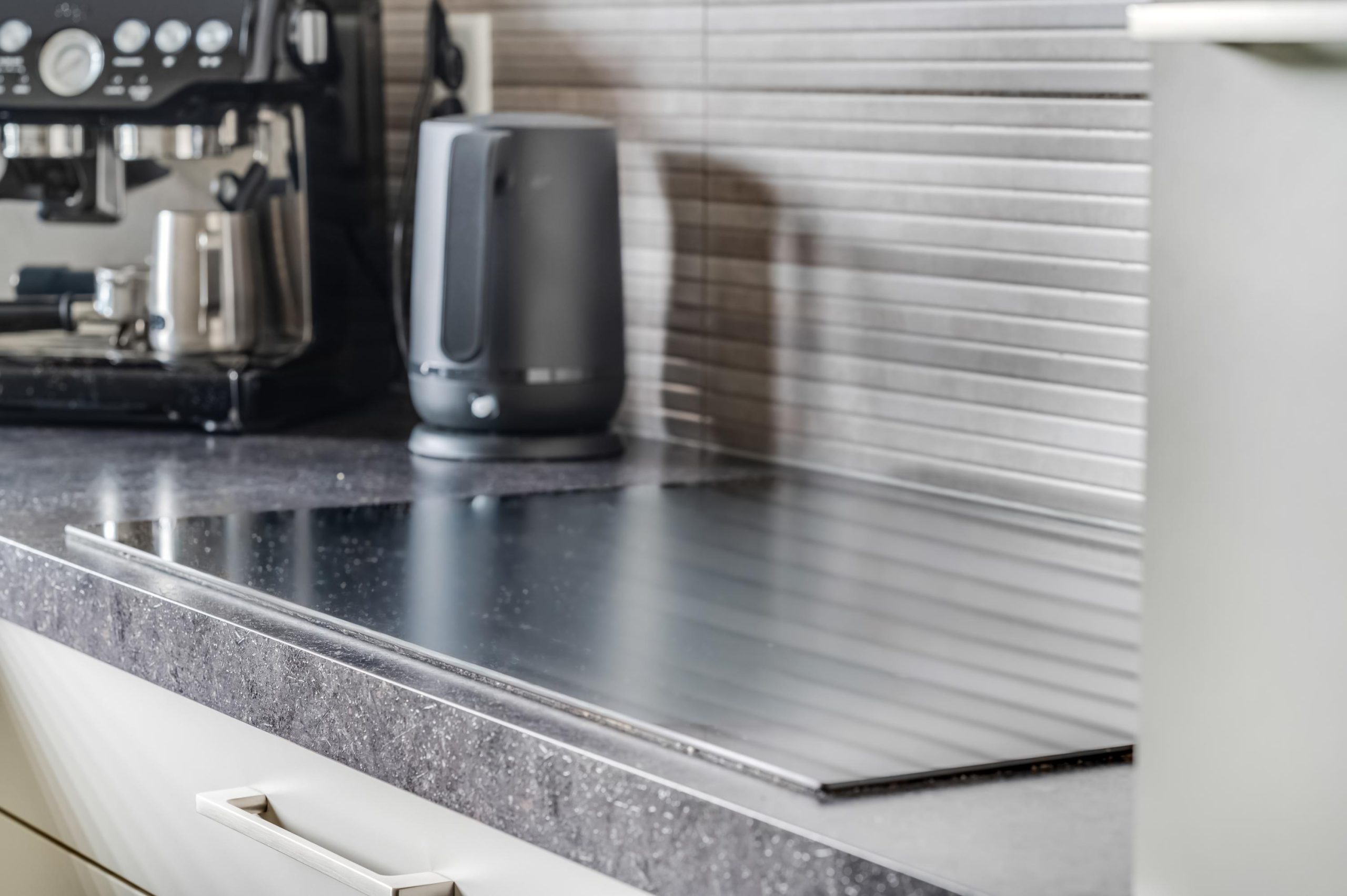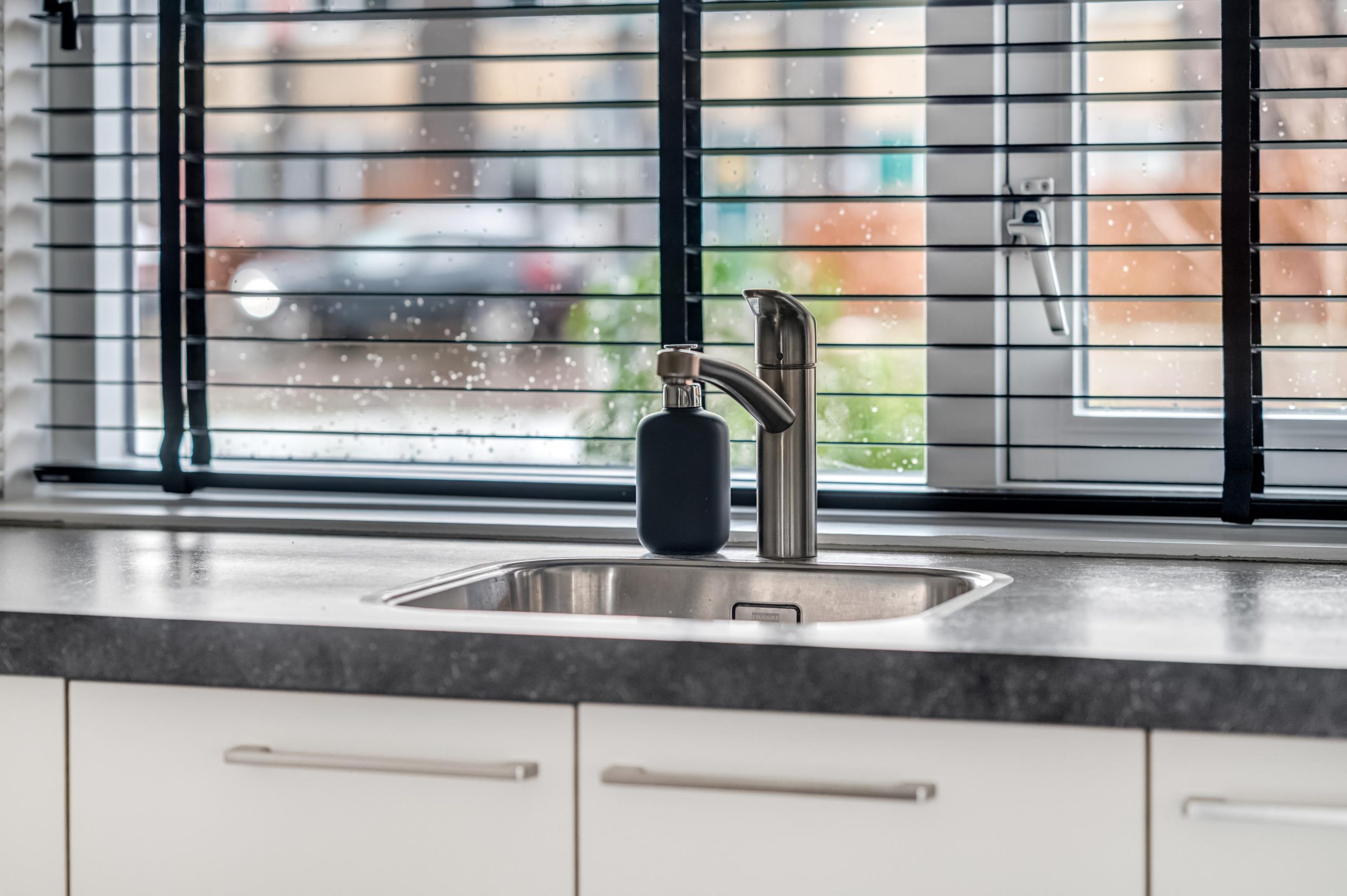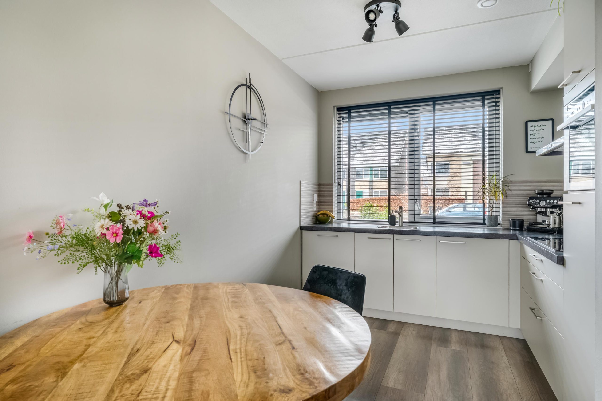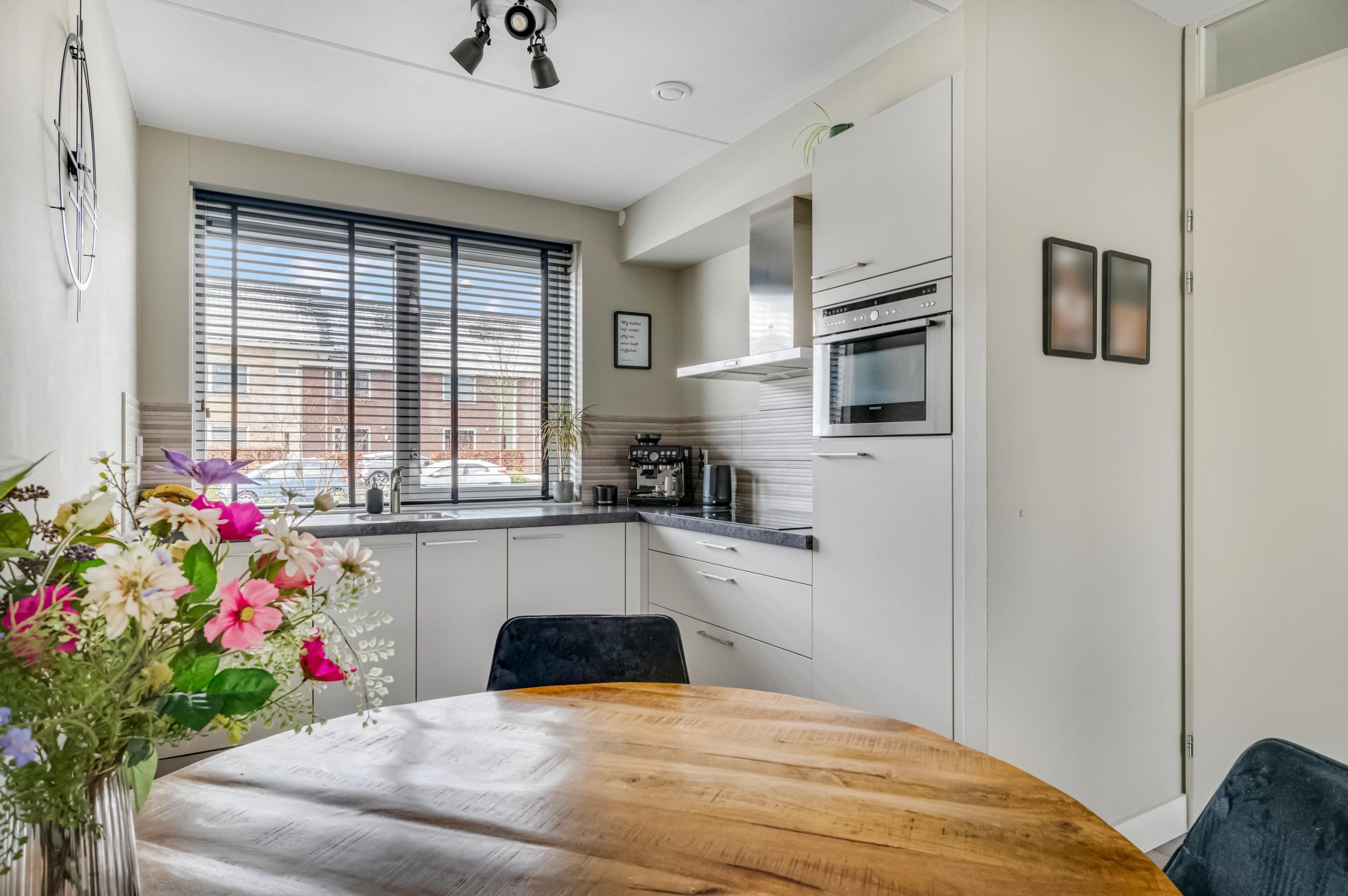 De keuken aan de voorzijde van de woning is uitgevoerd in een lichte kleurstelling en voorzien van een vijfpits gaskookplaat, afzuigkap, combi-oven/combimagnetron, koelkast en vaatwasmachine. Terwijl je kookt, geniet je van het uitzicht op de levendige straat.