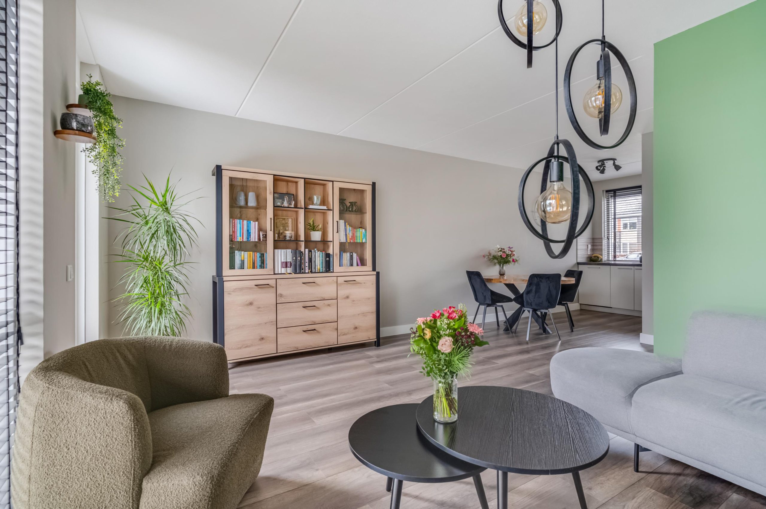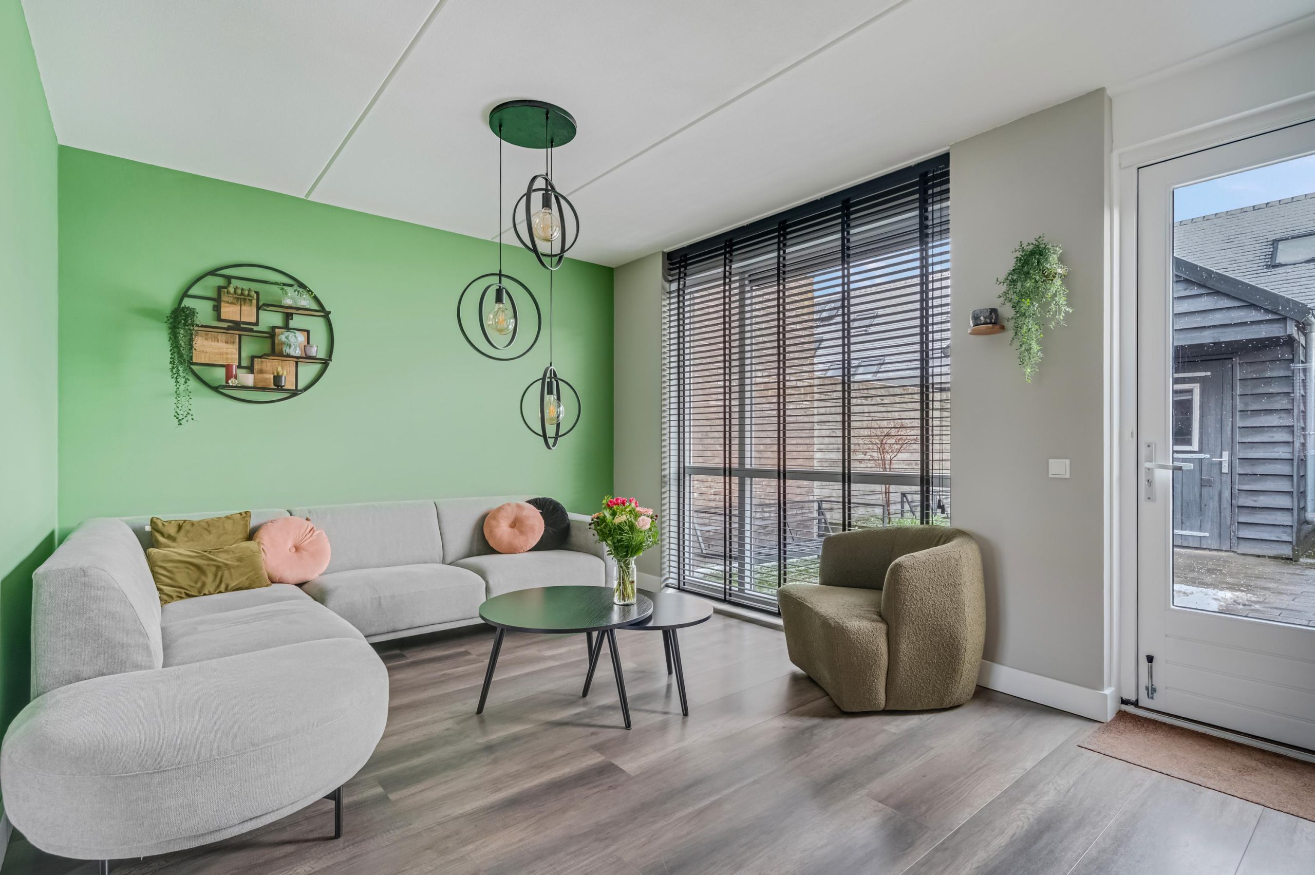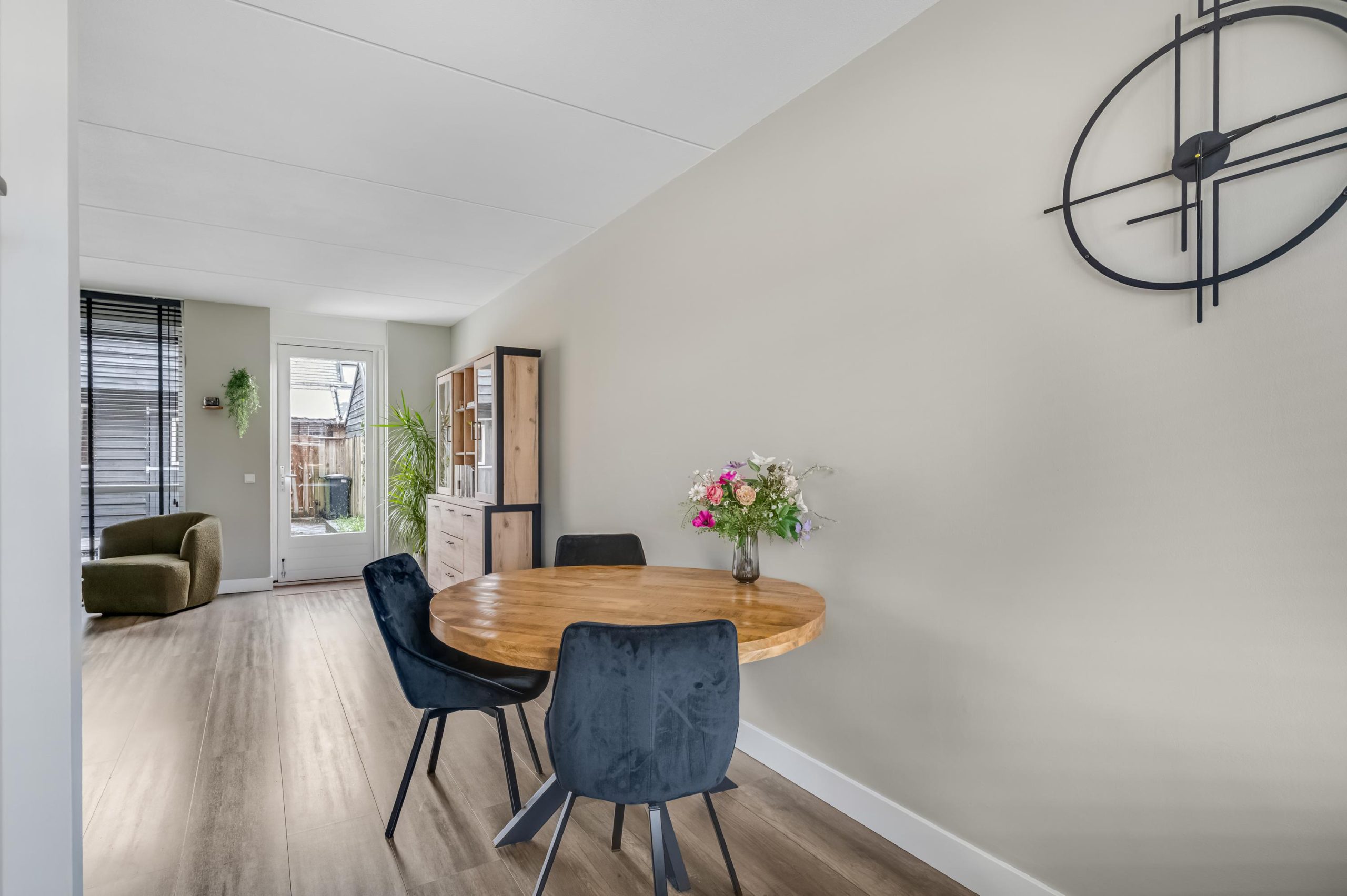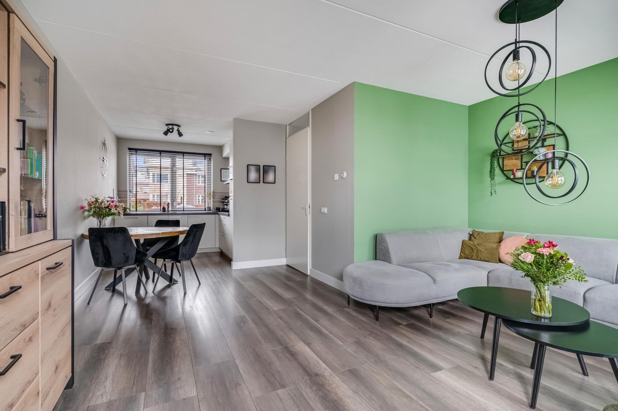 Via de verzorgde voortuin stap je binnen in een nette hal met moderne laminaatvloer en strak afgewerkte wanden. De woonkamer is een fijne, lichte leefruimte met grote raampartijen die zorgen voor veel daglicht en zicht op de achtertuin. De laminaatvloer loopt mooi door in de keuken, waardoor de benedenverdieping als een geheel voelt. De open indeling naar de keuken zorgt voor een prettige sfeer.