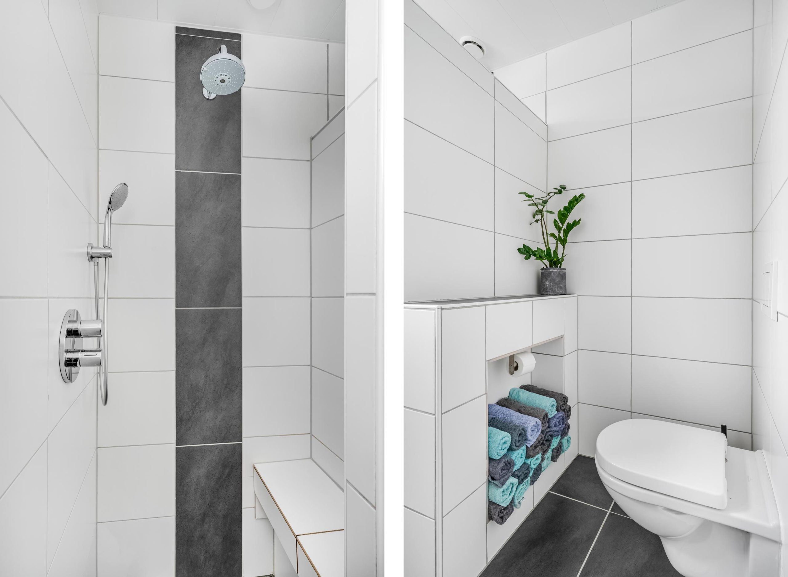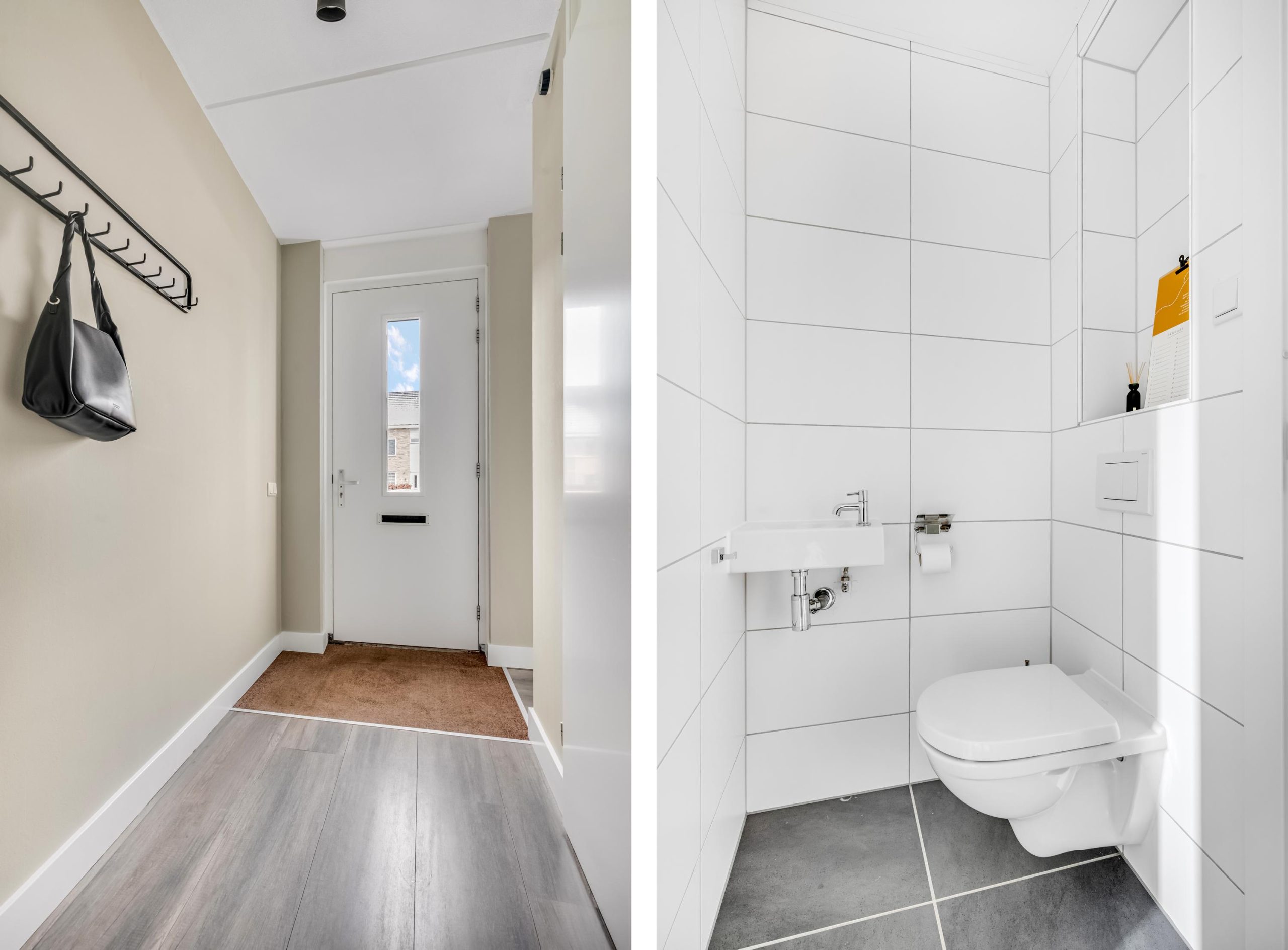 De toiletruimte is volledig betegeld en voorzien van een zwevend toilet en fonteintje.
