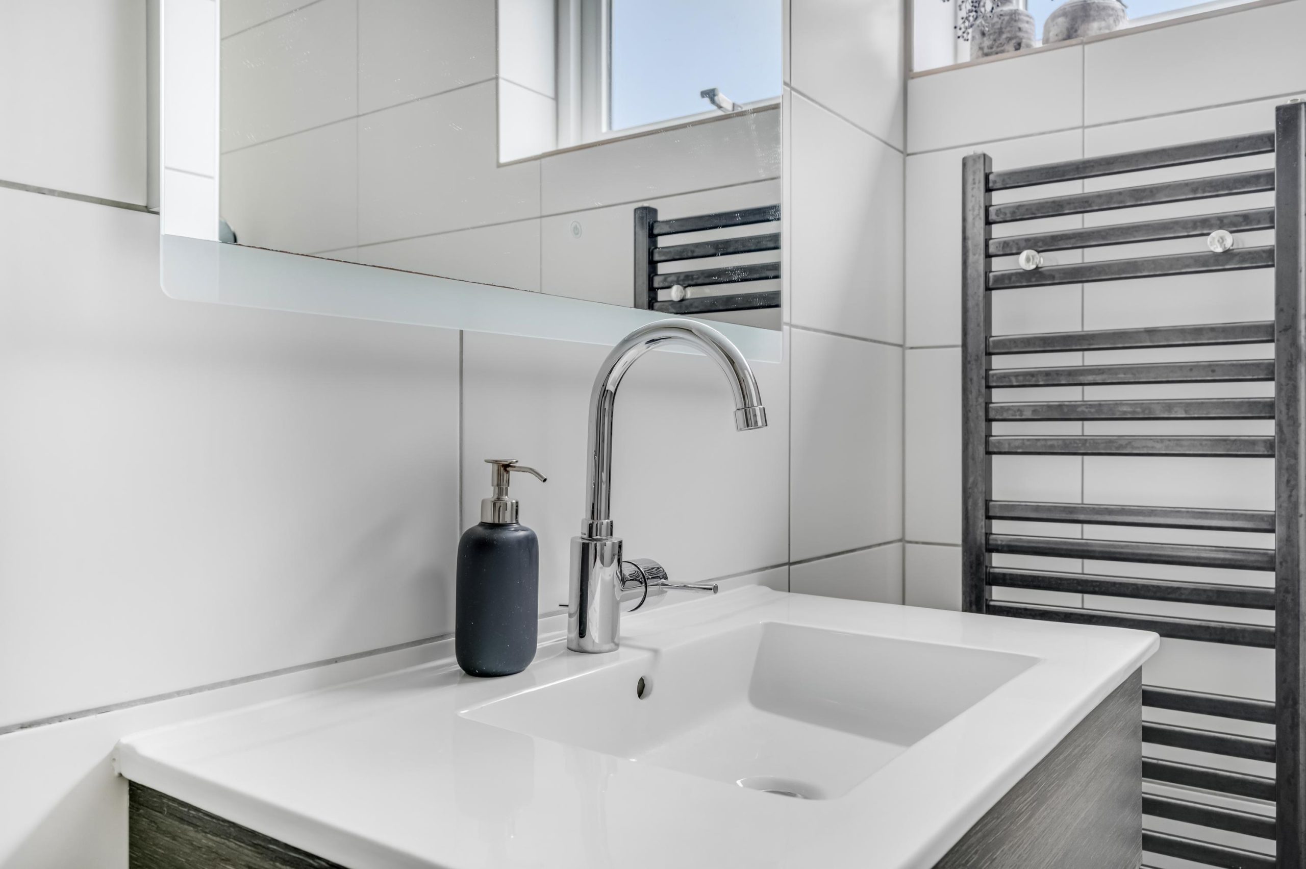De badkamer is geheel betegeld en beschikt over een ruime douche met regendouche, wastafelmeubel, designradiator en tweede toilet.