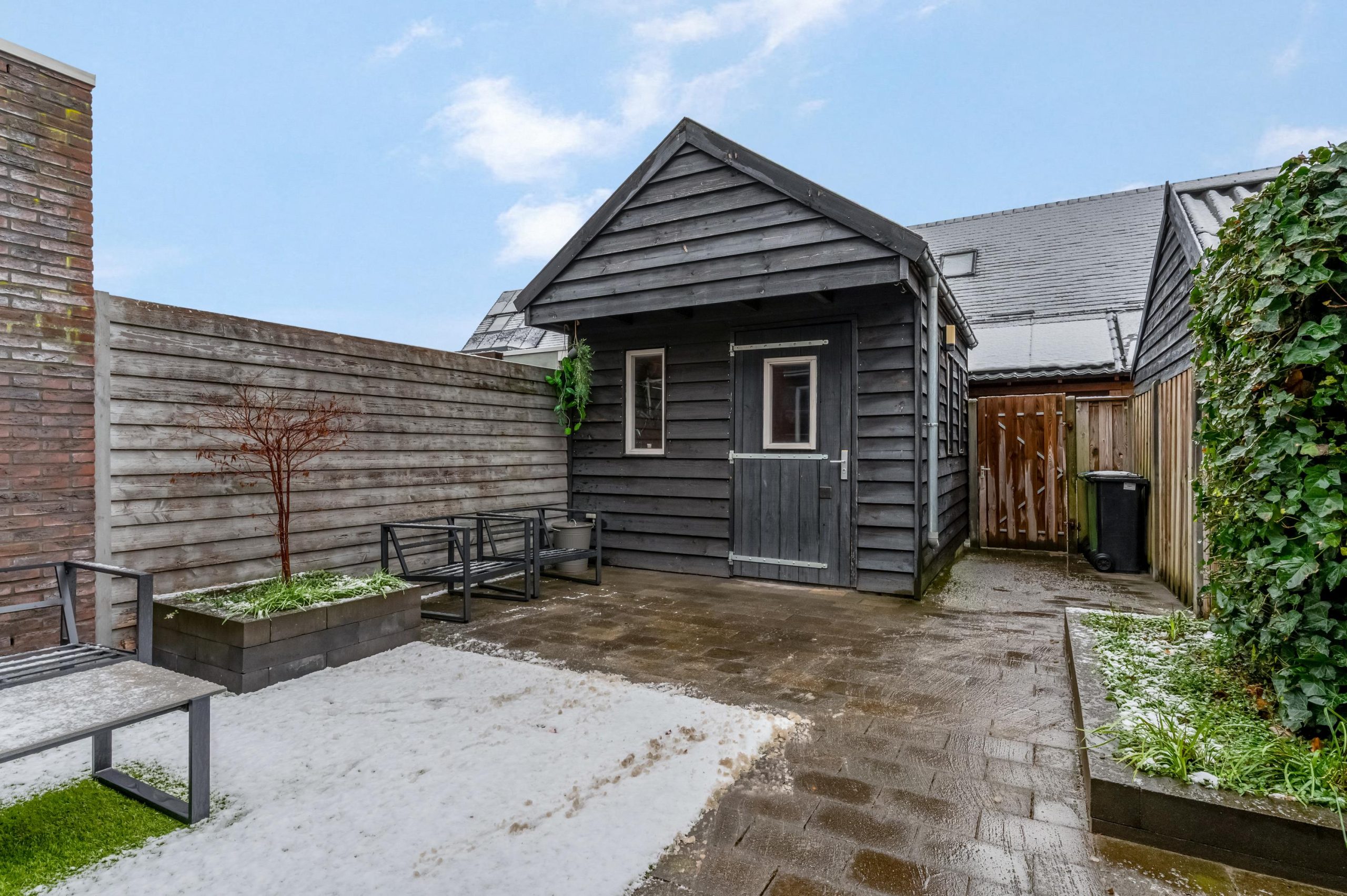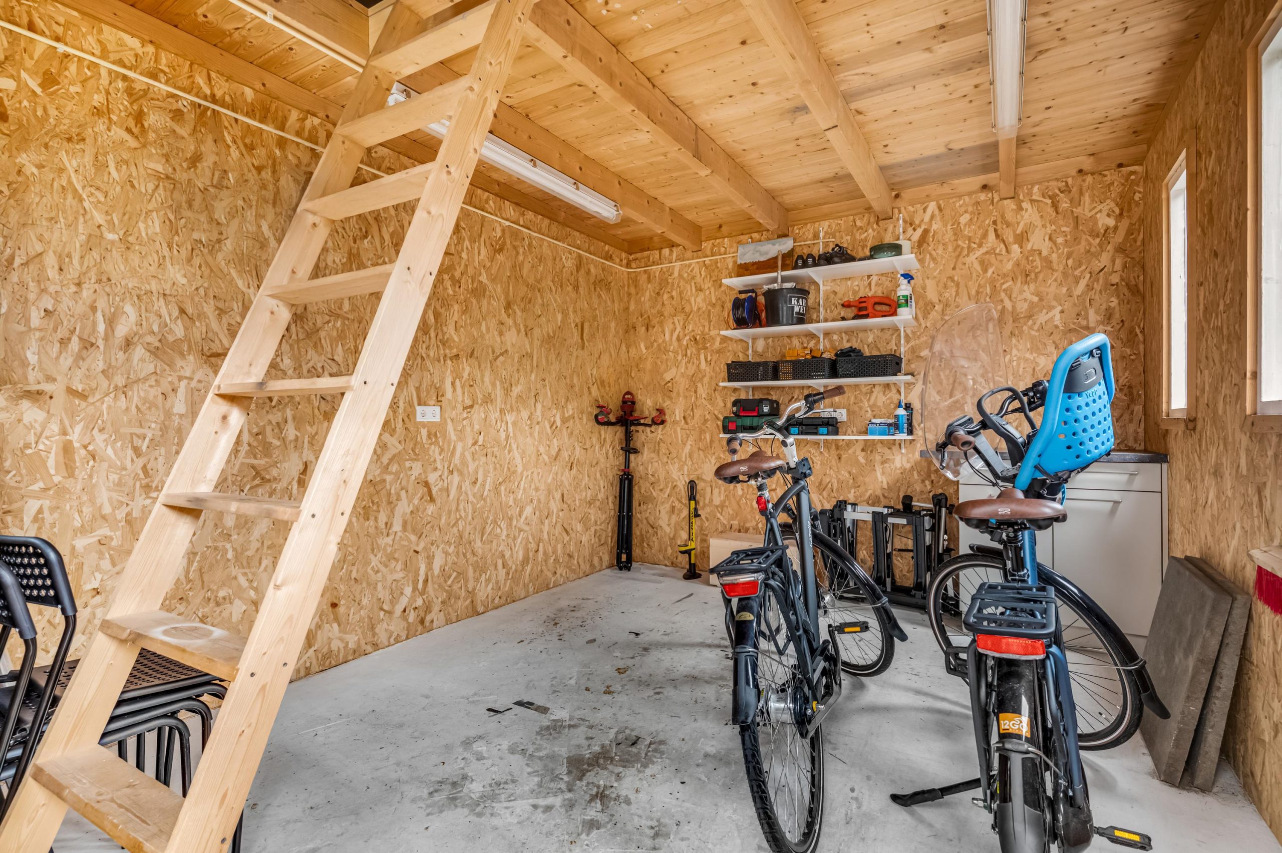 De achtertuin is netjes aangelegd met kunstgras en nette bestrating. Een fijne plek om te spelen of heerlijk te ontspannen. Achter in de tuin staat een houten berging met een extra verdieping.