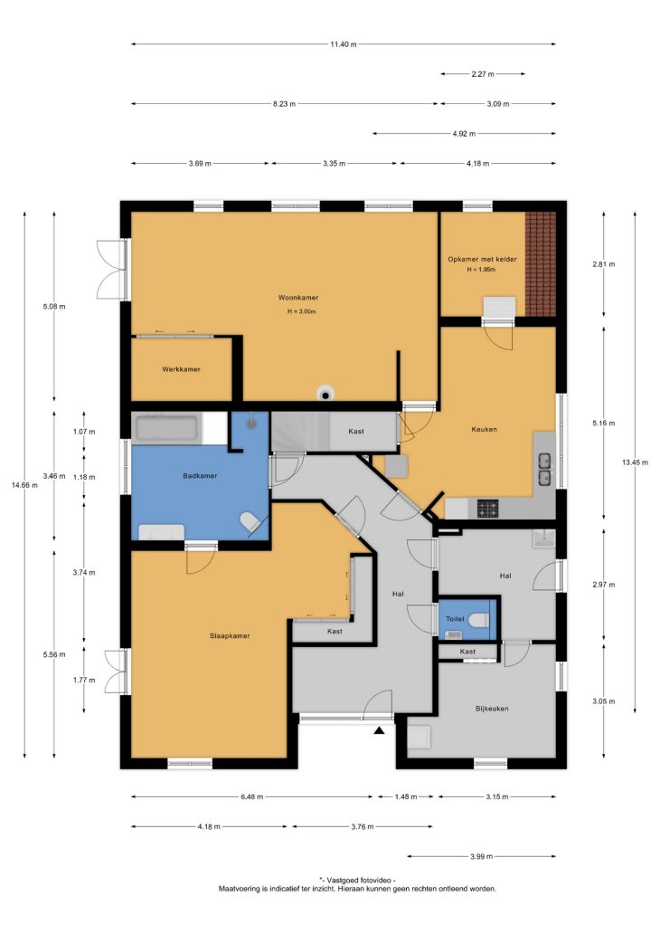De woonkeuken is voorzien van een keukenblok in hoekopstelling. Aangrenzend is er de opkamer, welke thans in gebruik is als kantoorruimte. Hieronder bevindt zich een provisiekelder. Via de keuken bereikt u de gezellige, ruime woonkamer aan de voorzijde van de woonboerderij. In de schouw is een houtkachel geplaatst en openslaande deuren geven toegang tot de tuin. De begane grond is nagenoeg geheel voorzien van vloerverwarming.