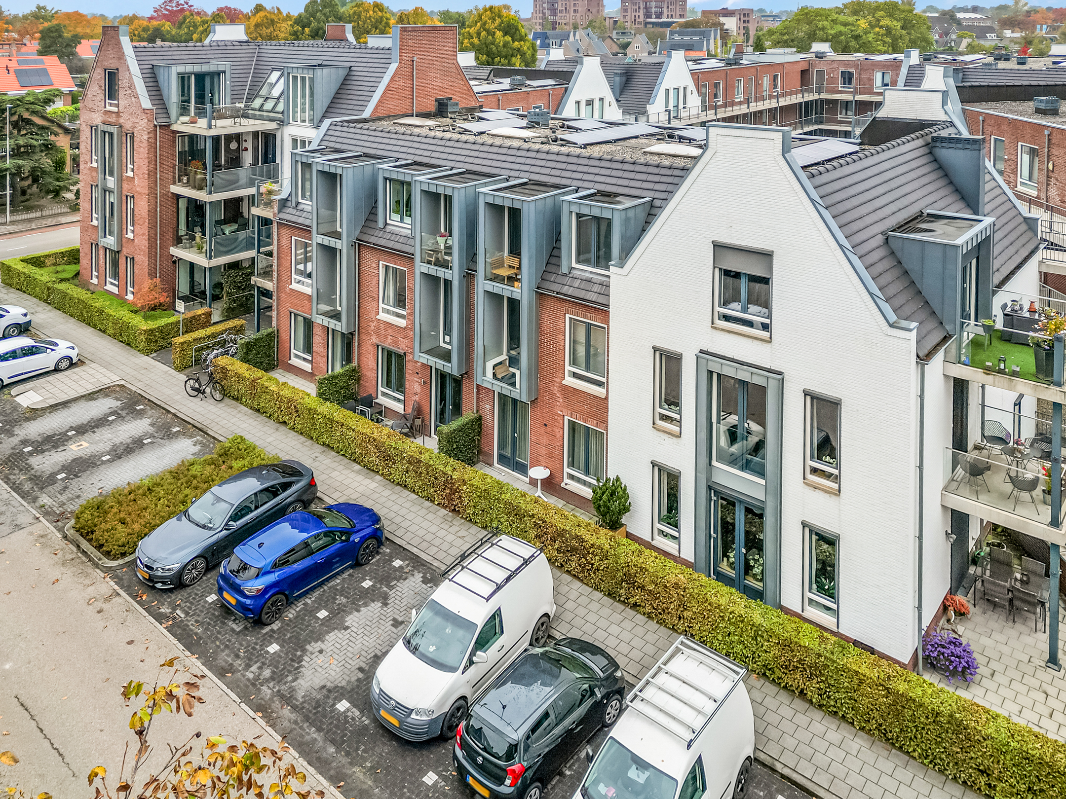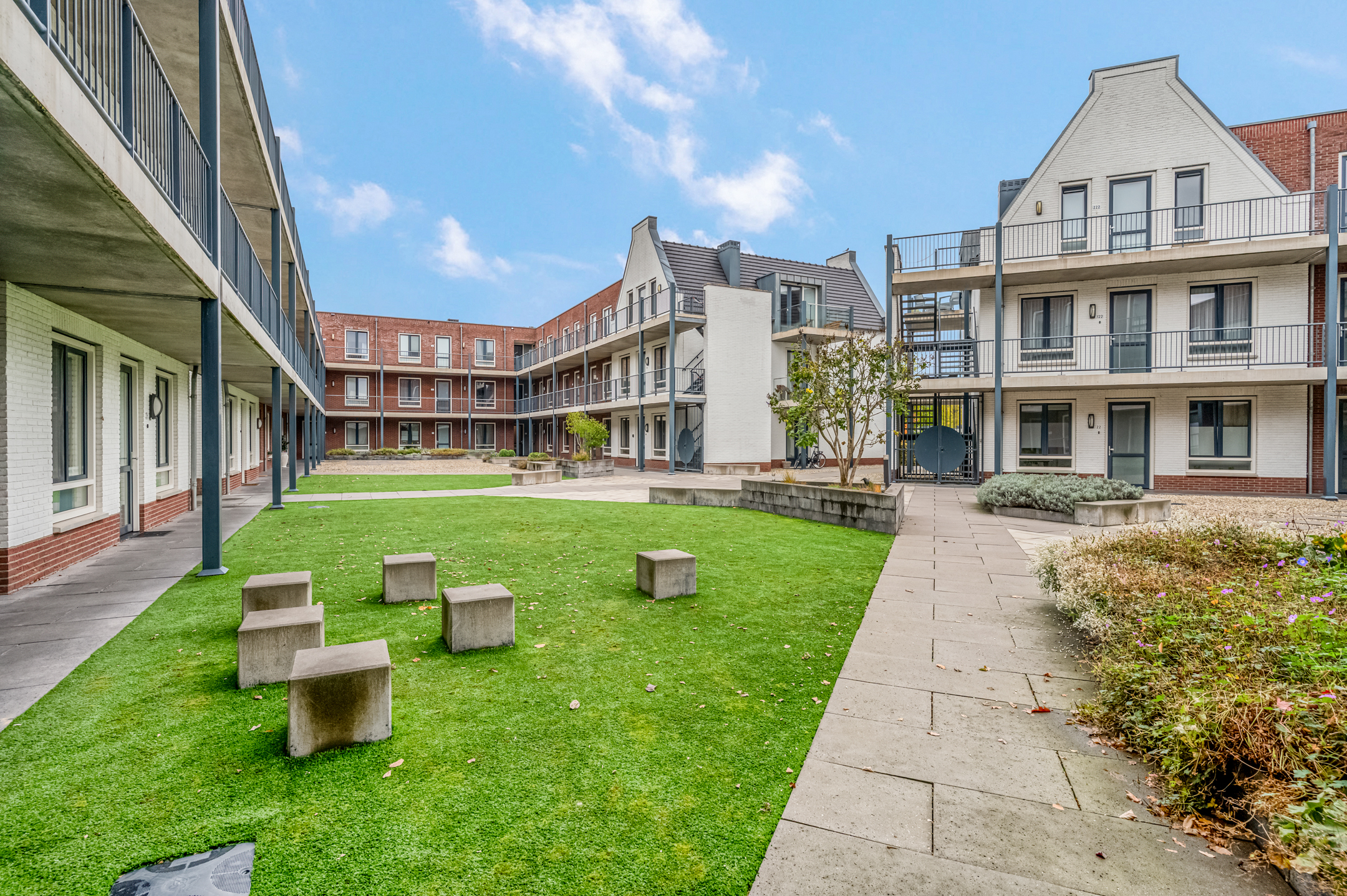 Het complex is verzorgd en beschikt over een afgesloten entree met intercom. Aan de achterzijde bevindt zich een fraai aangelegd binnenterrein met veel groen, een wandelpad en zitgelegenheden, een heerlijke plek om even buiten te zijn zonder het terrein te verlaten.