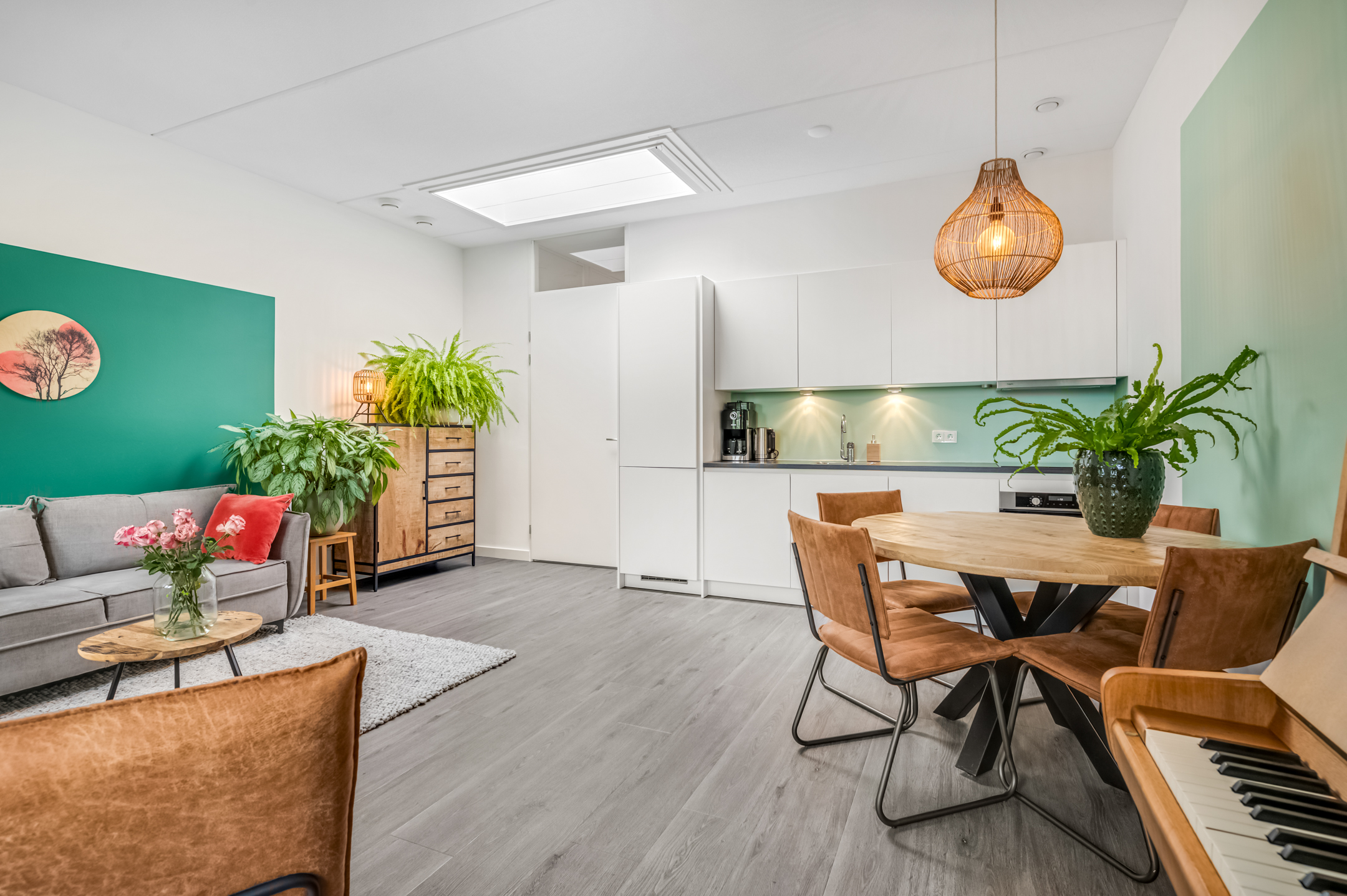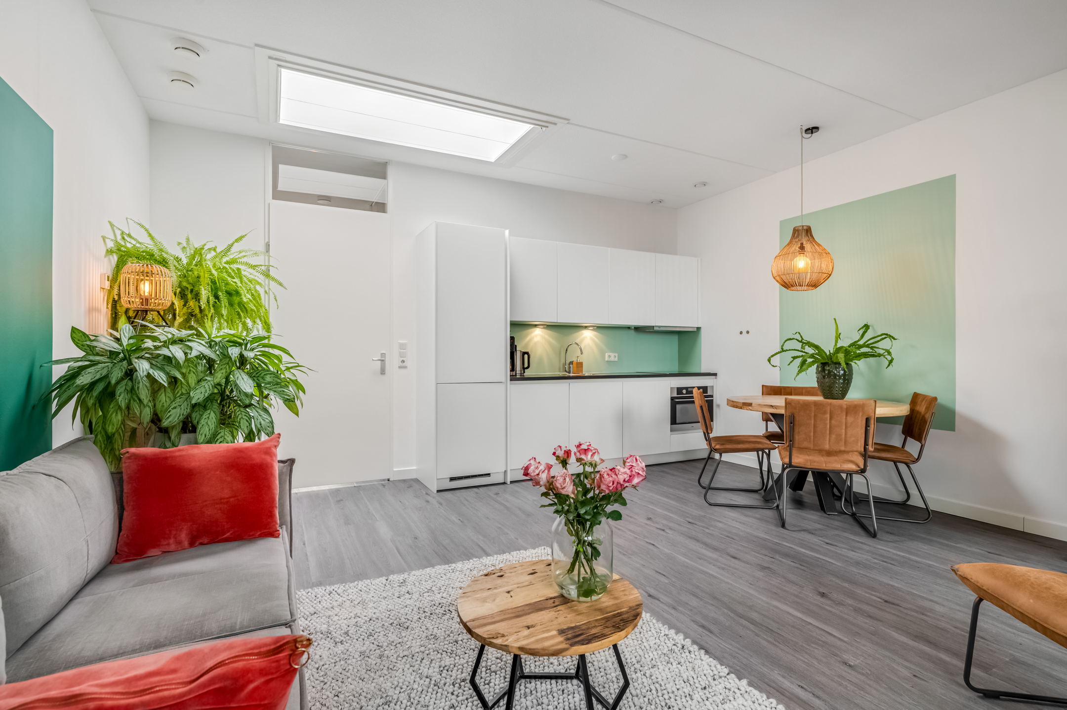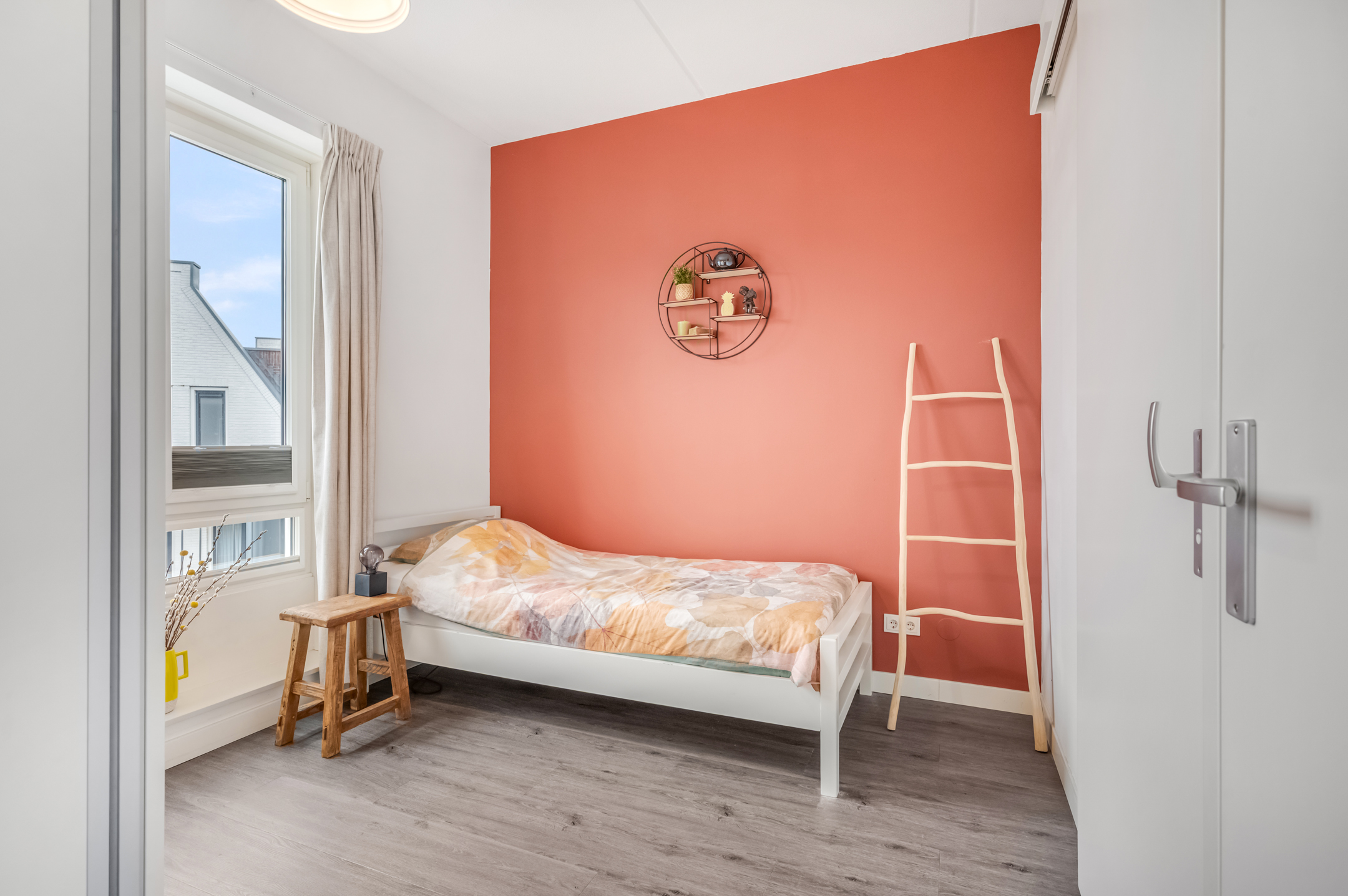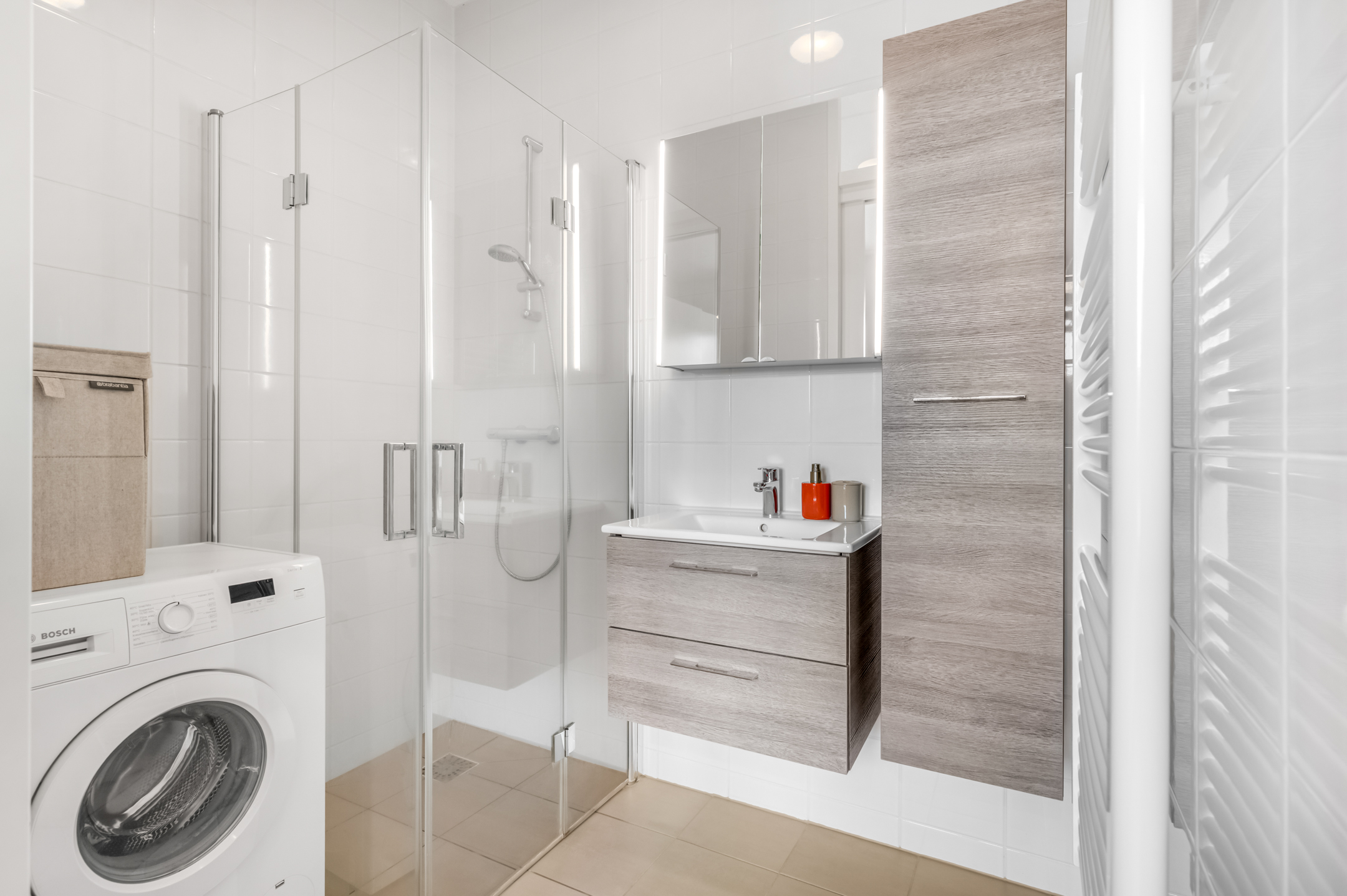 De woonkamer is een heerlijke leefruimte met een moderne PVC-vloer en volop daglicht dankzij de speelse raampartijen én een lichtstraat in het plafond. Een uniek detail dat zorgt voor een extra ruimtelijk gevoel. Vanuit de woonkamer heb je toegang tot een klein, maar fijn balkon. Grenzend aan de woonkamer vind je de nette open keuken in een frisse kleurstelling. Voorzien van diverse inbouwapparatuur en voldoende kastruimte. De eethoek biedt plek voor een gezellige maaltijd of een borrel met vrienden. De slaapkamer is compact maar praktisch ingedeeld. De warme kleur op de wand zorgt voor een knusse sfeer. Wat dit appartement extra fijn maakt, is de ensuite badkamer: modern afgewerkt en voorzien van een inloopdouche, wastafelmeubel, wasmachineaansluiting en een extra hoge kast. Comfortabel en efficiënt in gebruik. In de kelder bevindt zich een eigen inpandige berging.