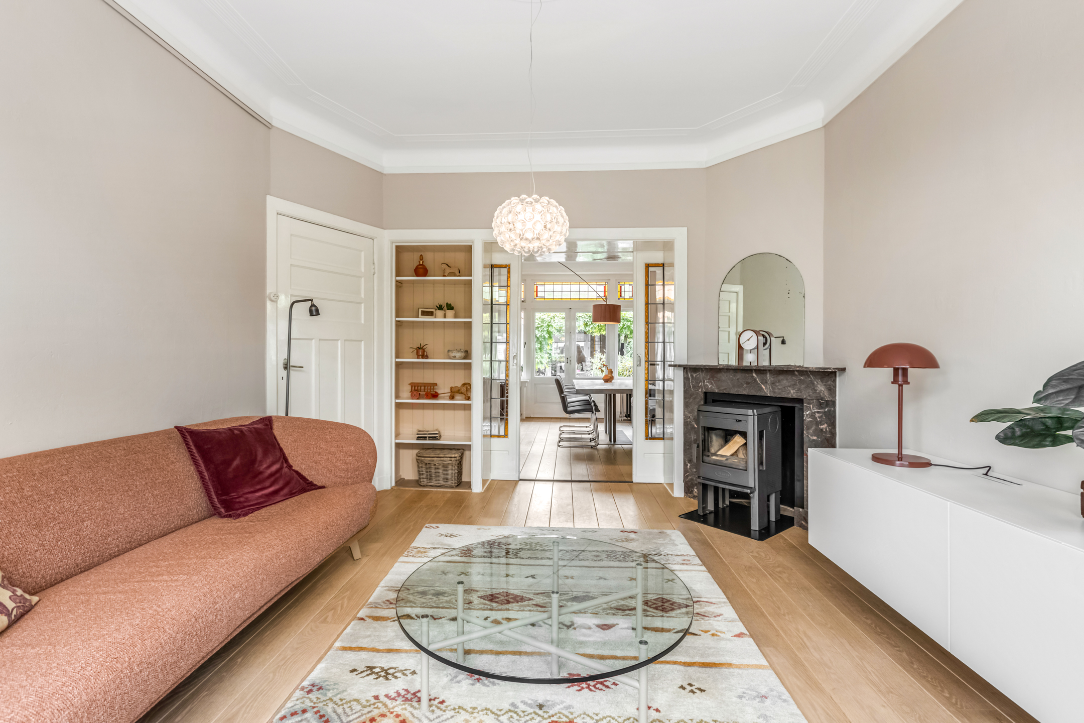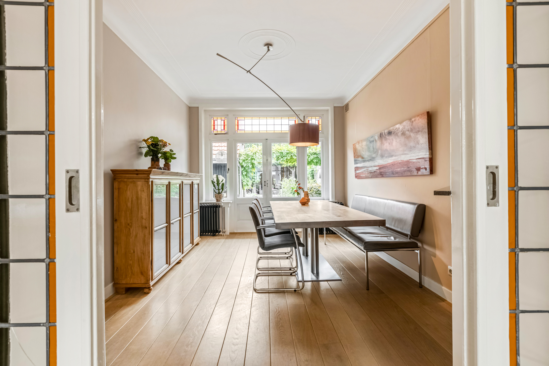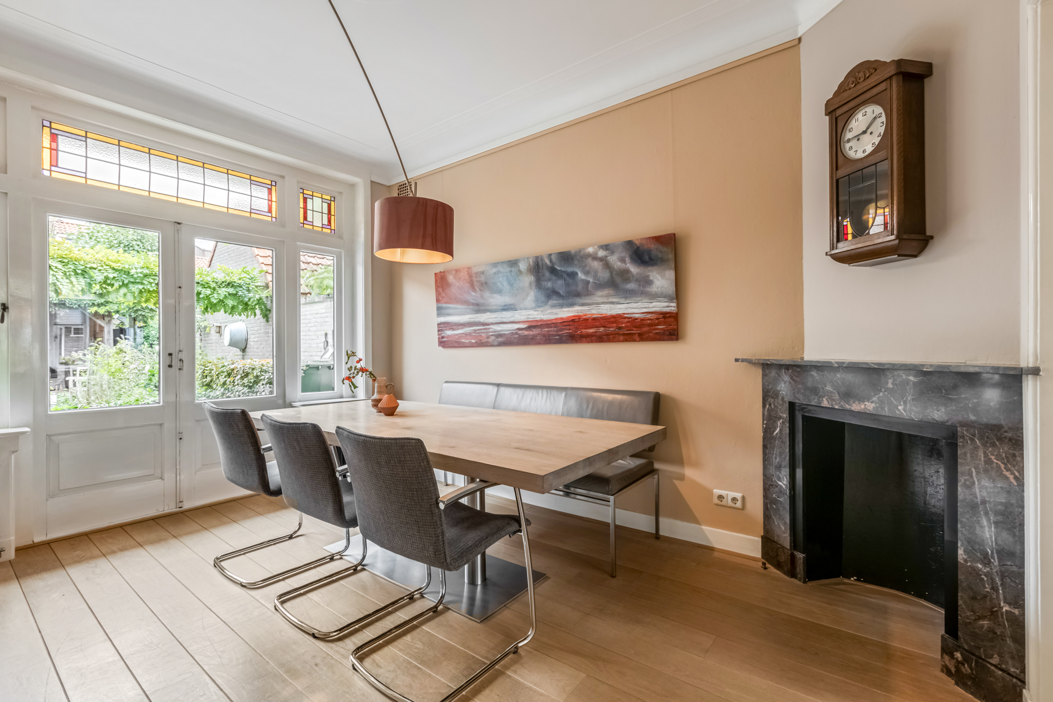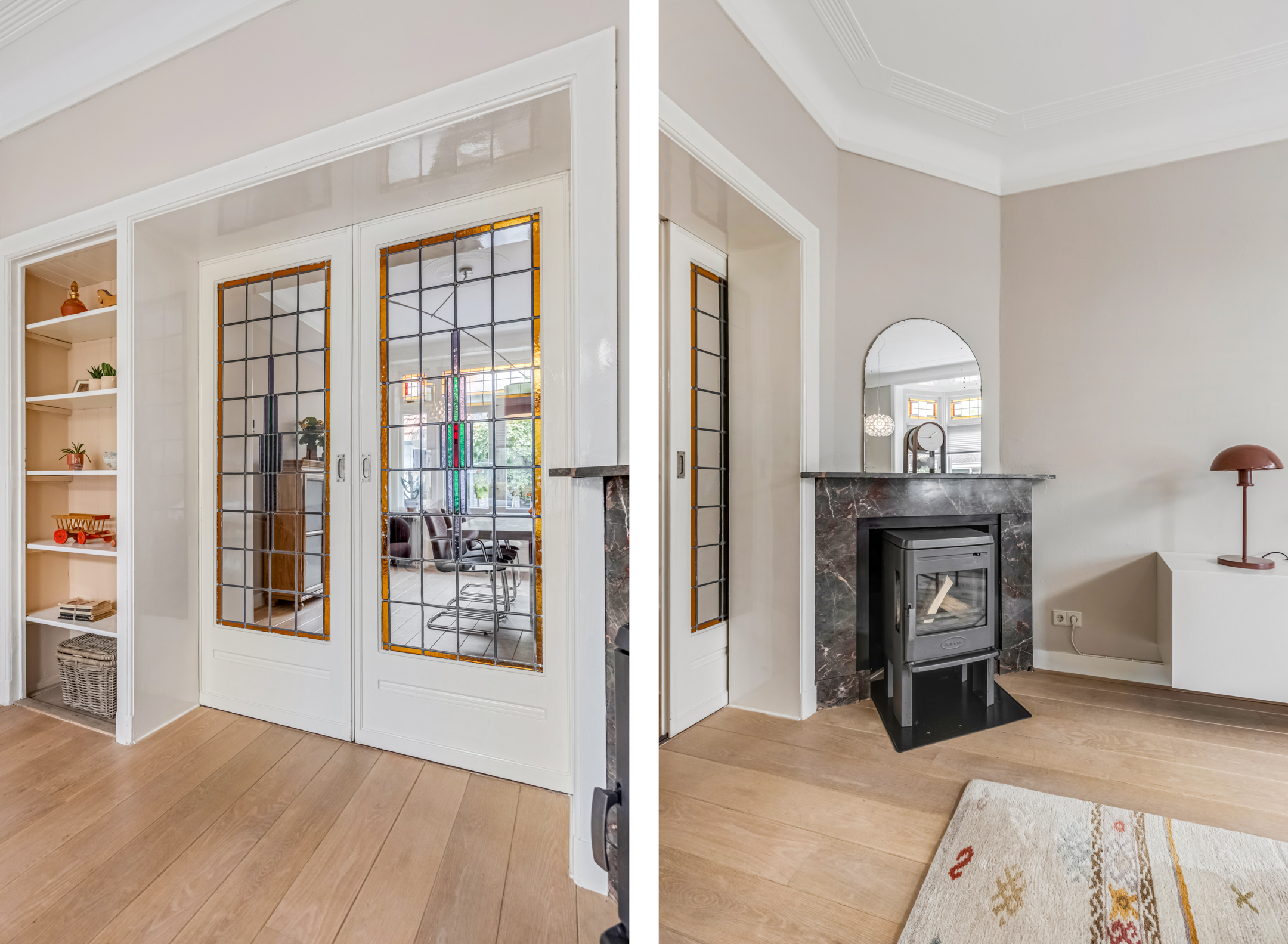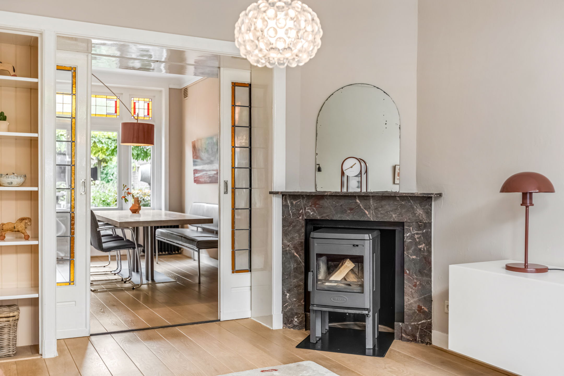 Via de entree kom je in de hal met toilet, trapopgang en toegang tot de woonvertrekken. De woonkamer aan de voorzijde is heerlijk licht dankzij de erker en straalt warmte uit door het hoge plafond, de houten vloer en de sfeervolle houtkachel. De suitedeuren met glas-in-lood verbinden de woonkamer met de eetkamer, die via openslaande deuren toegang geeft tot de tuin. De dichte keuken in zwart-witstijl is compleet, voorzien van een fraai gasfornuis, voldoende kastruimte en een deur naar de achtertuin.