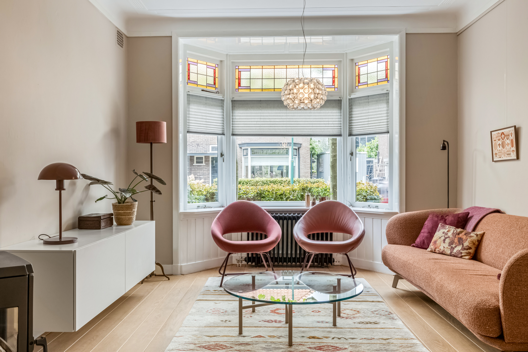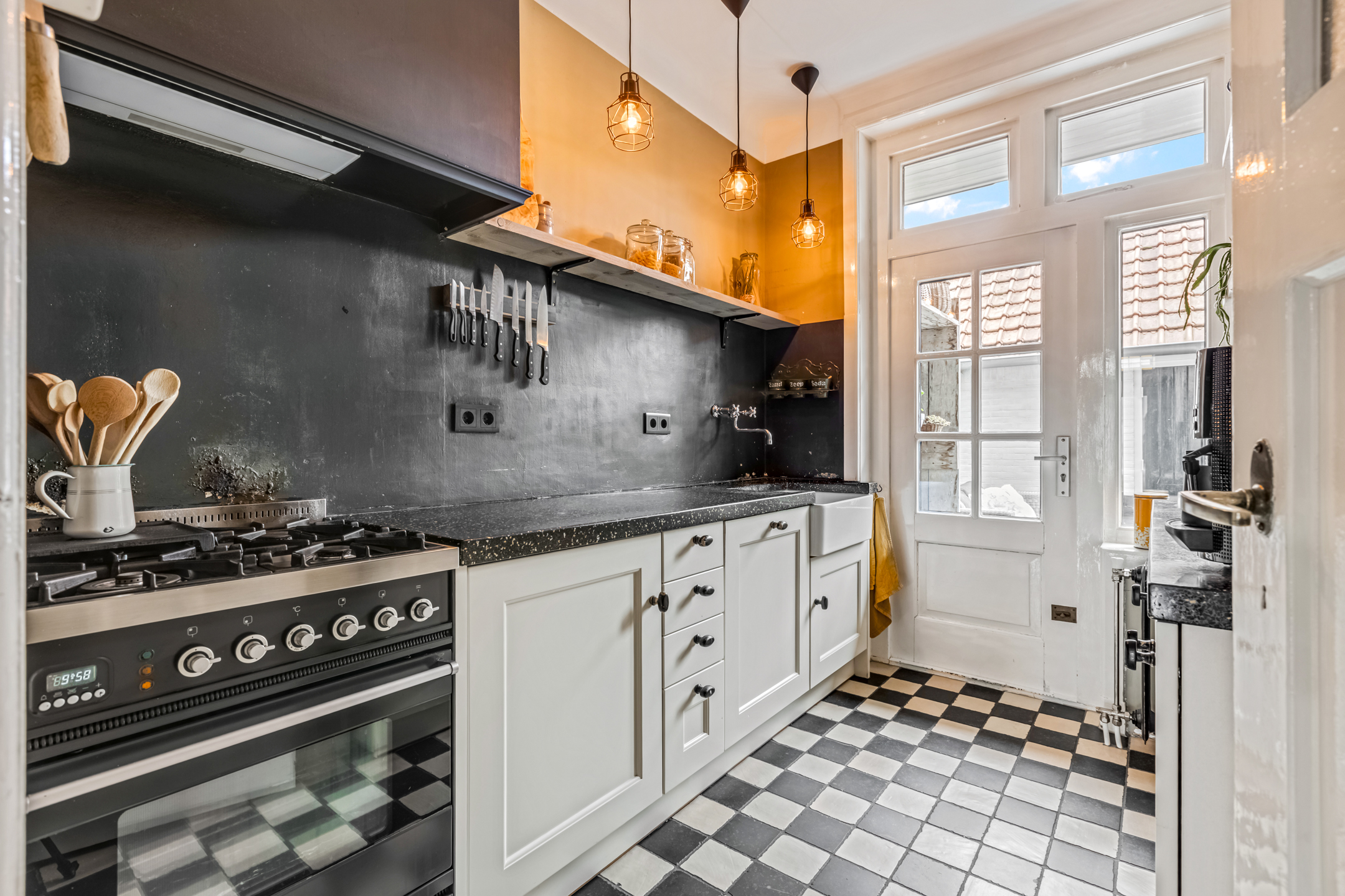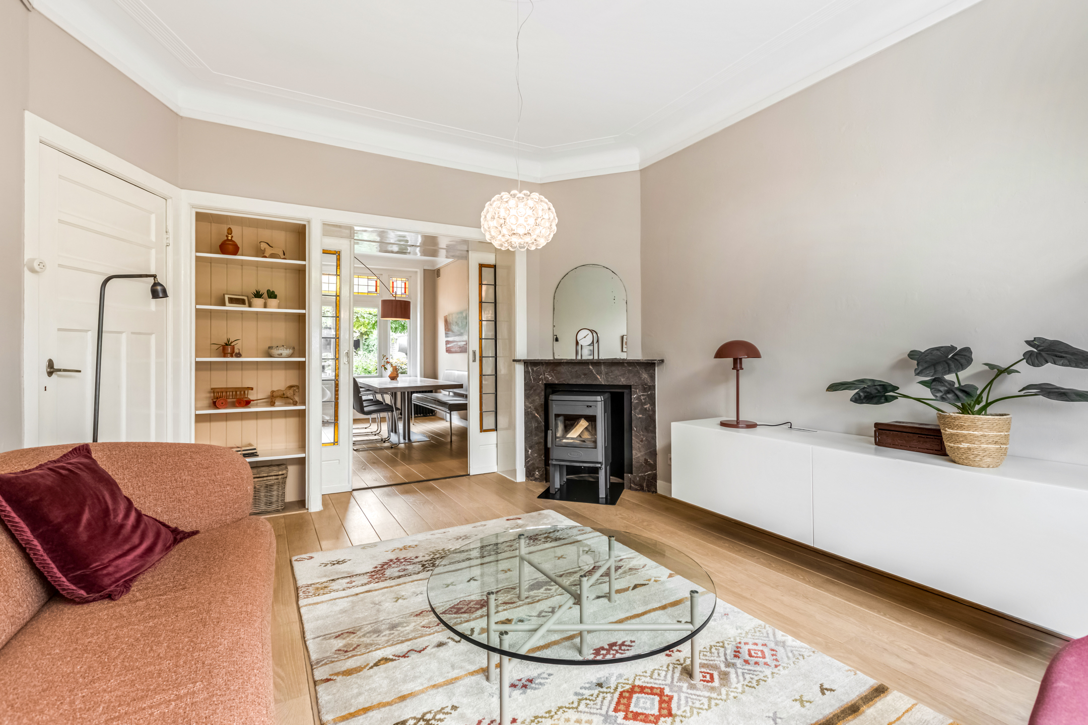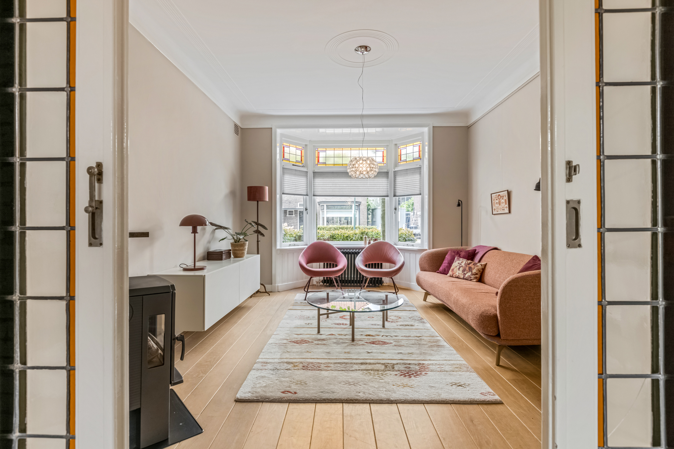 Via de entree kom je in de hal met toilet, trapopgang en toegang tot de woonvertrekken. De woonkamer aan de voorzijde is heerlijk licht dankzij de erker en straalt warmte uit door het hoge plafond, de houten vloer en de sfeervolle houtkachel. De suitedeuren met glas-in-lood verbinden de woonkamer met de eetkamer, die via openslaande deuren toegang geeft tot de tuin. De dichte keuken in zwart-witstijl is compleet, voorzien van een fraai gasfornuis, voldoende kastruimte en een deur naar de achtertuin.