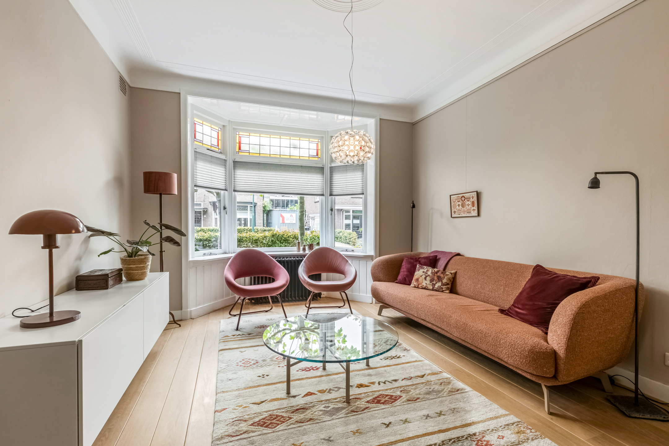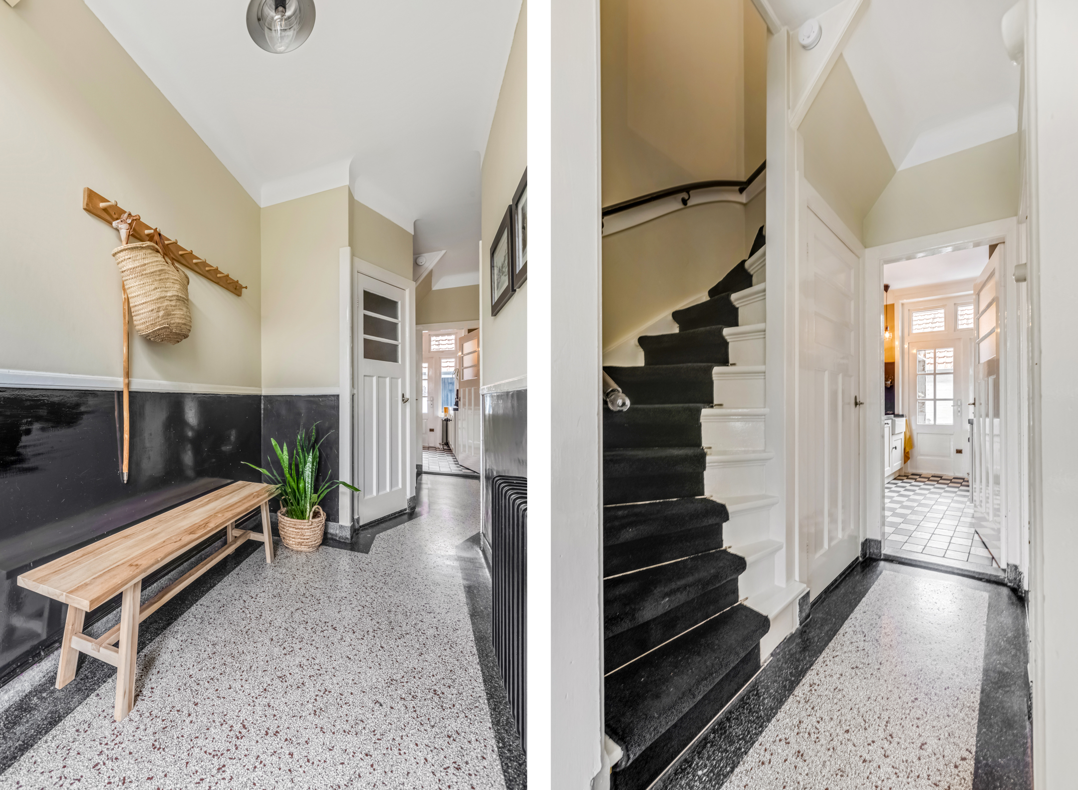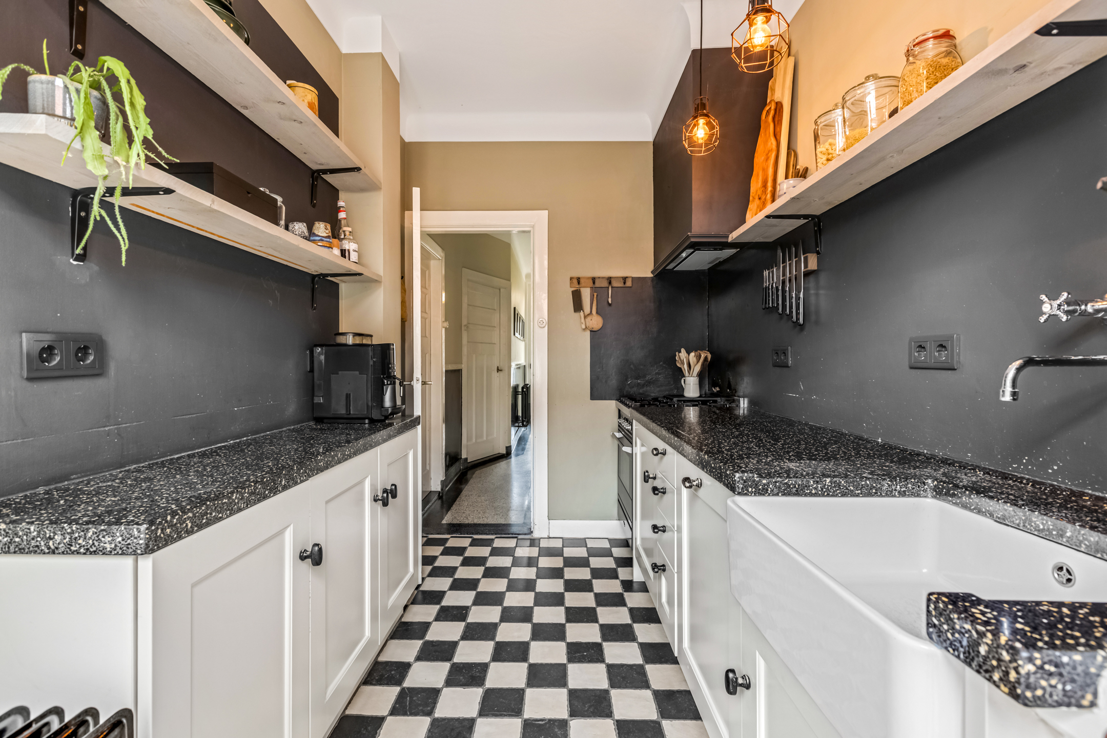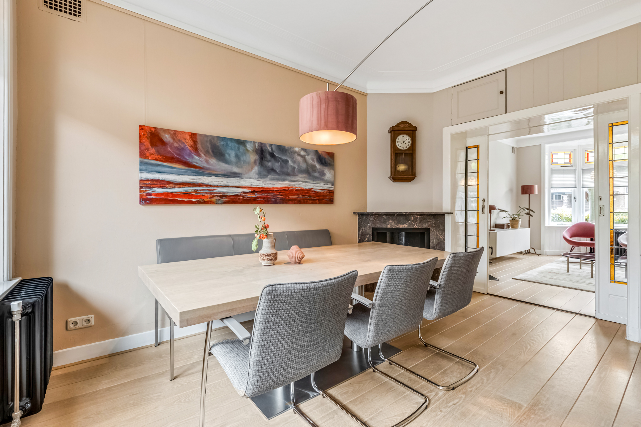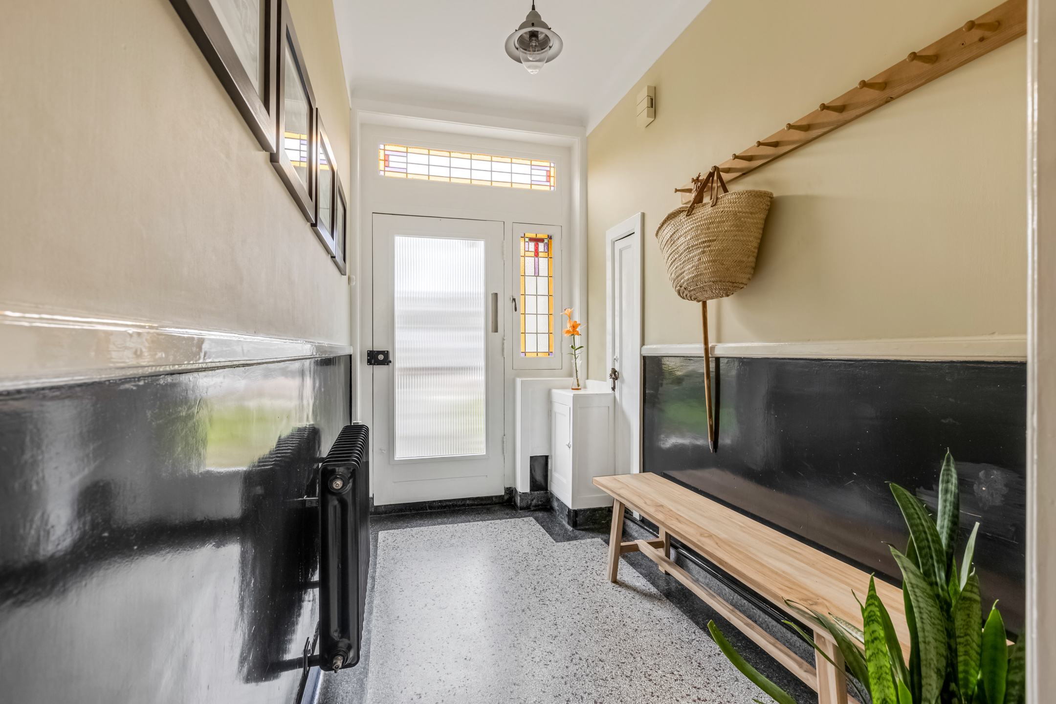 Via de entree kom je in de hal met toilet, trapopgang en toegang tot de woonvertrekken. De woonkamer aan de voorzijde is heerlijk licht dankzij de erker en straalt warmte uit door het hoge plafond, de houten vloer en de sfeervolle houtkachel. De suitedeuren met glas-in-lood verbinden de woonkamer met de eetkamer, die via openslaande deuren toegang geeft tot de tuin. De dichte keuken in zwart-witstijl is compleet, voorzien van een fraai gasfornuis, voldoende kastruimte en een deur naar de achtertuin.