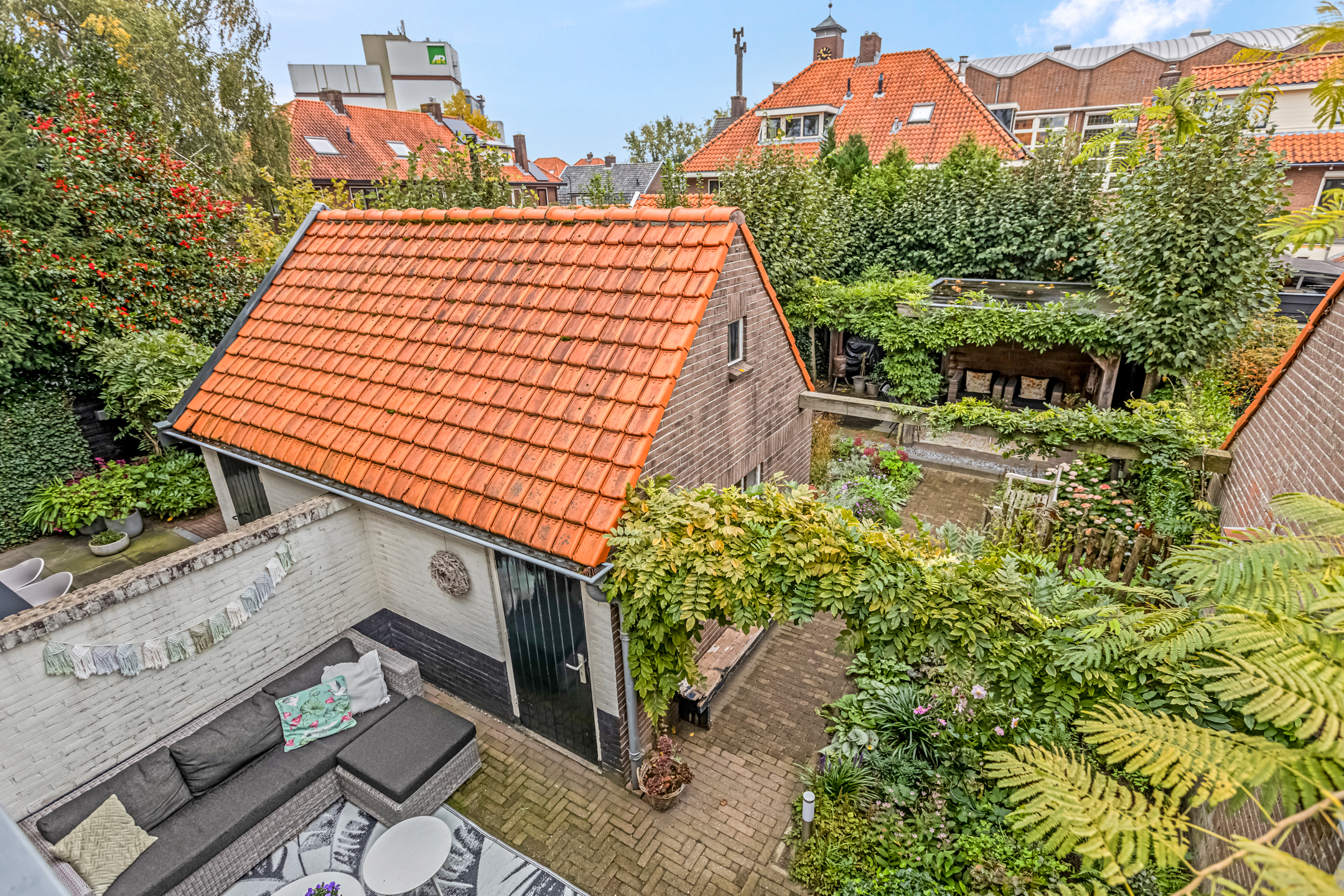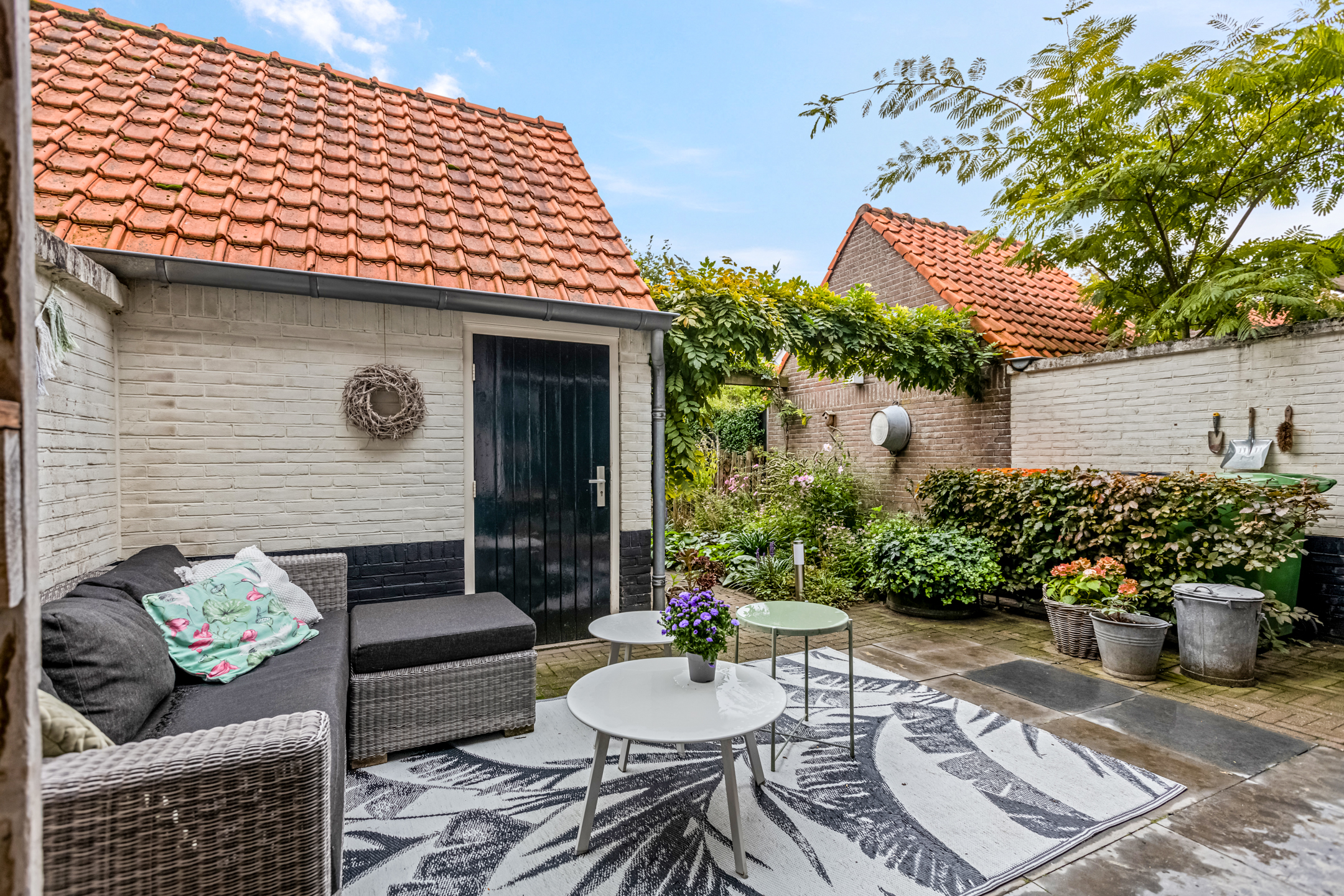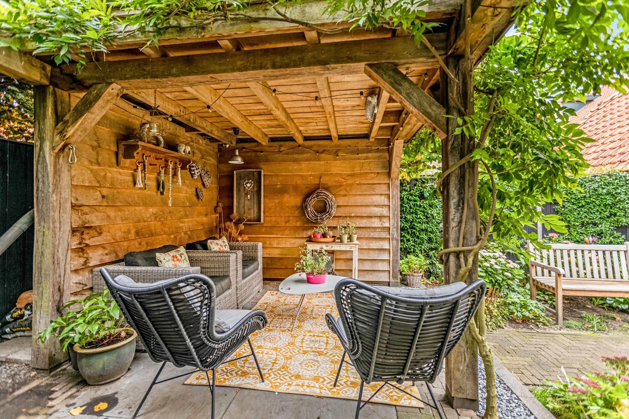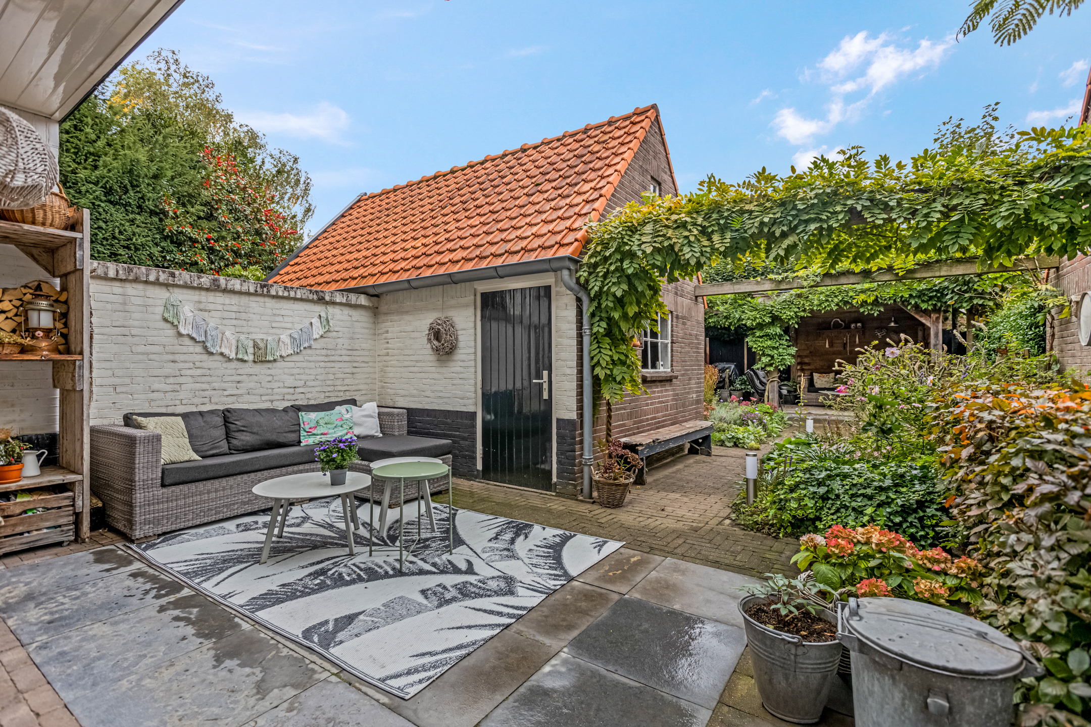 De diepe achtertuin is een heerlijke plek om tot rust te komen. Direct achter de woning ligt een terras, perfect voor een kop koffie in de ochtendzon. Verderop vind je een charmante overkapping met zitgedeelte, ideaal om tot laat buiten te zitten. De tuin is ook via een achterom bereikbaar en beschikt over een praktische stenen berging met vliering waar je moeiteloos je fietsen en tuingereedschap kwijt kunt.