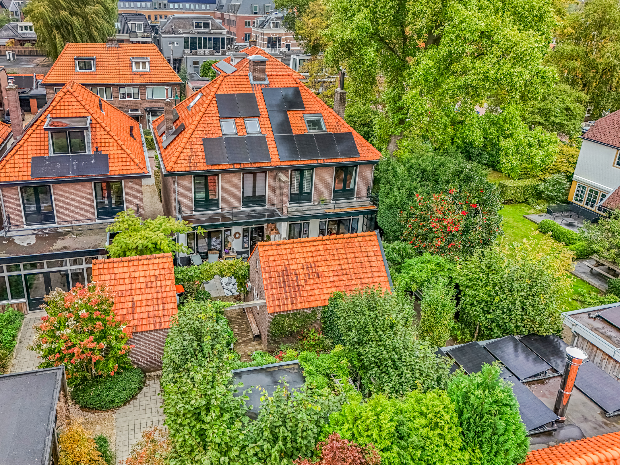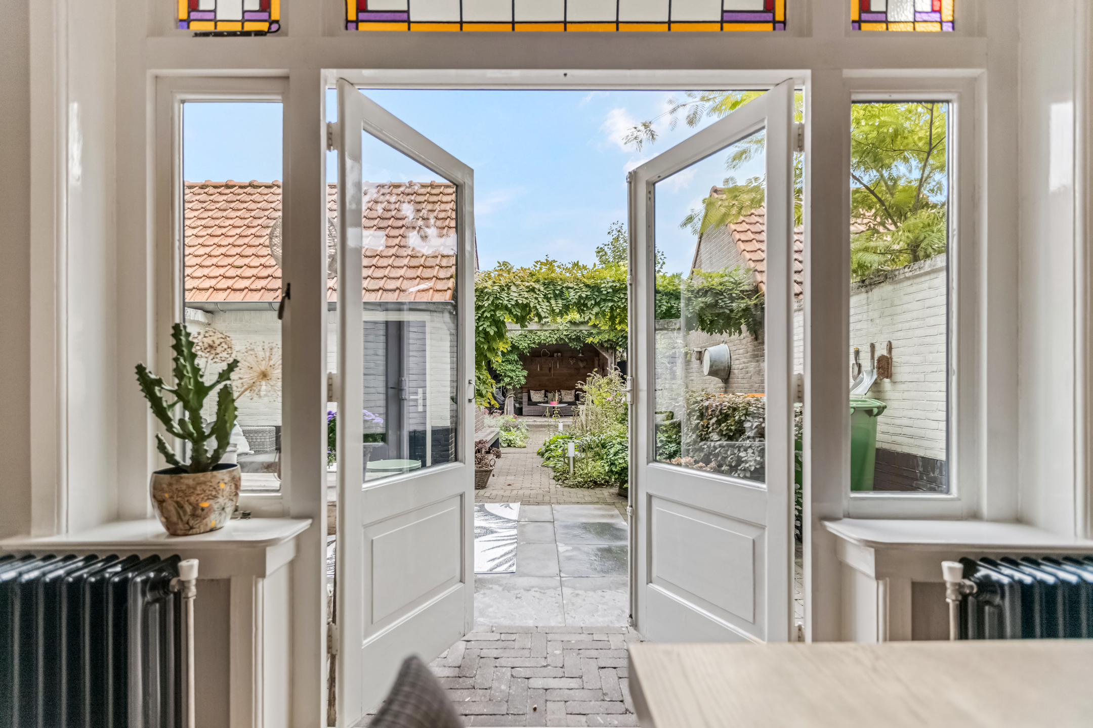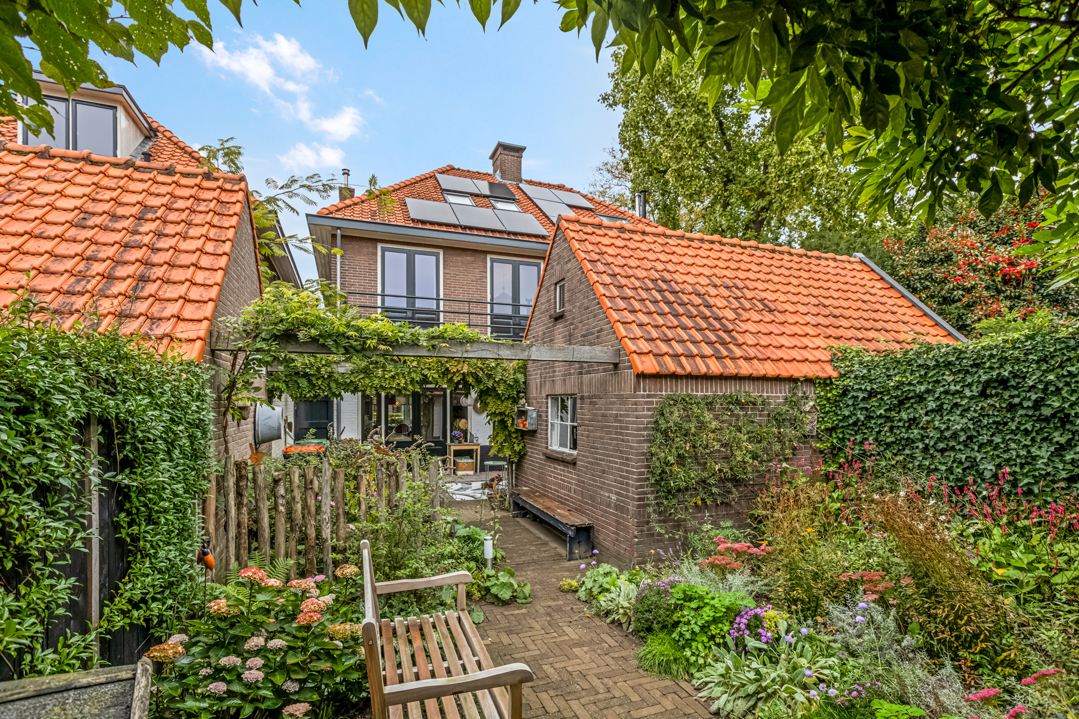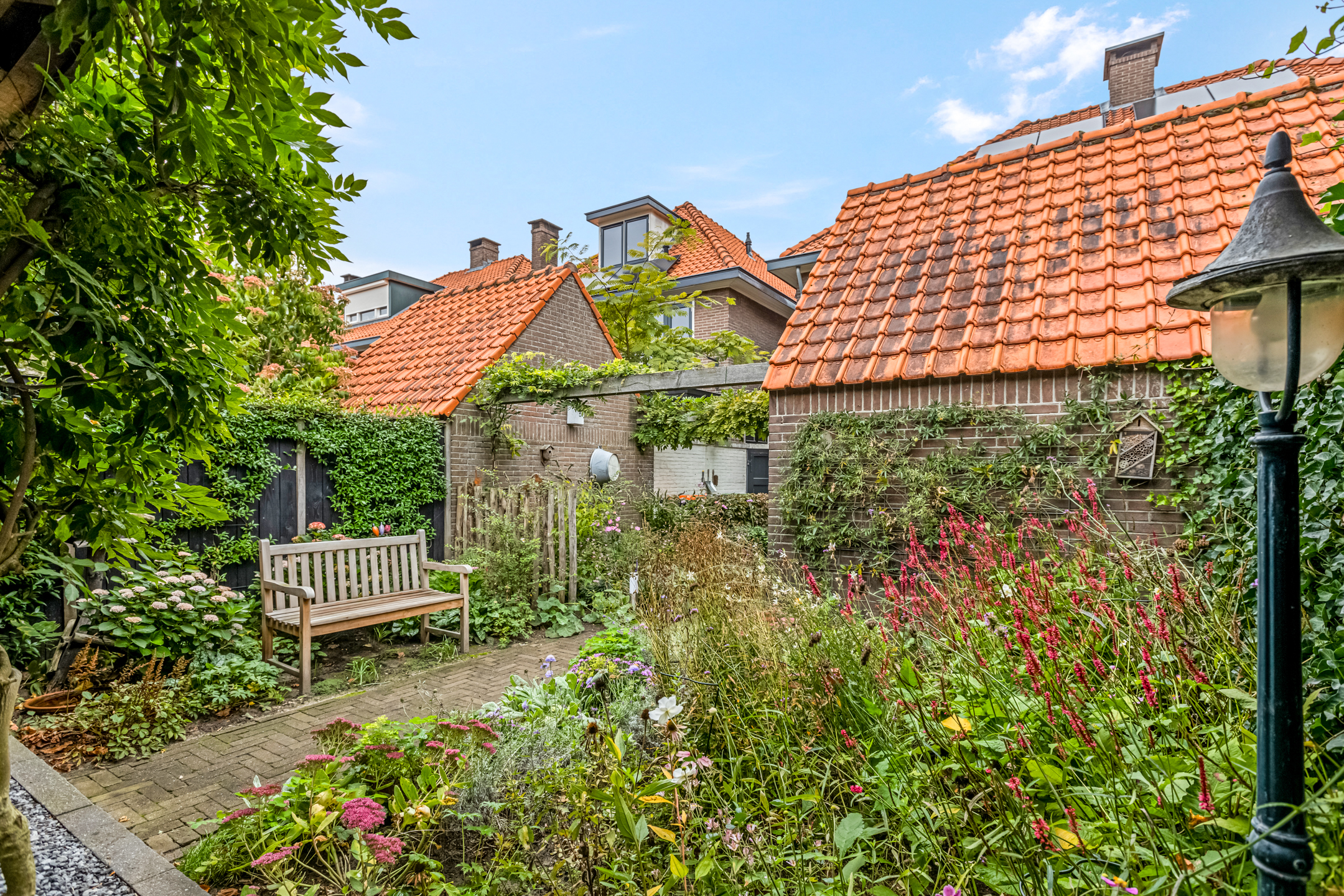 De diepe achtertuin is een heerlijke plek om tot rust te komen. Direct achter de woning ligt een terras, perfect voor een kop koffie in de ochtendzon. Verderop vind je een charmante overkapping met zitgedeelte, ideaal om tot laat buiten te zitten. De tuin is ook via een achterom bereikbaar en beschikt over een praktische stenen berging met vliering waar je moeiteloos je fietsen en tuingereedschap kwijt kunt.