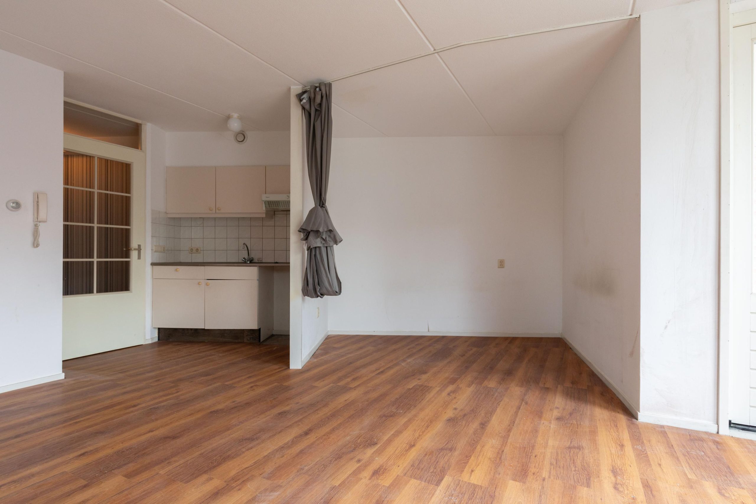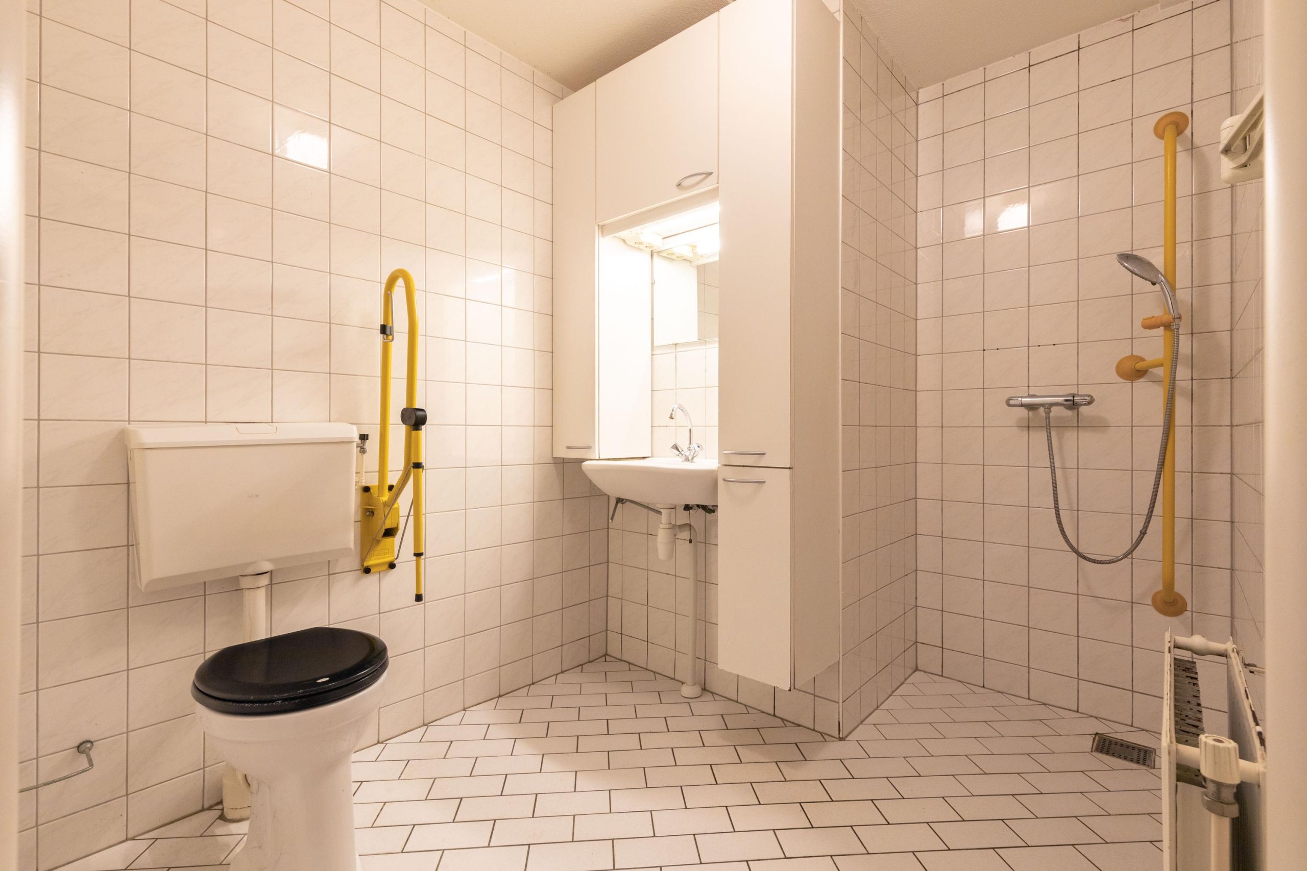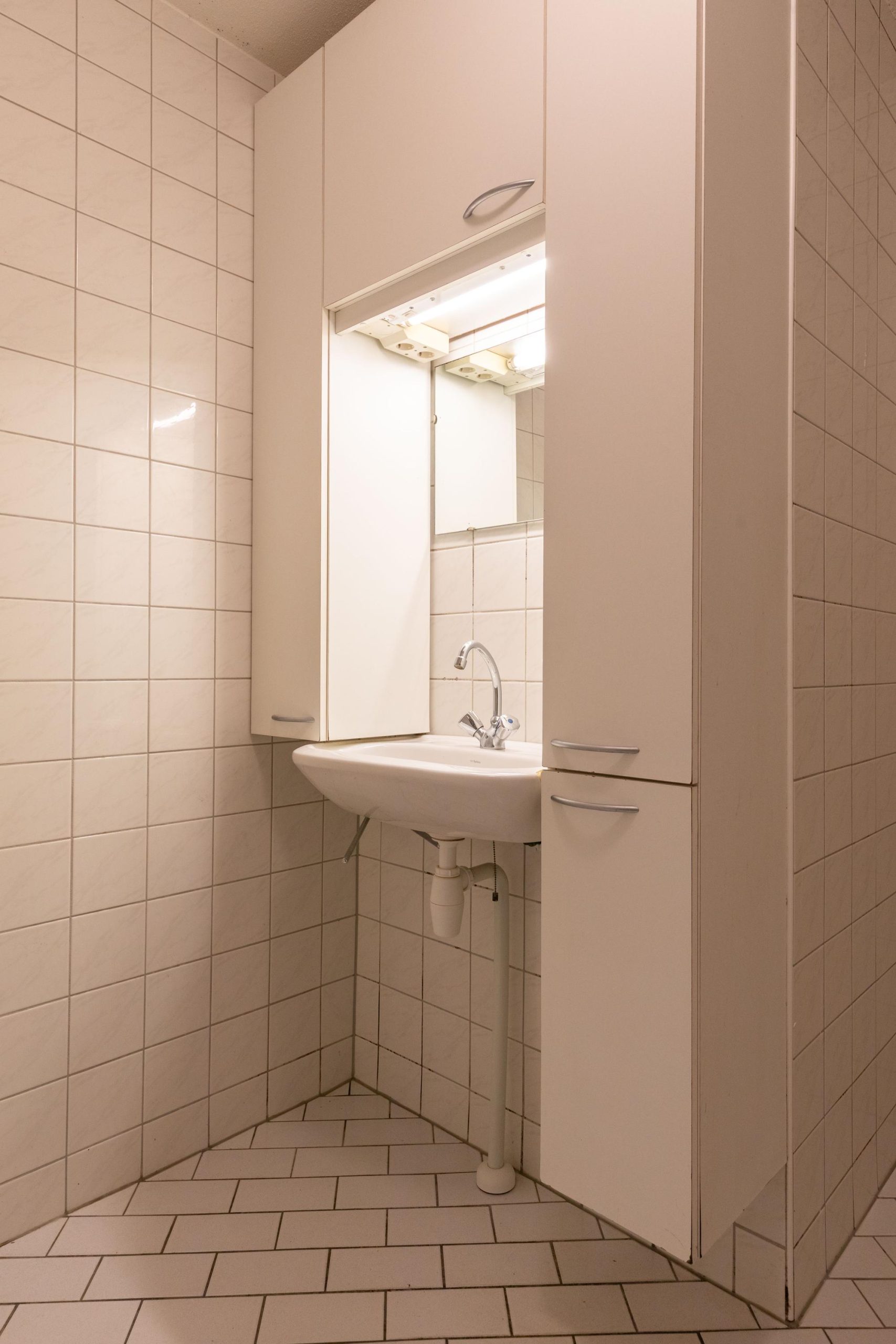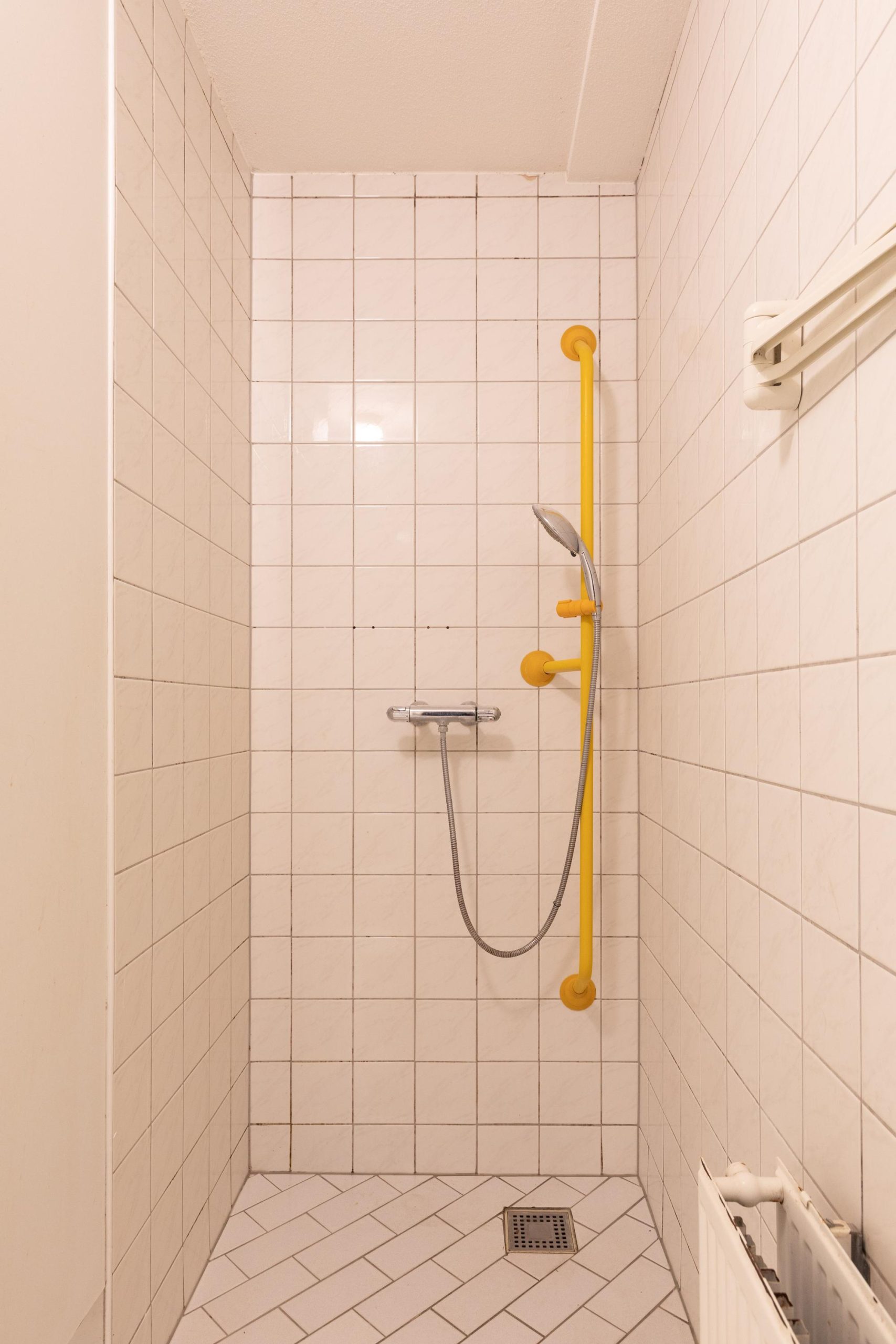 Je komt binnen via de centrale hal van het complex. De studio bestaat uit een open leefruimte met zit-, eet- en slaapgedeelte, een eenvoudige keuken, een badkamer met douche, toilet en wastafel, en een bergkast met witgoedaansluiting.