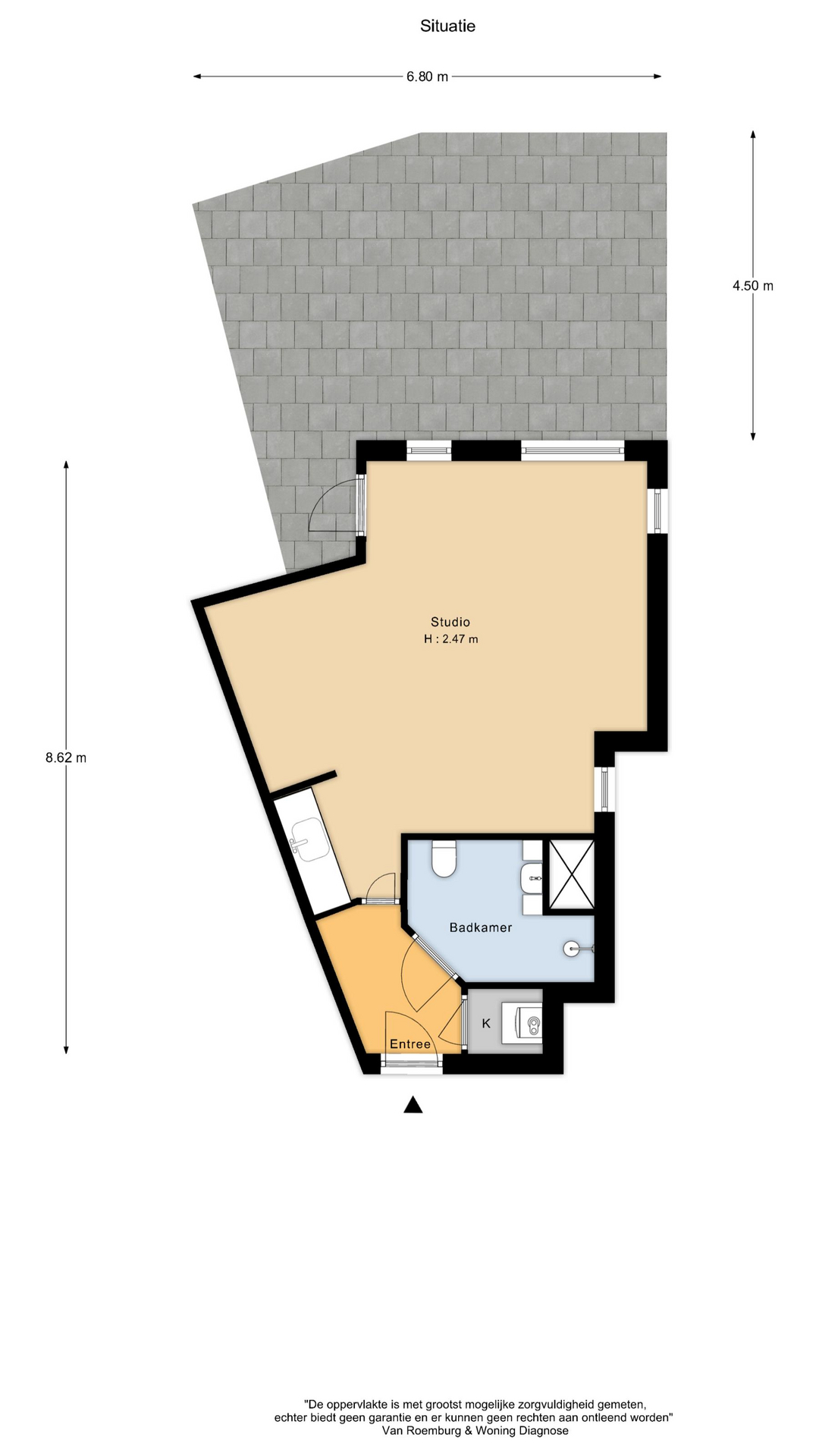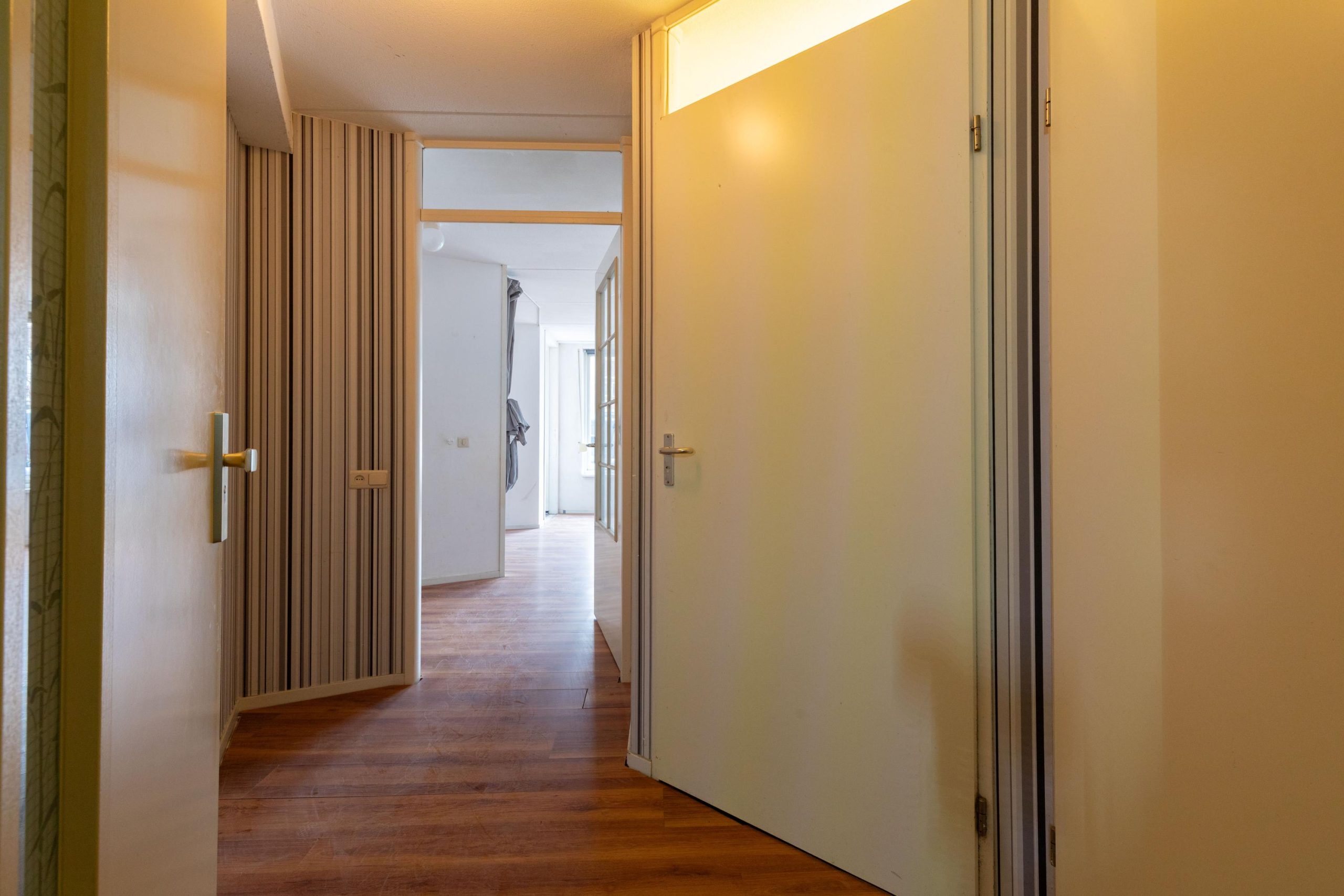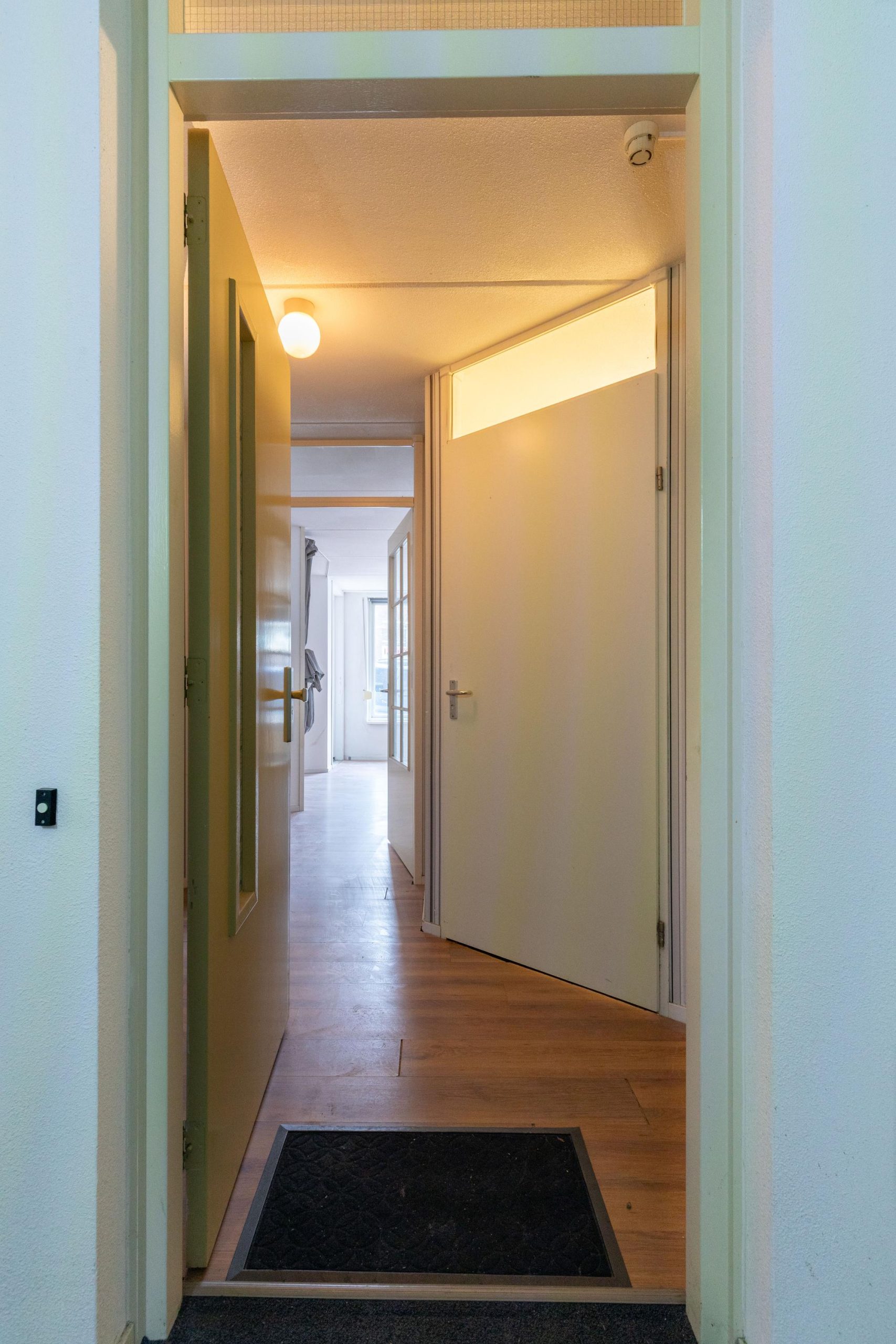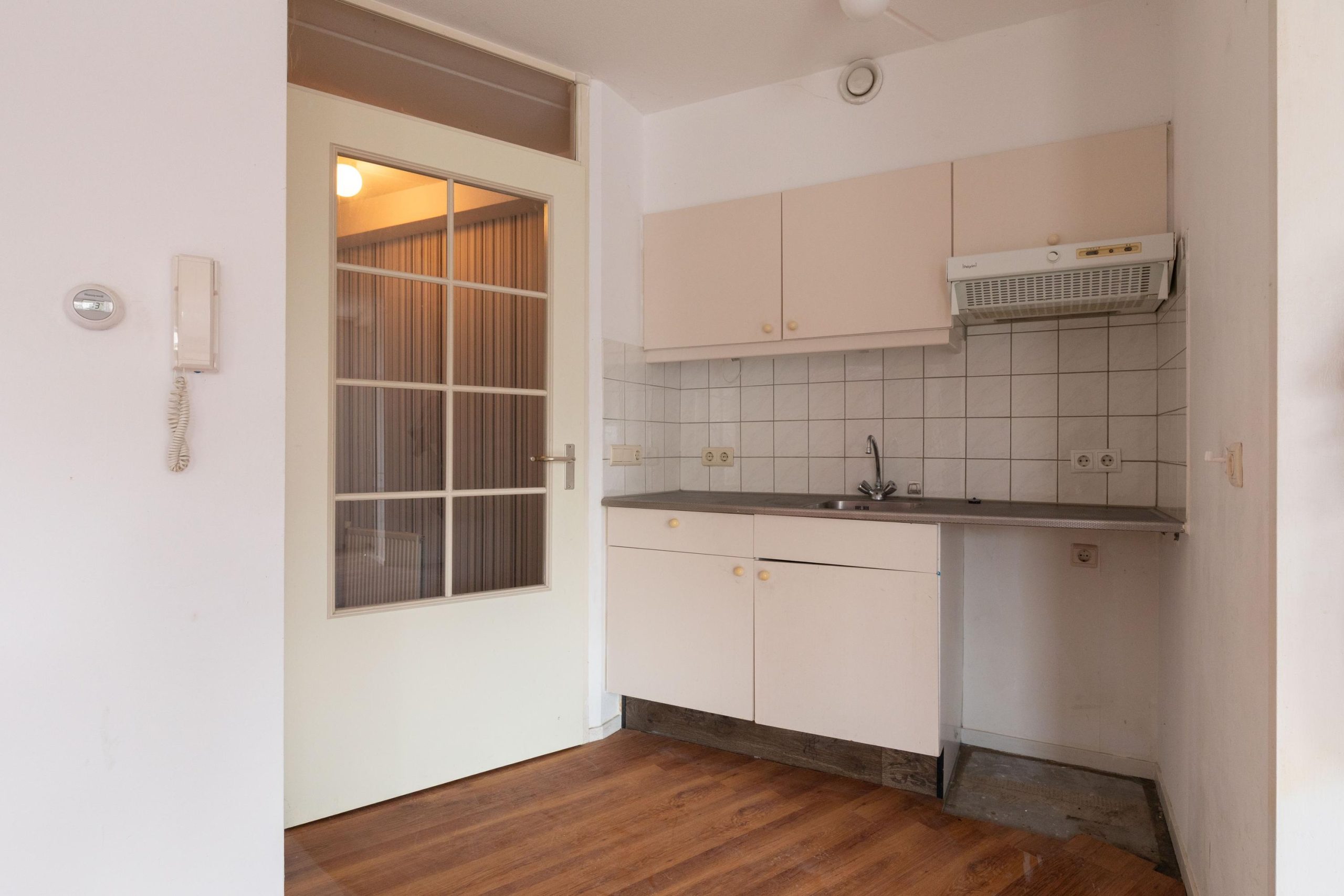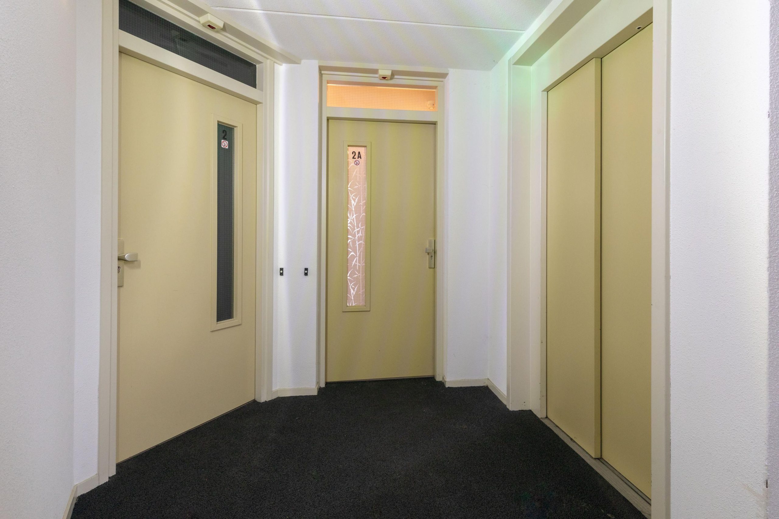 Je komt binnen via de centrale hal van het complex. De studio bestaat uit een open leefruimte met zit-, eet- en slaapgedeelte, een eenvoudige keuken, een badkamer met douche, toilet en wastafel, en een bergkast met witgoedaansluiting.