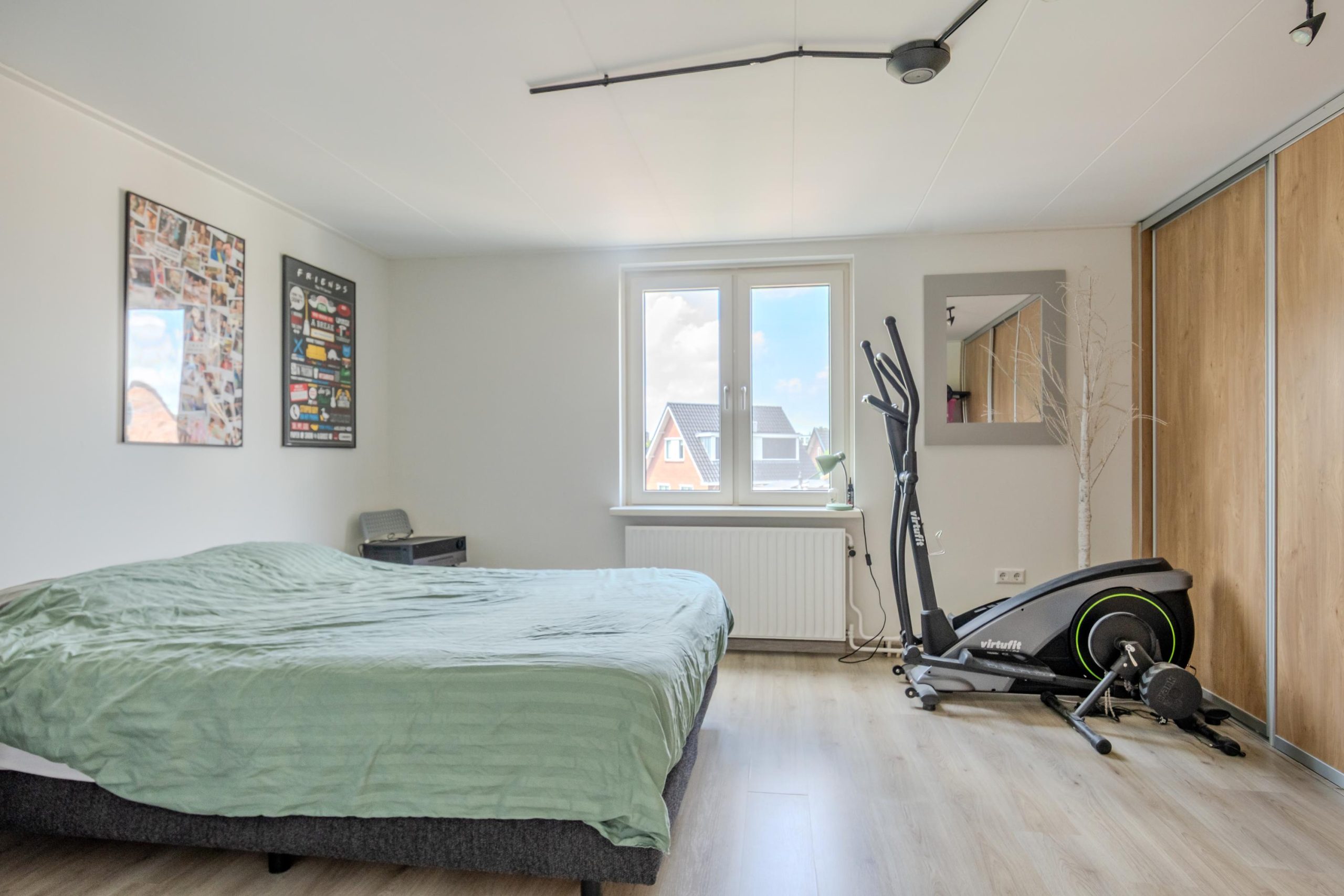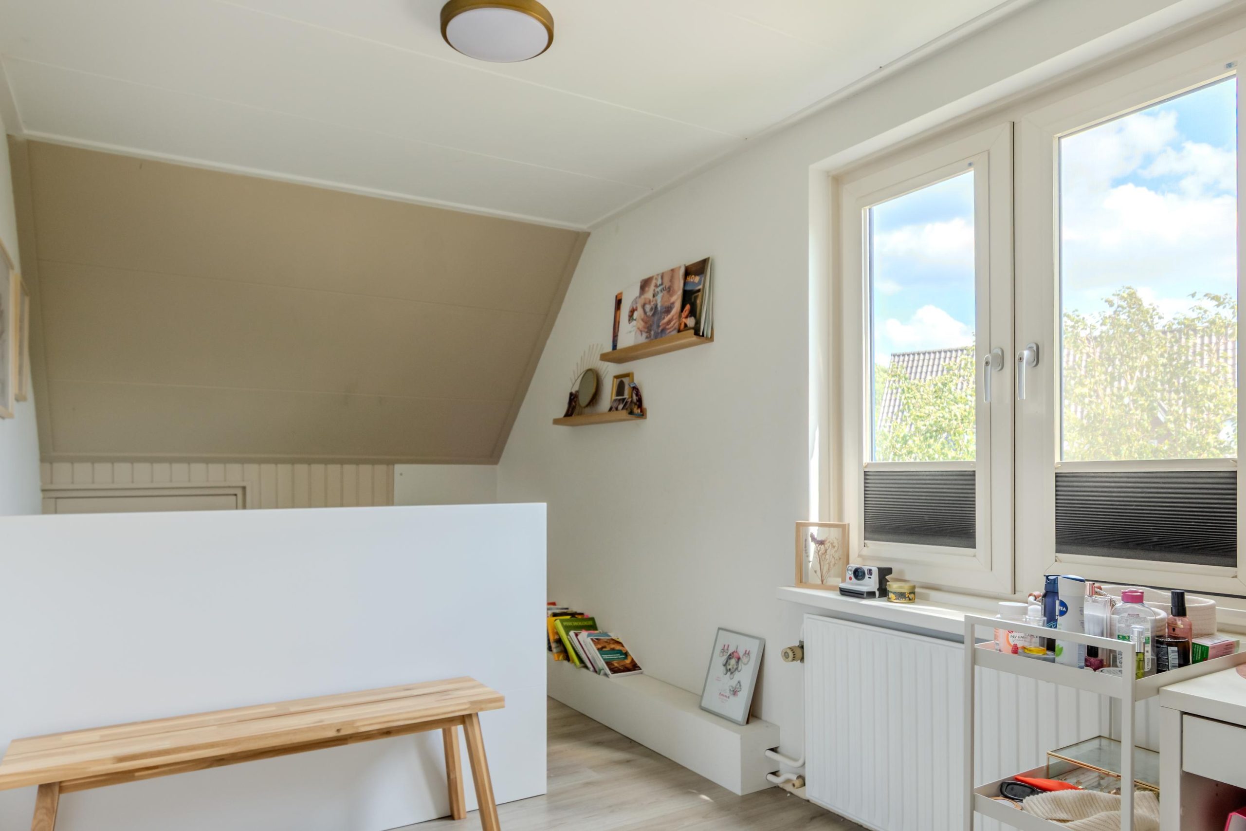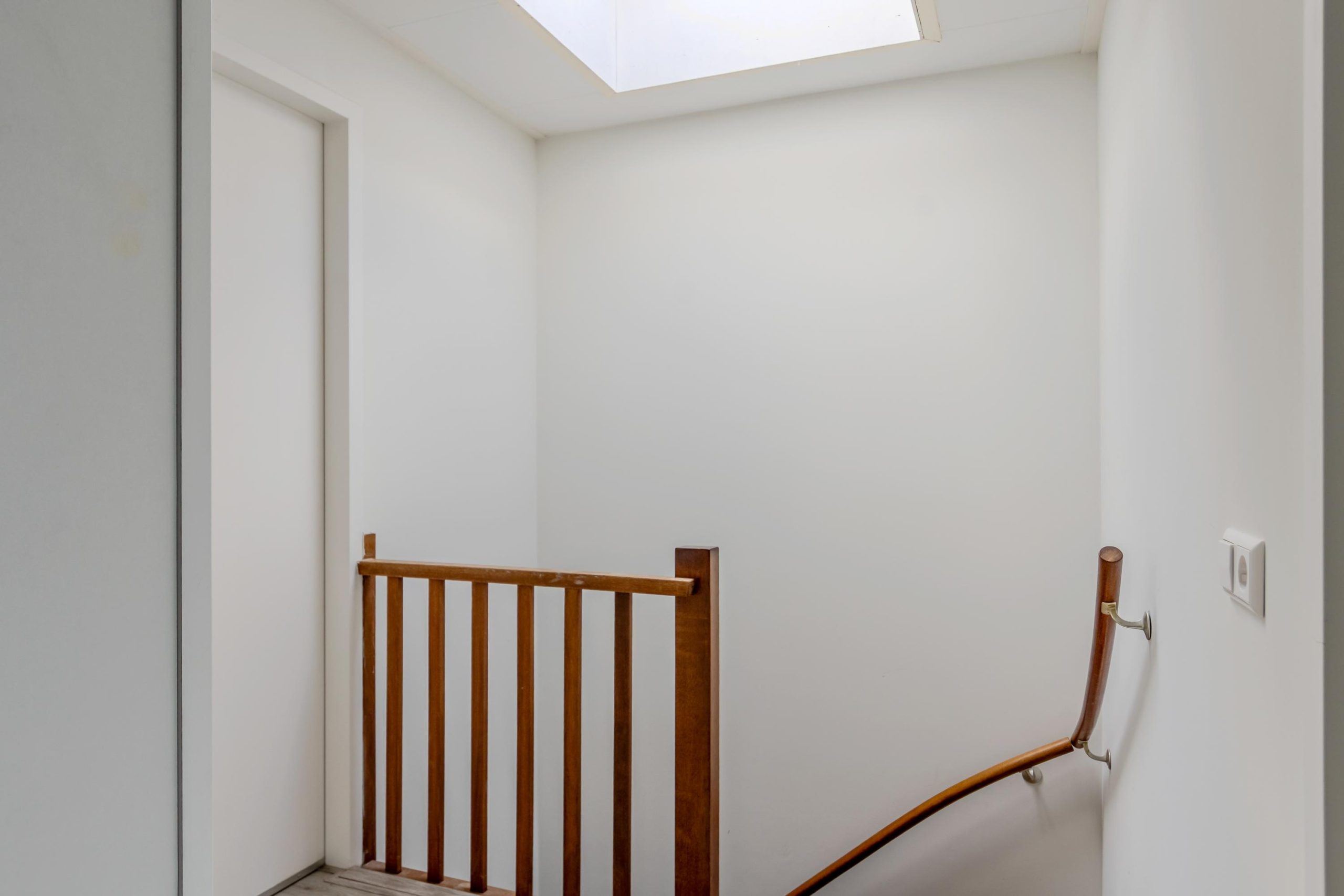 Overloop met lichtkoepel en deze verdieping biedt nog eens twee volwaardige slaapkamers. Daarnaast bevindt zich hier een aparte wasruimte, die eventueel eenvoudig omgevormd kan worden tot tweede badkamer. Dankzij de slimme indeling is deze verdieping volledig functioneel en ideaal voor grotere gezinnen, logees of werk-/hobbyruimte. Er is ook nog een vliering aanwezig.