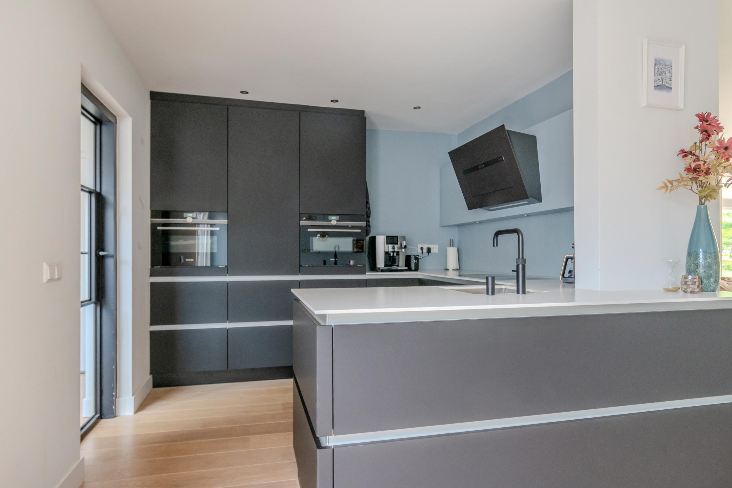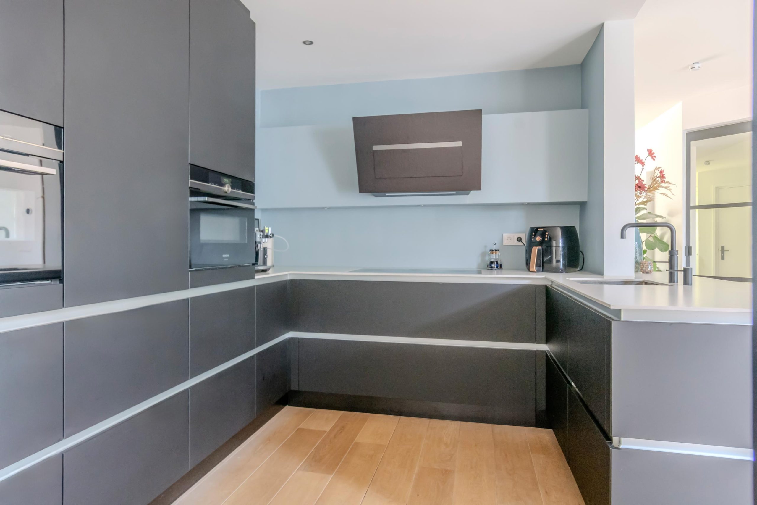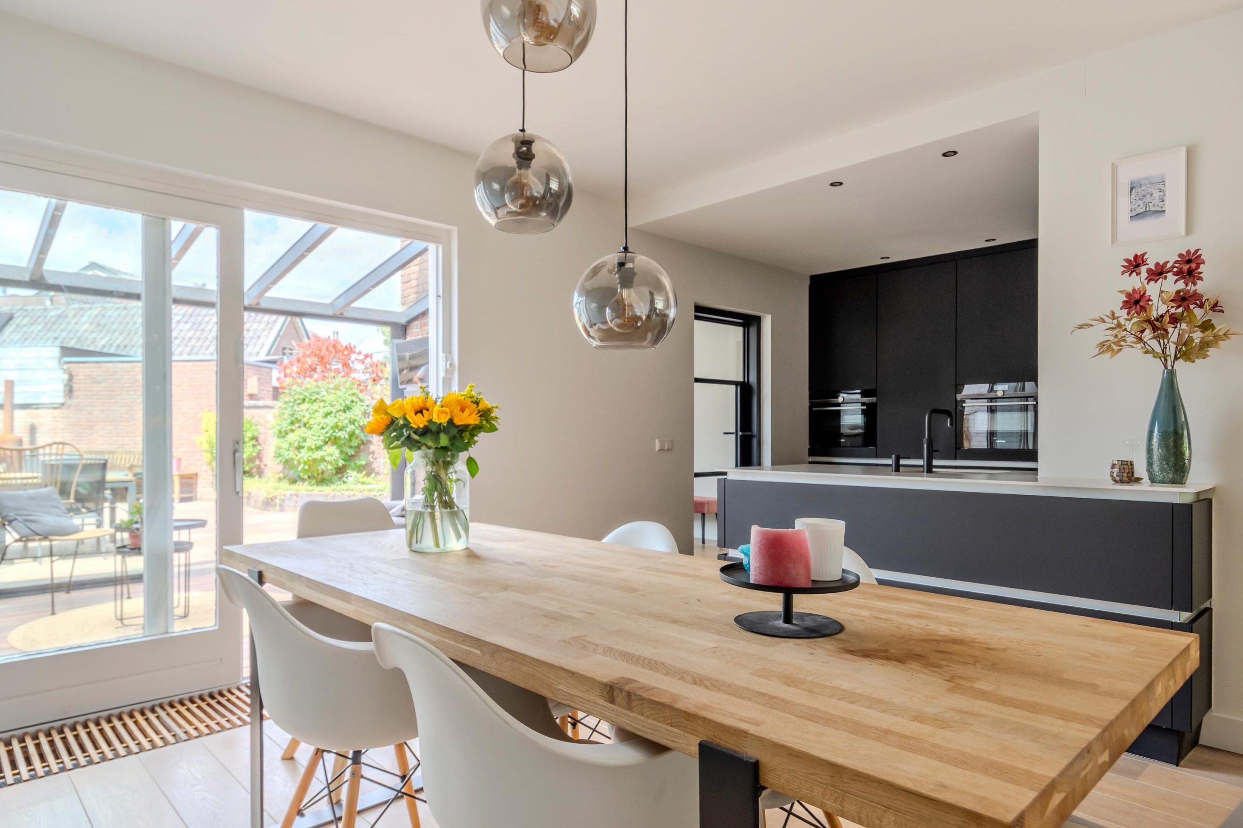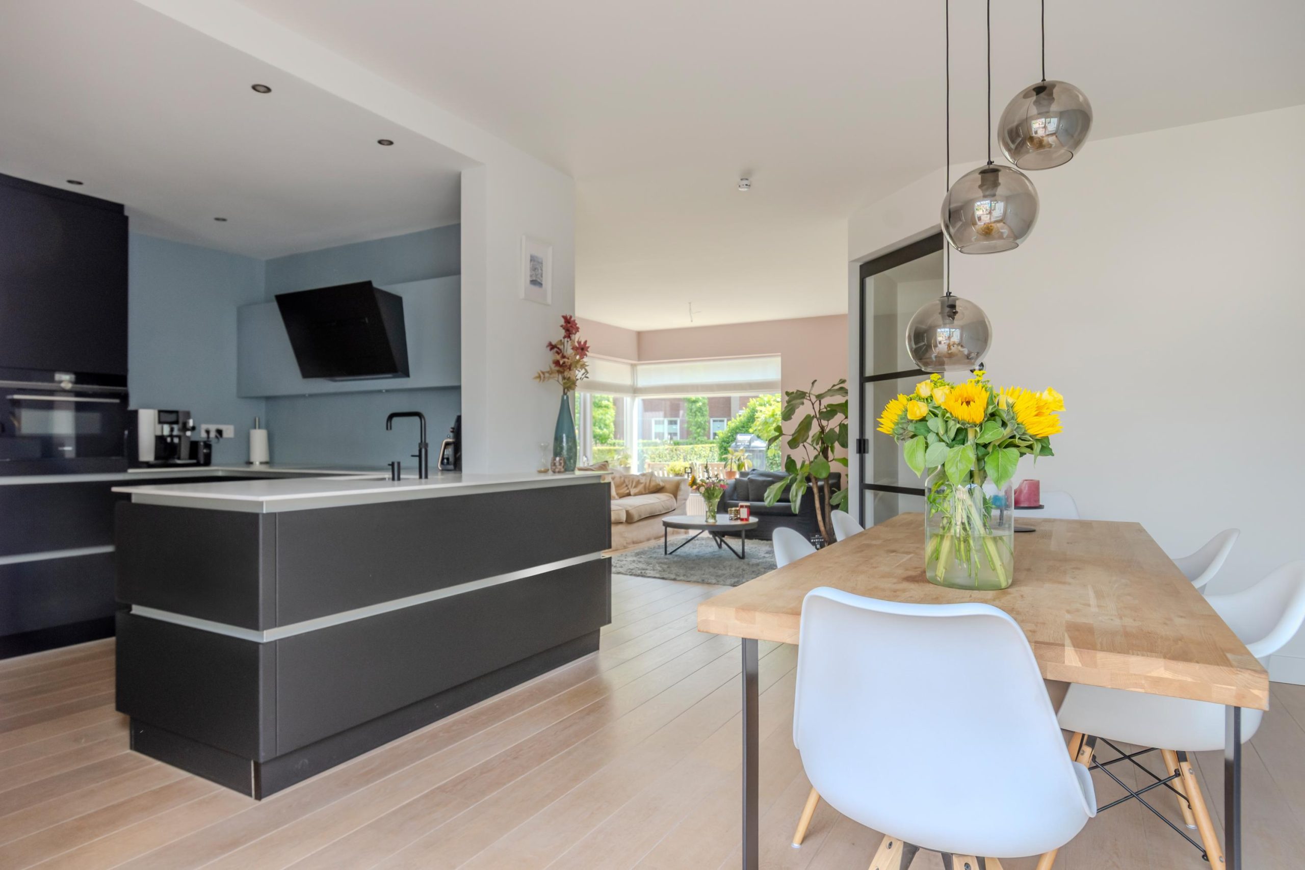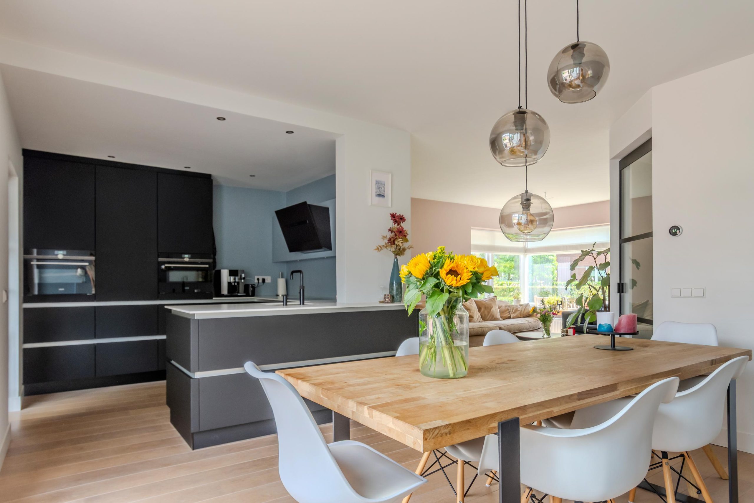 Bij binnenkomst in de woning word je verwelkomd in een lichte hal die toegang biedt tot een royale en recent vernieuwde woonkeuken. Deze keuken is voorzien van hoogwaardige Siemens inbouwapparatuur, waaronder een stoomoven en