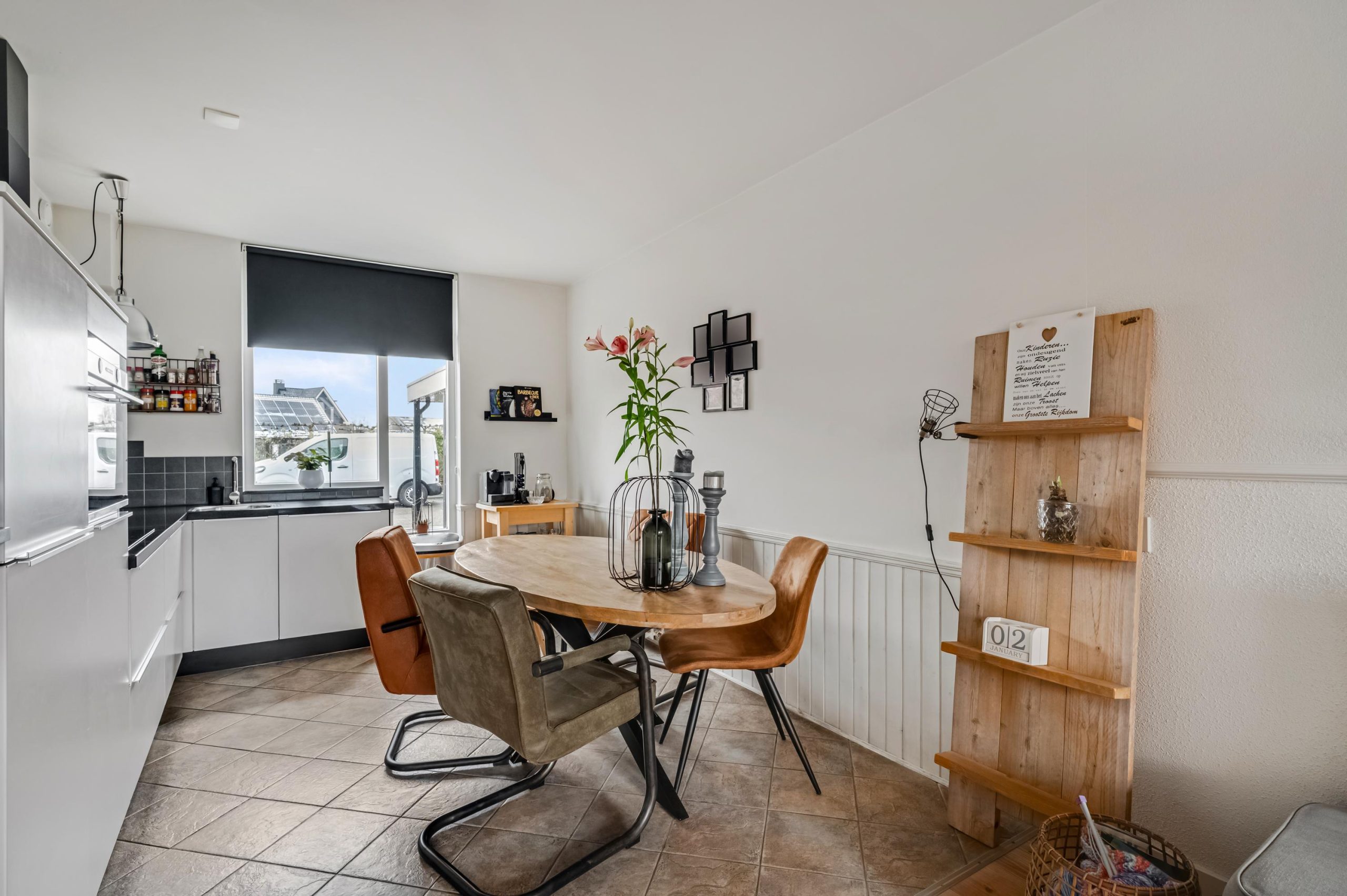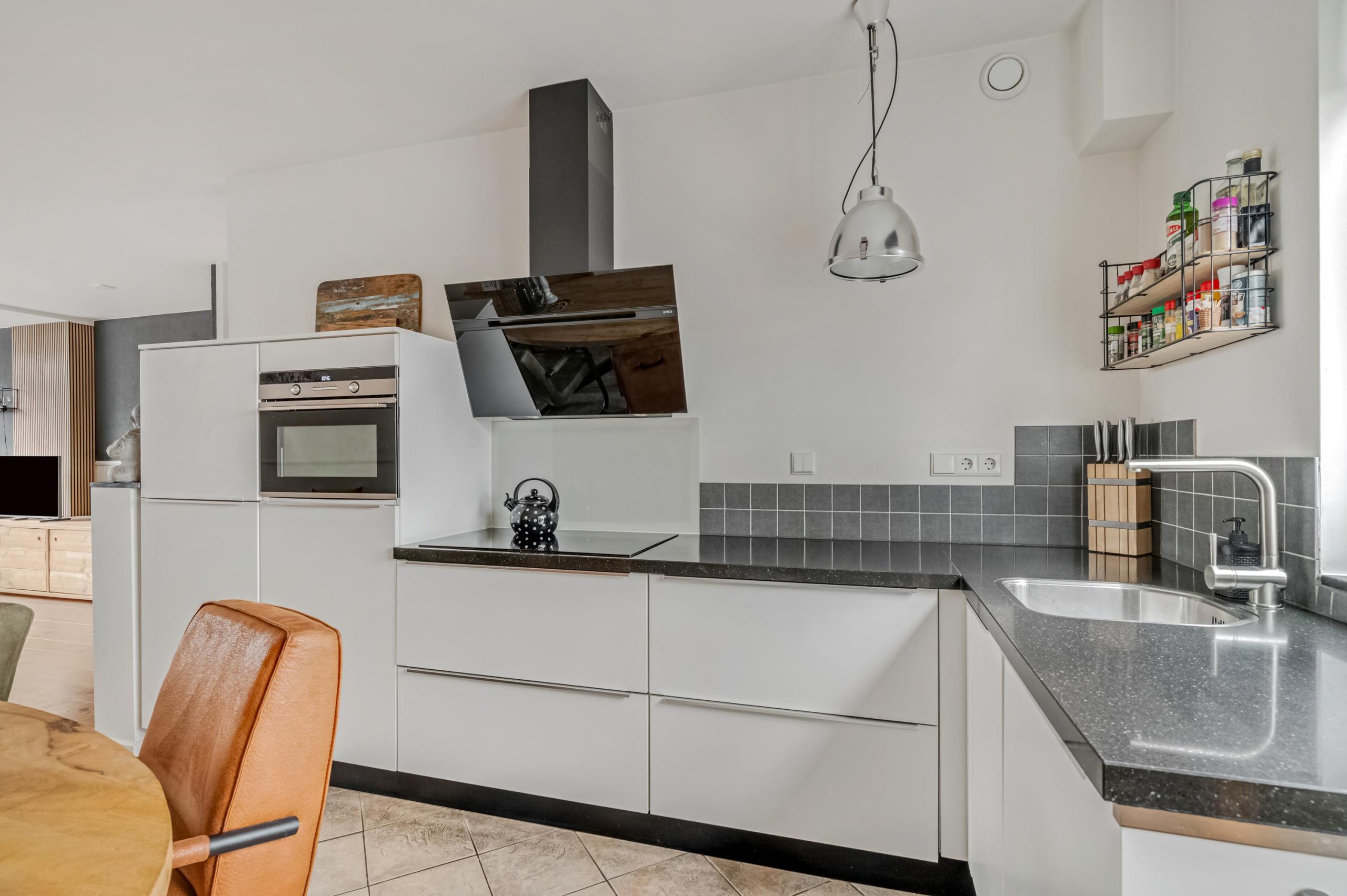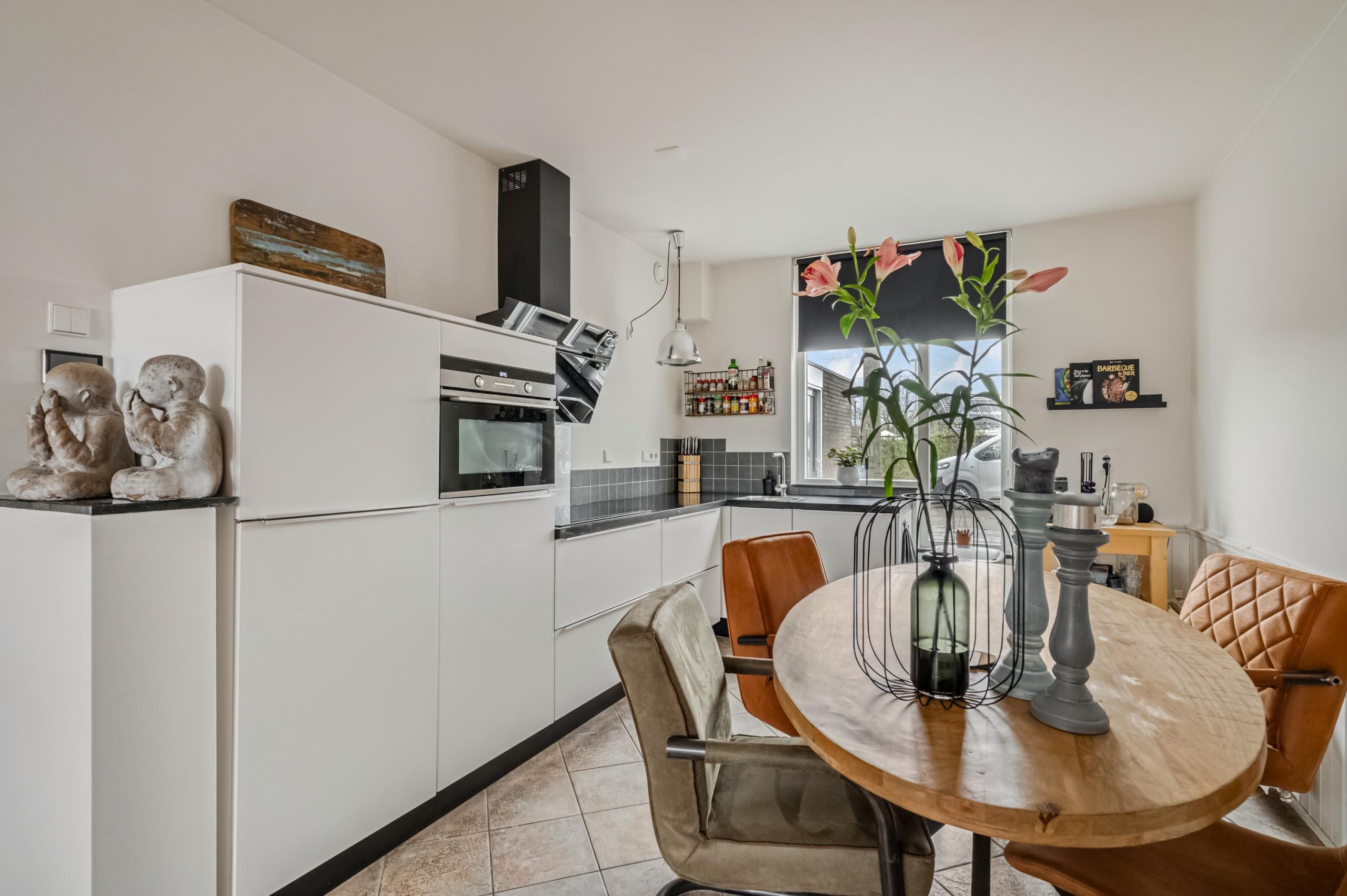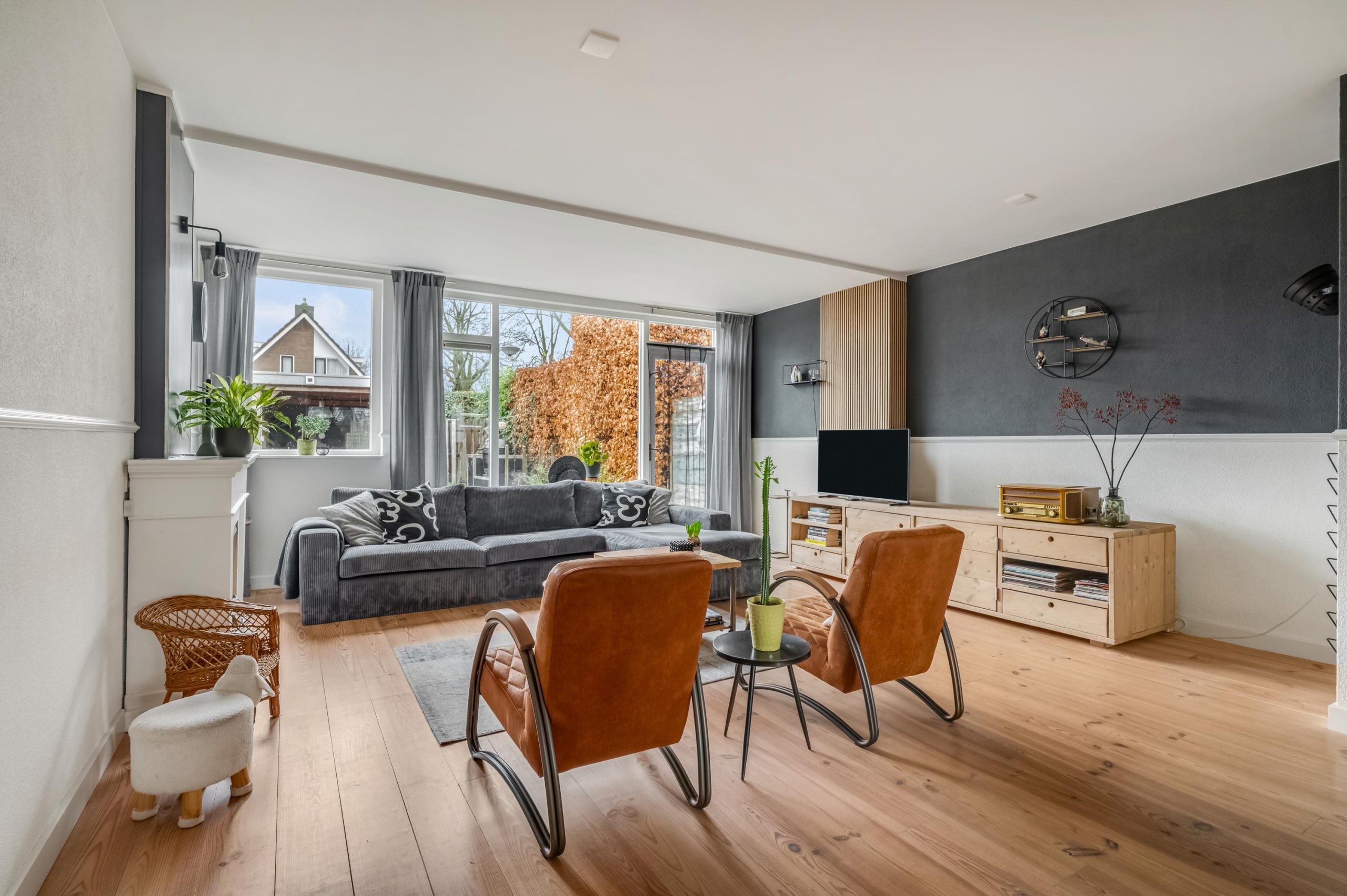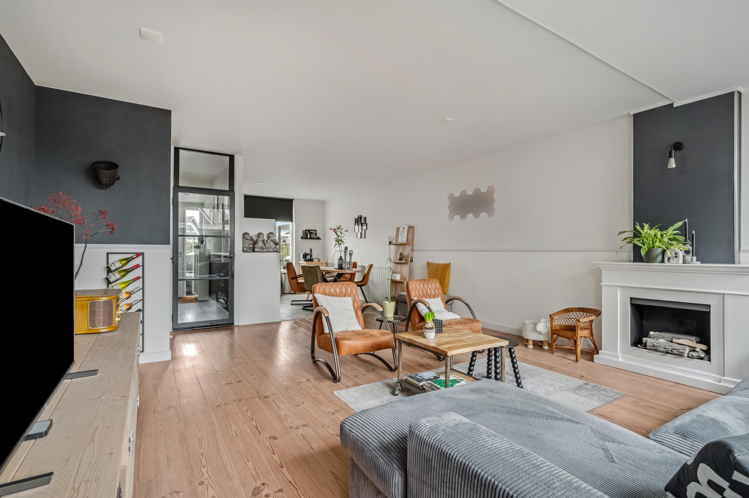 Via de hal met toilet en meterkast bereik je de royale woonkamer. De uitbouw aan de achterzijde maakt deze leefruimte bijzonder ruim en licht. Grote raampartijen zorgen voor een prettige connectie met de tuin, en de strakke afwerking, zoals de houten vloer, strak gestuct plafond, fraaie glasdeur en moderne kleurstelling, geven de ruimte een warme, eigentijdse sfeer. De moderne open keuken aan de voorzijde is uitgerust met diverse inbouwapparatuur, waaronder een inductiekookplaat, afzuiging, oven en koelkast.