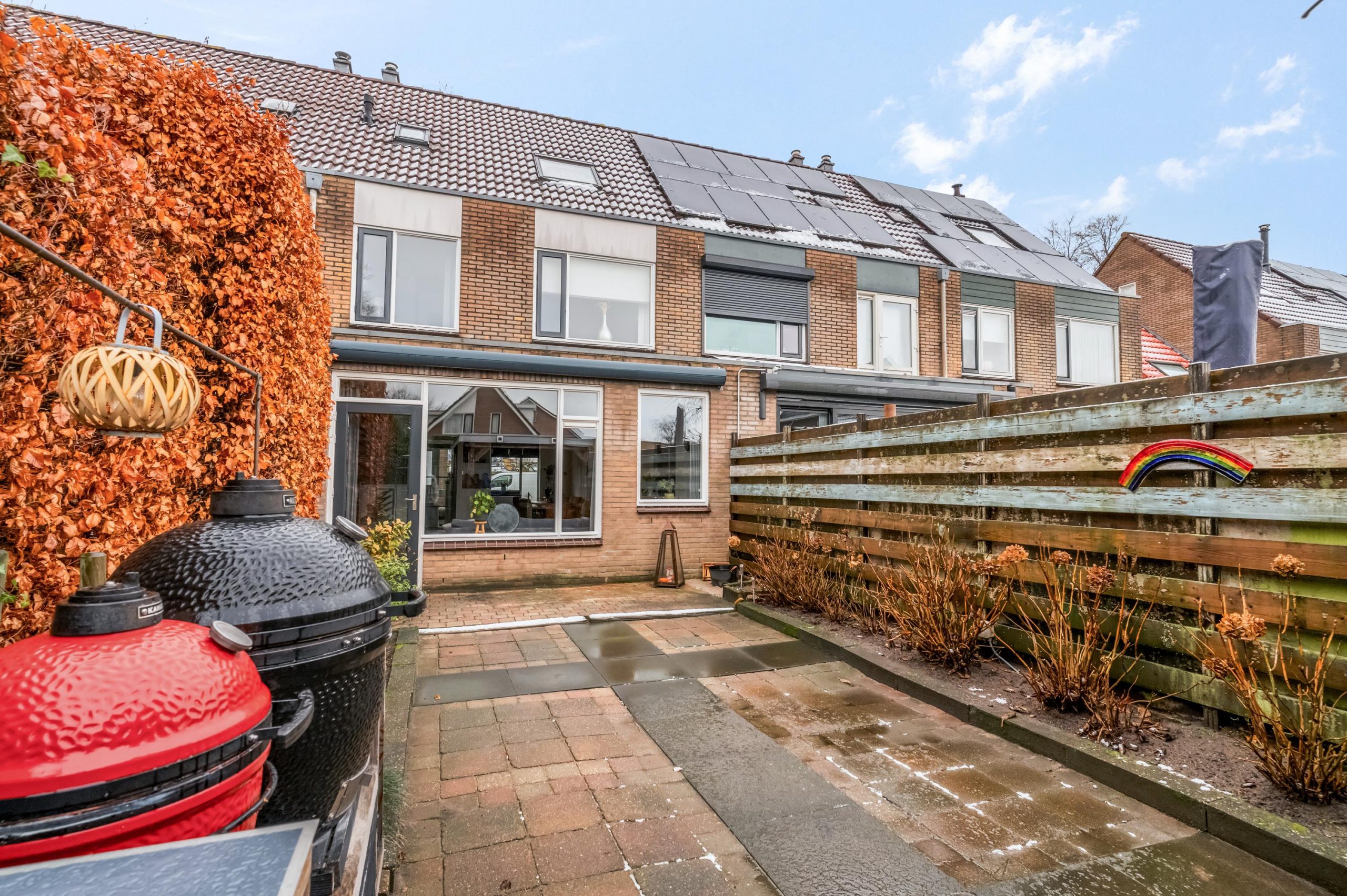 De achtertuin is gelegen op het zuidwesten, waardoor je hier van vroeg in het voorjaar tot laat in het najaar volop van de zon geniet. De veranda is de plek om heerlijk buiten te zitten, ongeacht het weer. De tuin is bereikbaar via achterom.