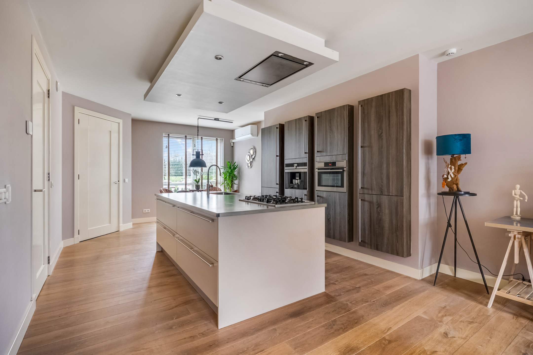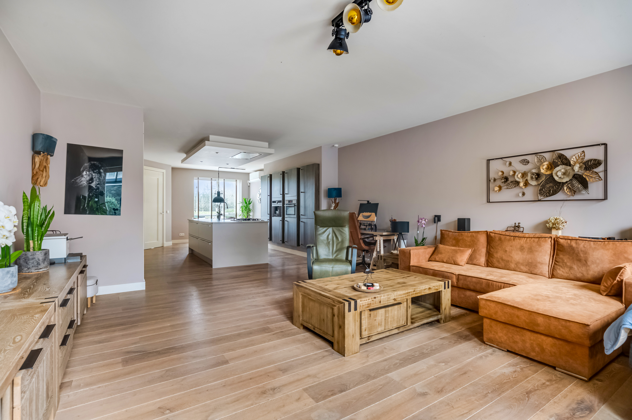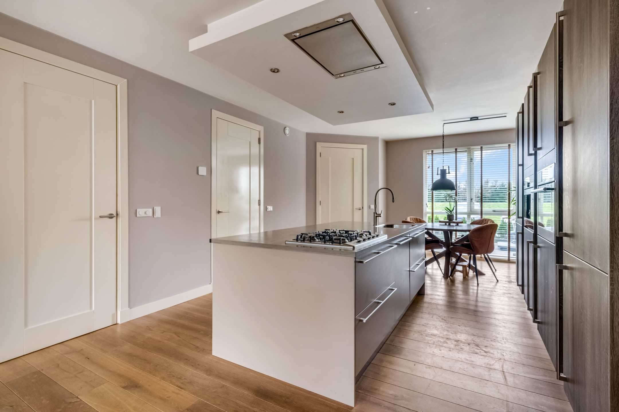 De hal biedt toegang tot het toilet en de moderne leefruimte. De ruime woonkamer is afgewerkt met een warme houten vloer, strakke wanden en plafond en grote raampartijen die zorgen voor een fijne lichtinval. De open woonkeuken aan de voorzijde is een absolute eyecatcher: uitgevoerd in moderne tinten en voorzien van een groot kookeiland, luxe inbouwapparatuur en veel kastruimte. Bij de royale, tot de grond reikende raampartijen is een knusse eethoek gecreëerd.