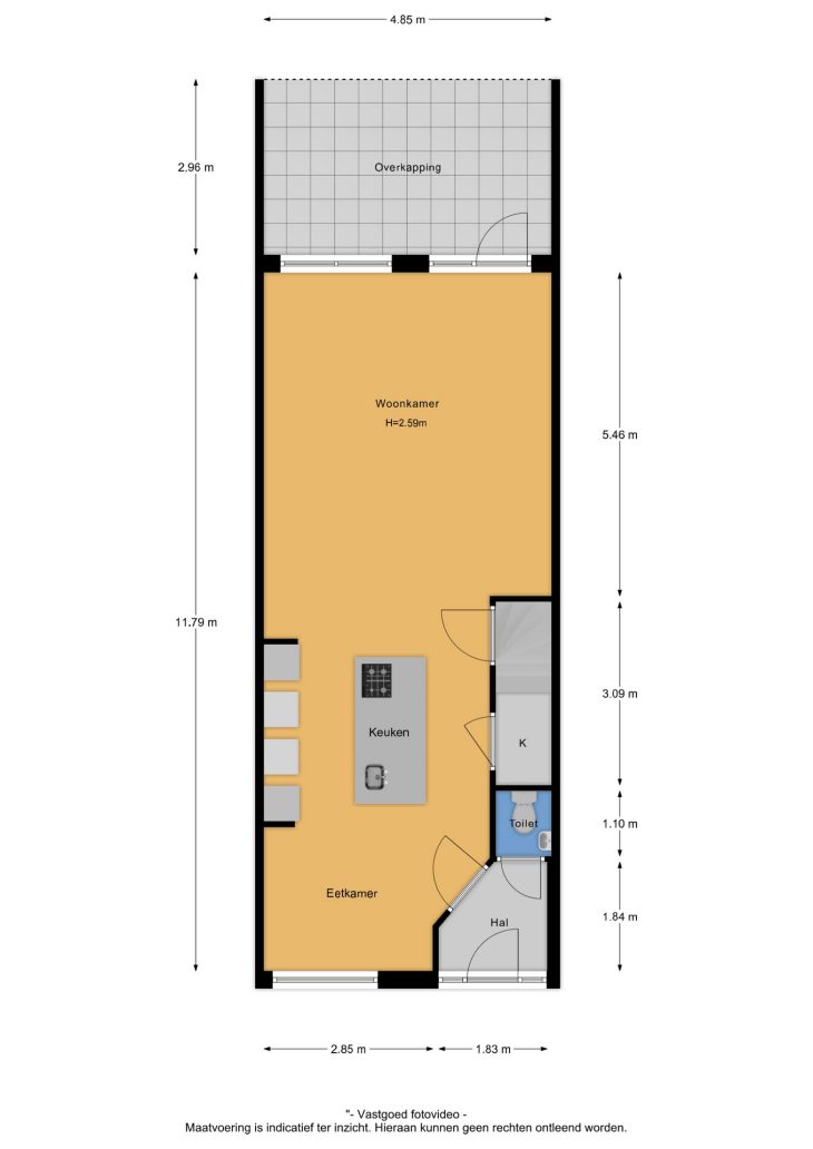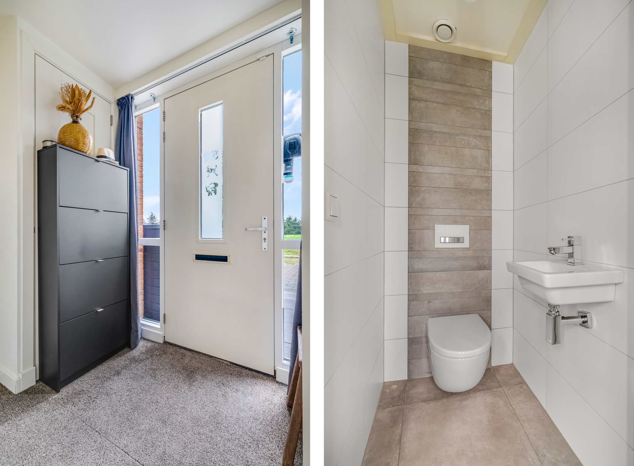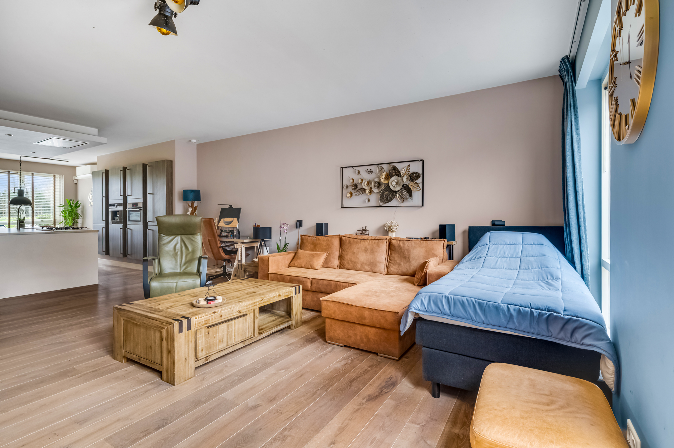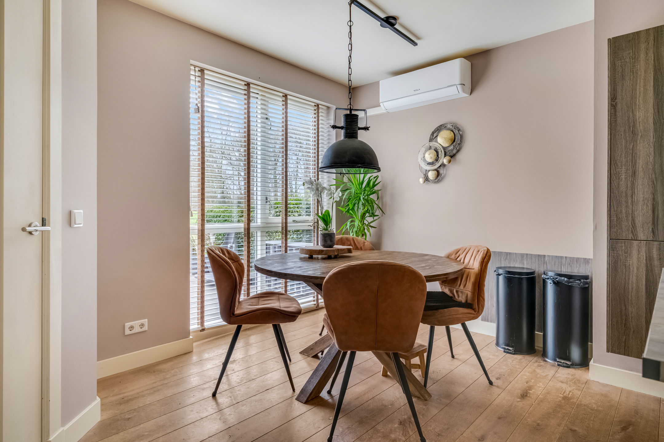 De hal biedt toegang tot het toilet en de moderne leefruimte. De ruime woonkamer is afgewerkt met een warme houten vloer, strakke wanden en plafond en grote raampartijen die zorgen voor een fijne lichtinval. De open woonkeuken aan de voorzijde is een absolute eyecatcher: uitgevoerd in moderne tinten en voorzien van een groot kookeiland, luxe inbouwapparatuur en veel kastruimte. Bij de royale, tot de grond reikende raampartijen is een knusse eethoek gecreëerd.