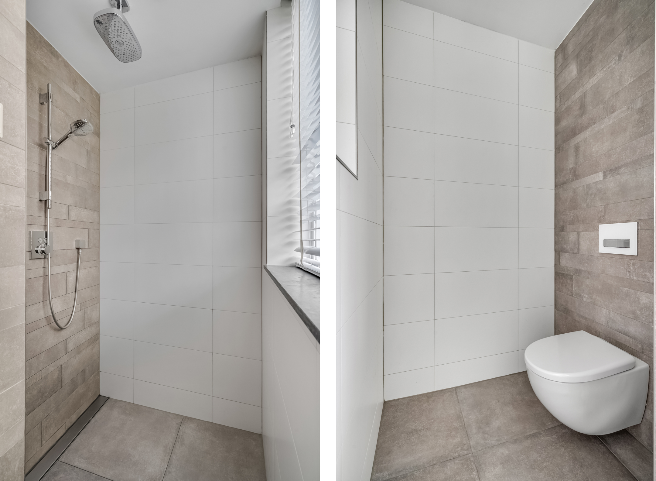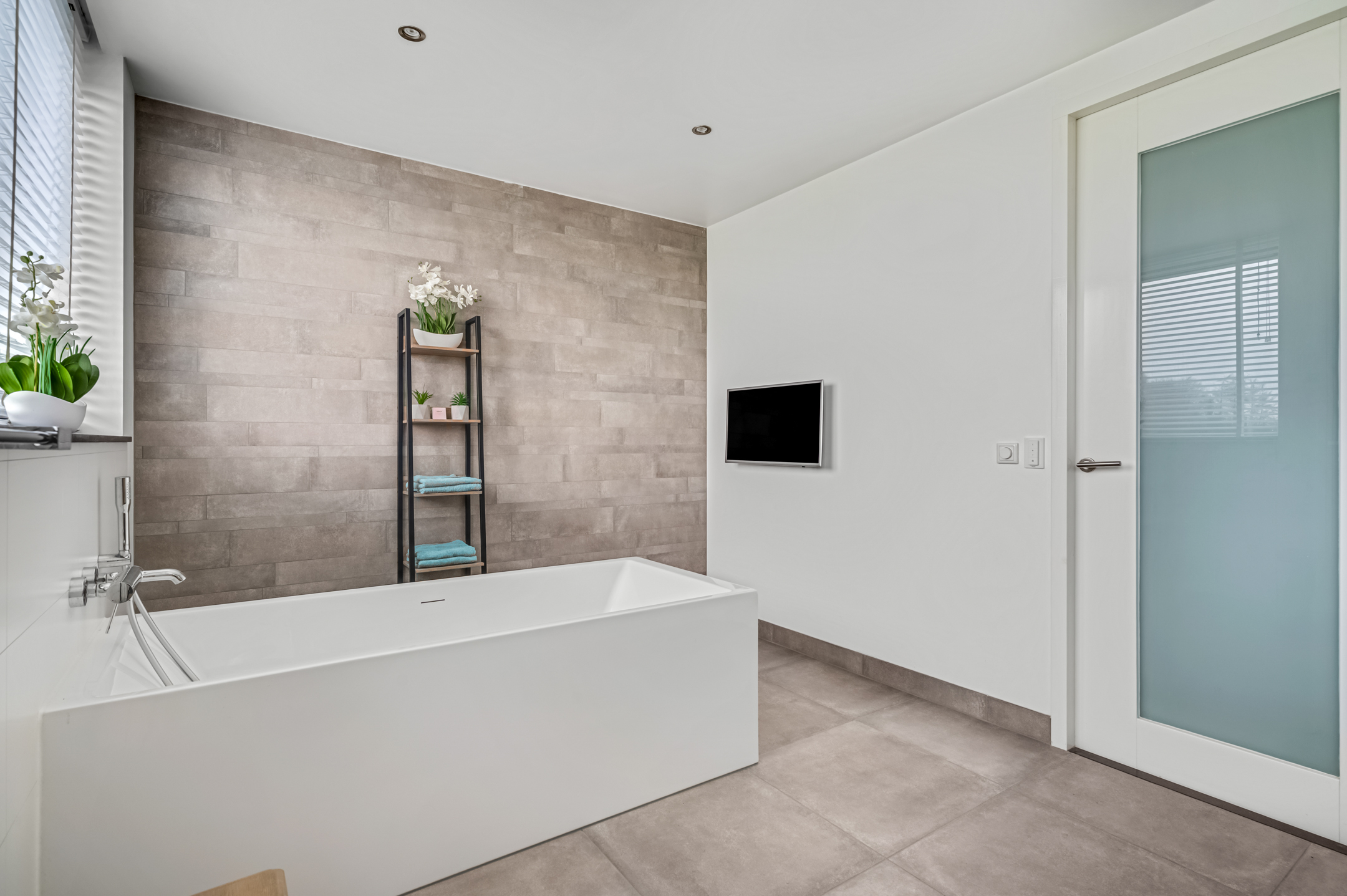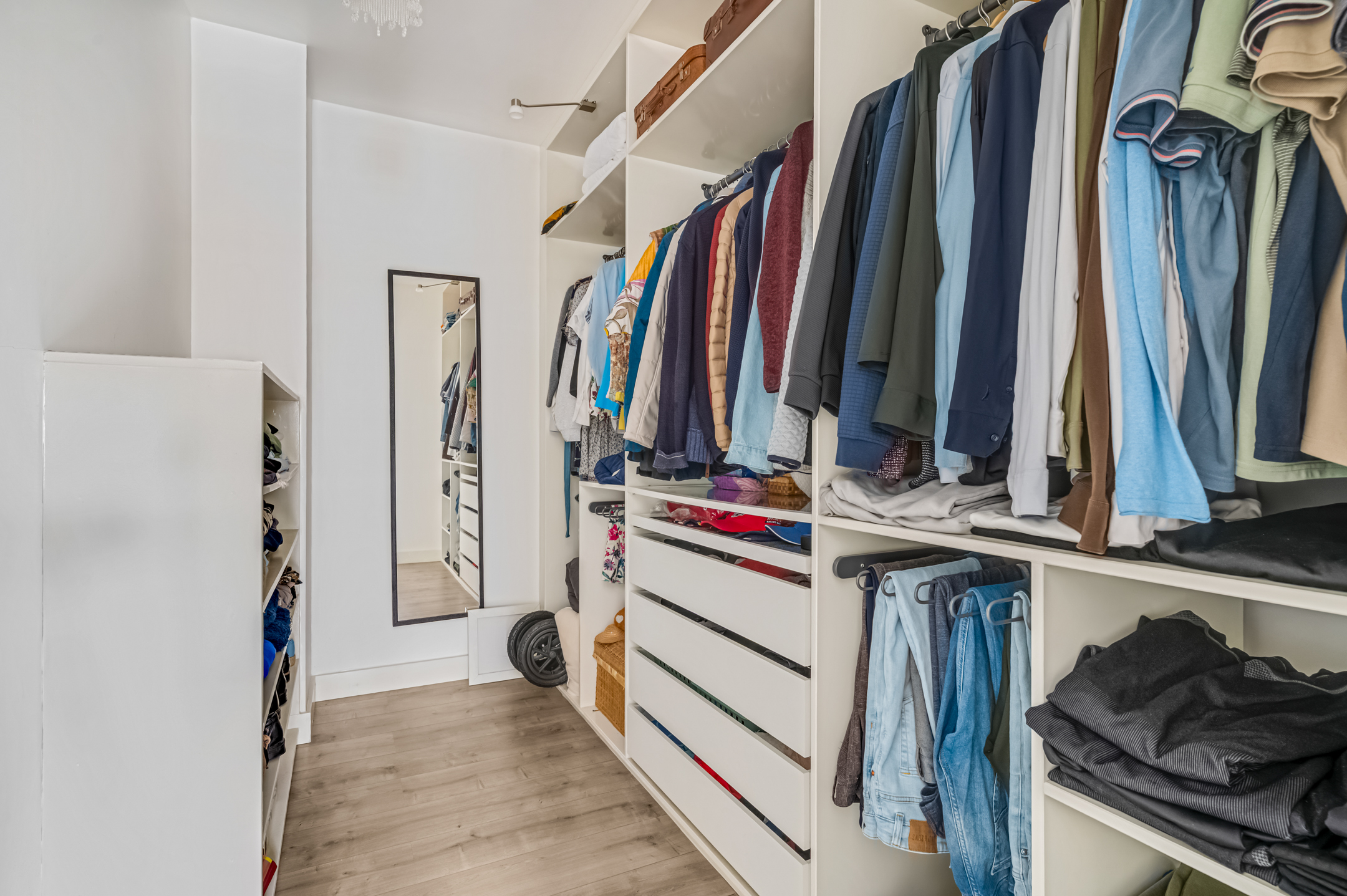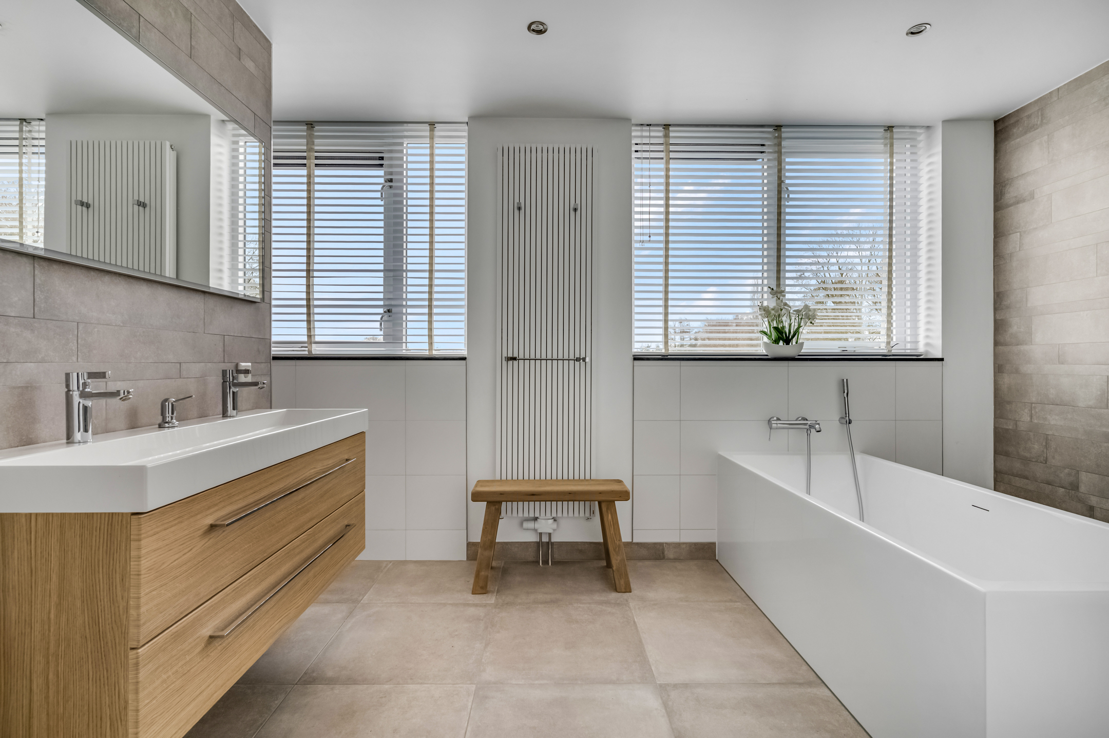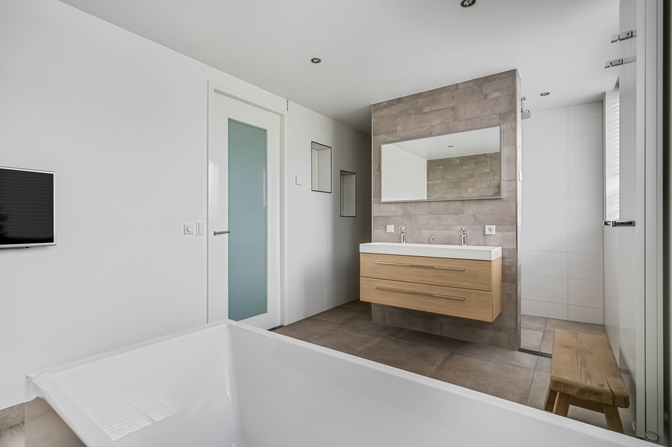 Overloop met toegang tot de master bedroom. Deze is ingericht met een zeer royale inloopkast, een droom voor elke kledingliefhebber. De luxe badkamer is stijlvol en ruim: voorzien van een ligbad, een dubbele wastafel, een wandradiator, vloerverwarming en een royale inloopdouche. Dankzij de brede raampartijen is ook hier veel daglicht aanwezig, wat de ruimte een fijne sfeer geeft.