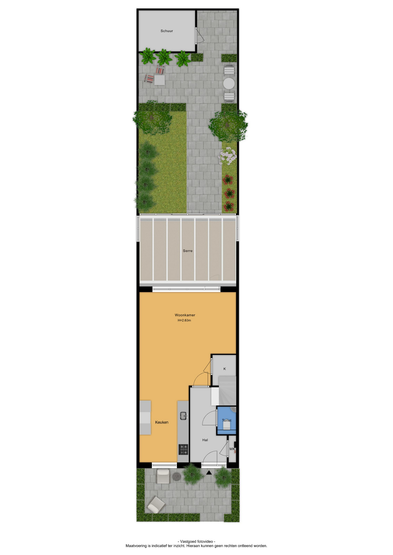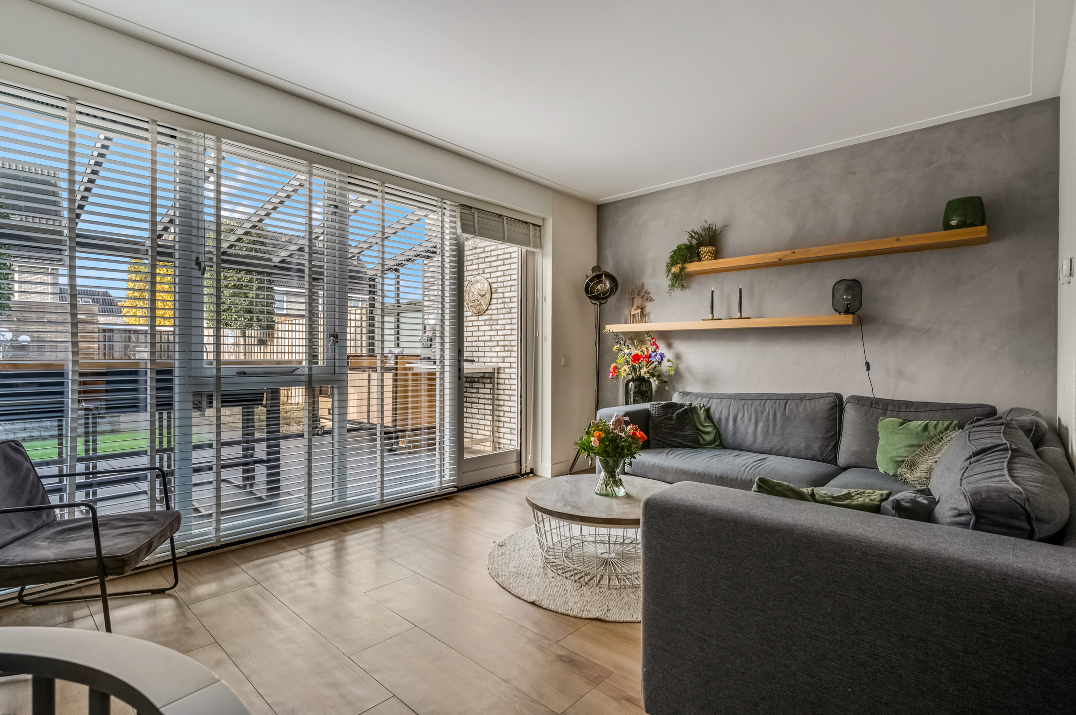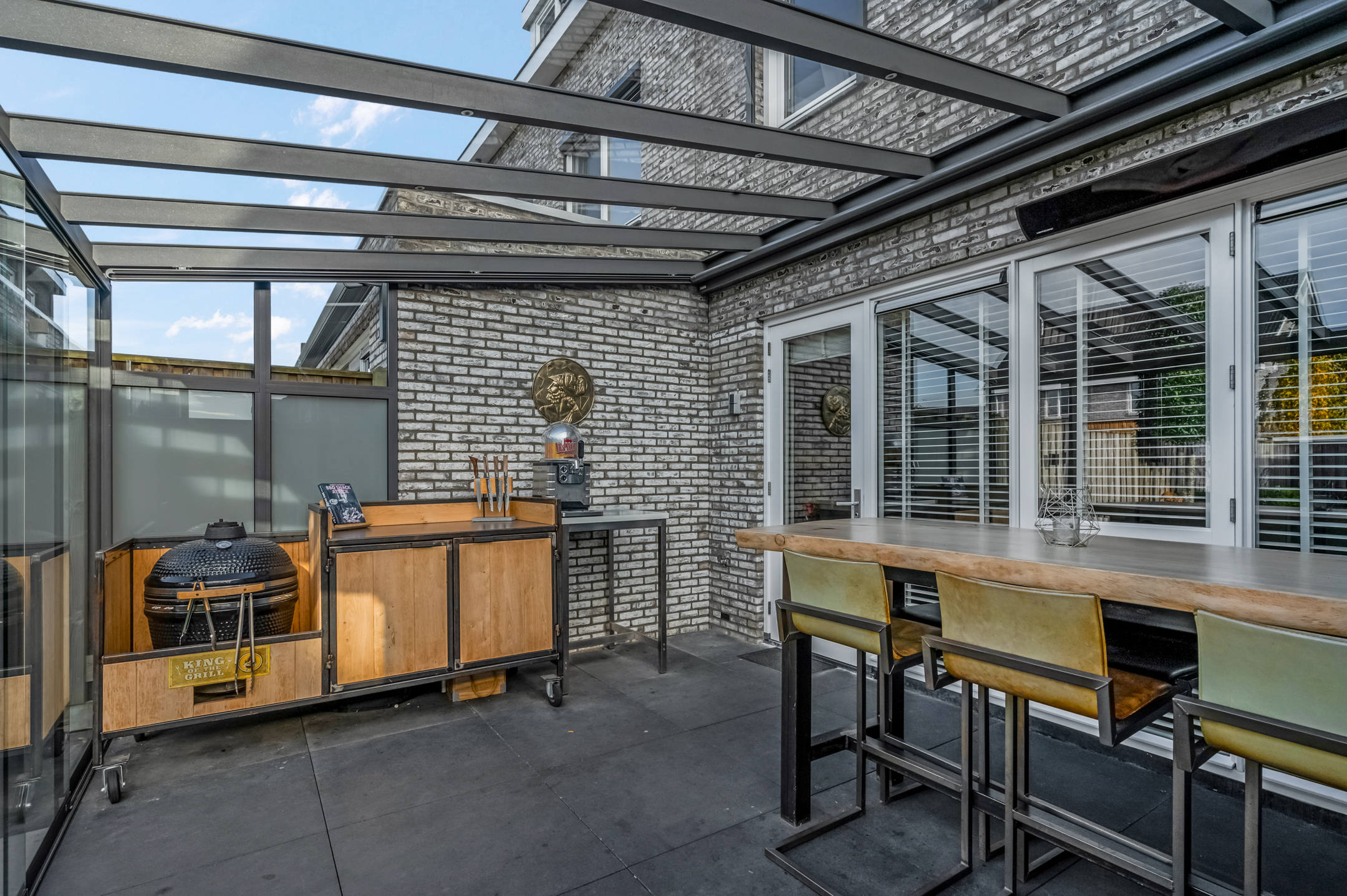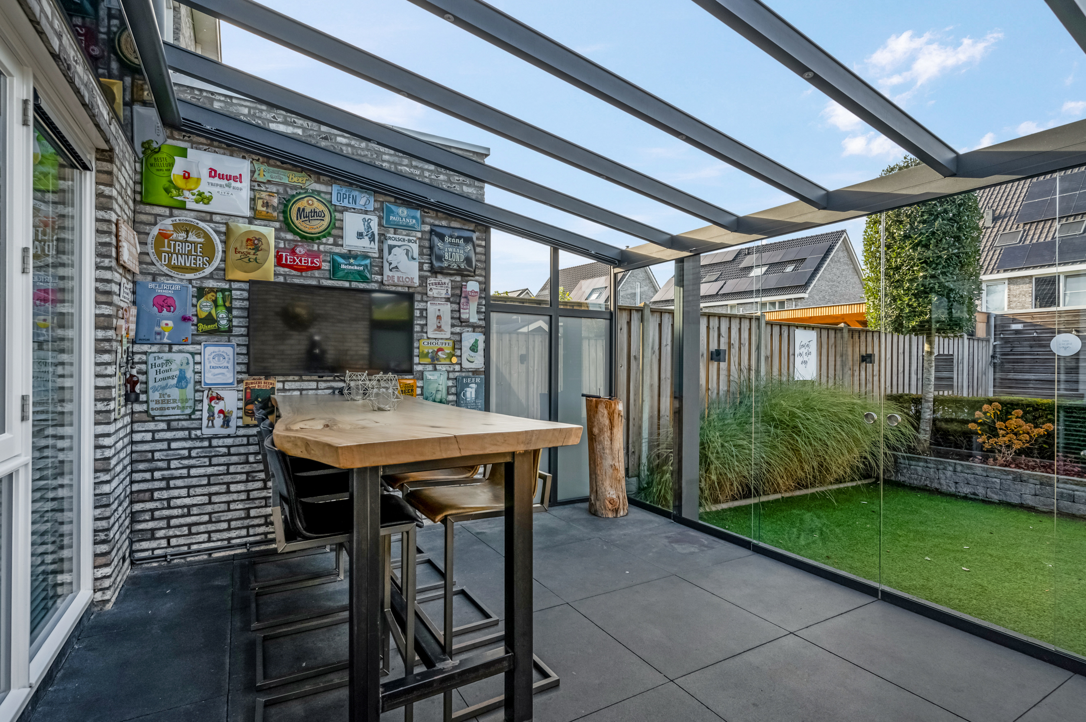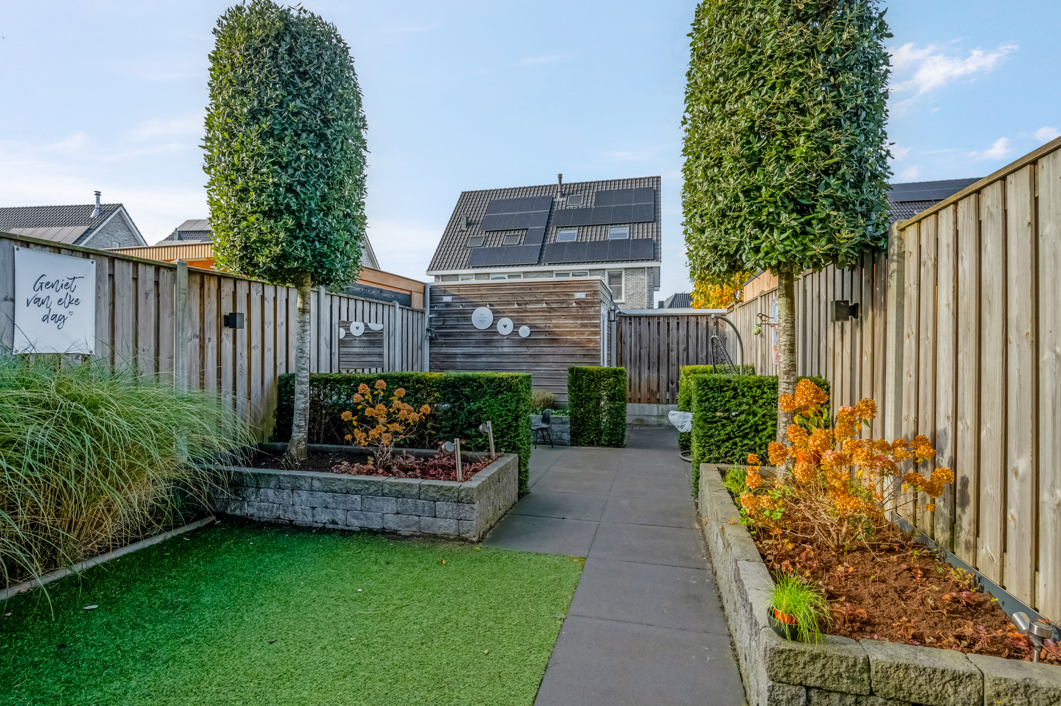 De achtertuin is verzorgd en onderhoudsarm, met kunstgras, borders en een gezellige zithoek achterin. De serre aan de woning maakt het geheel tot een sfeervolle plek om te ontspannen. Achterin bevindt zich een houten berging en een achterom.