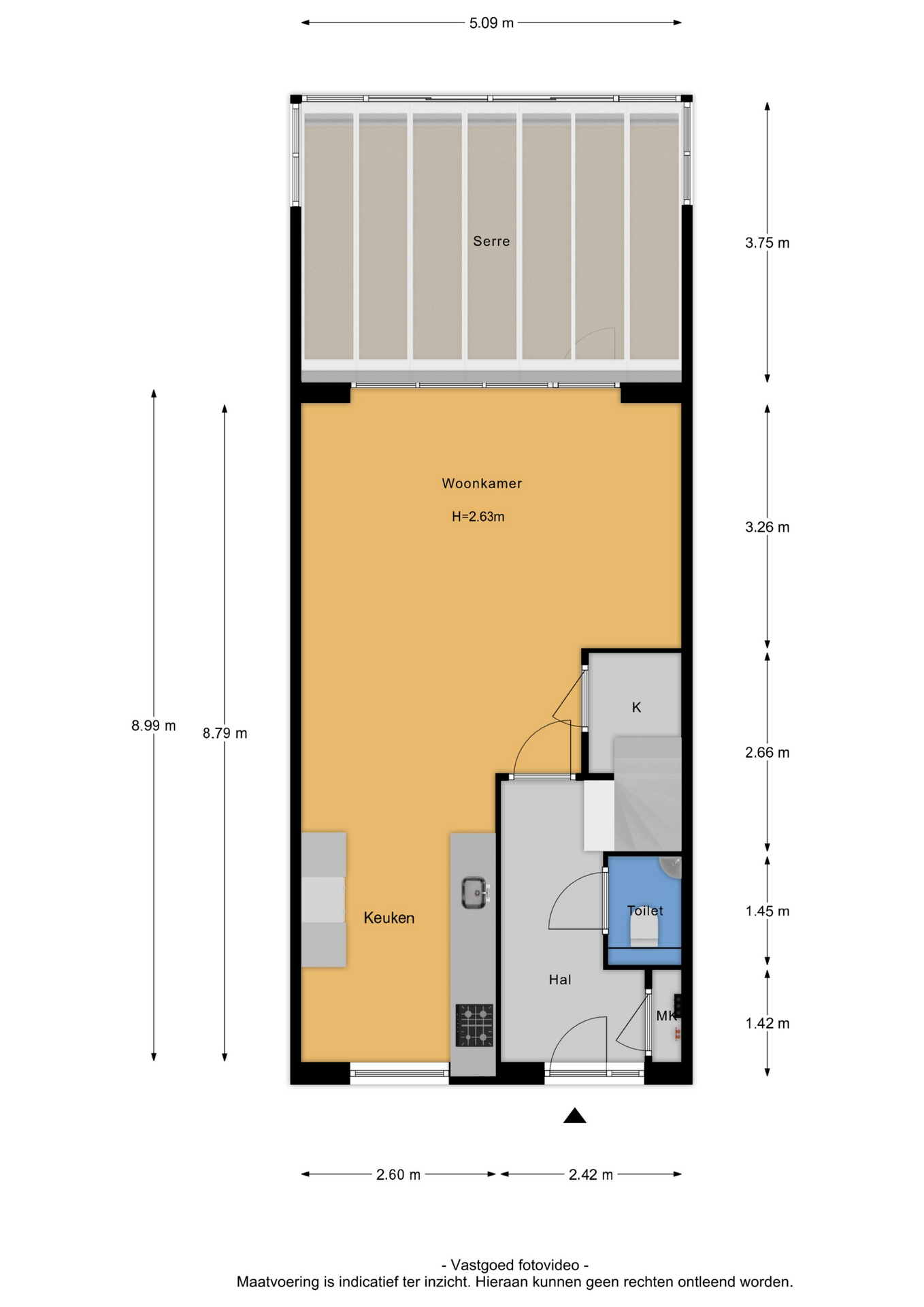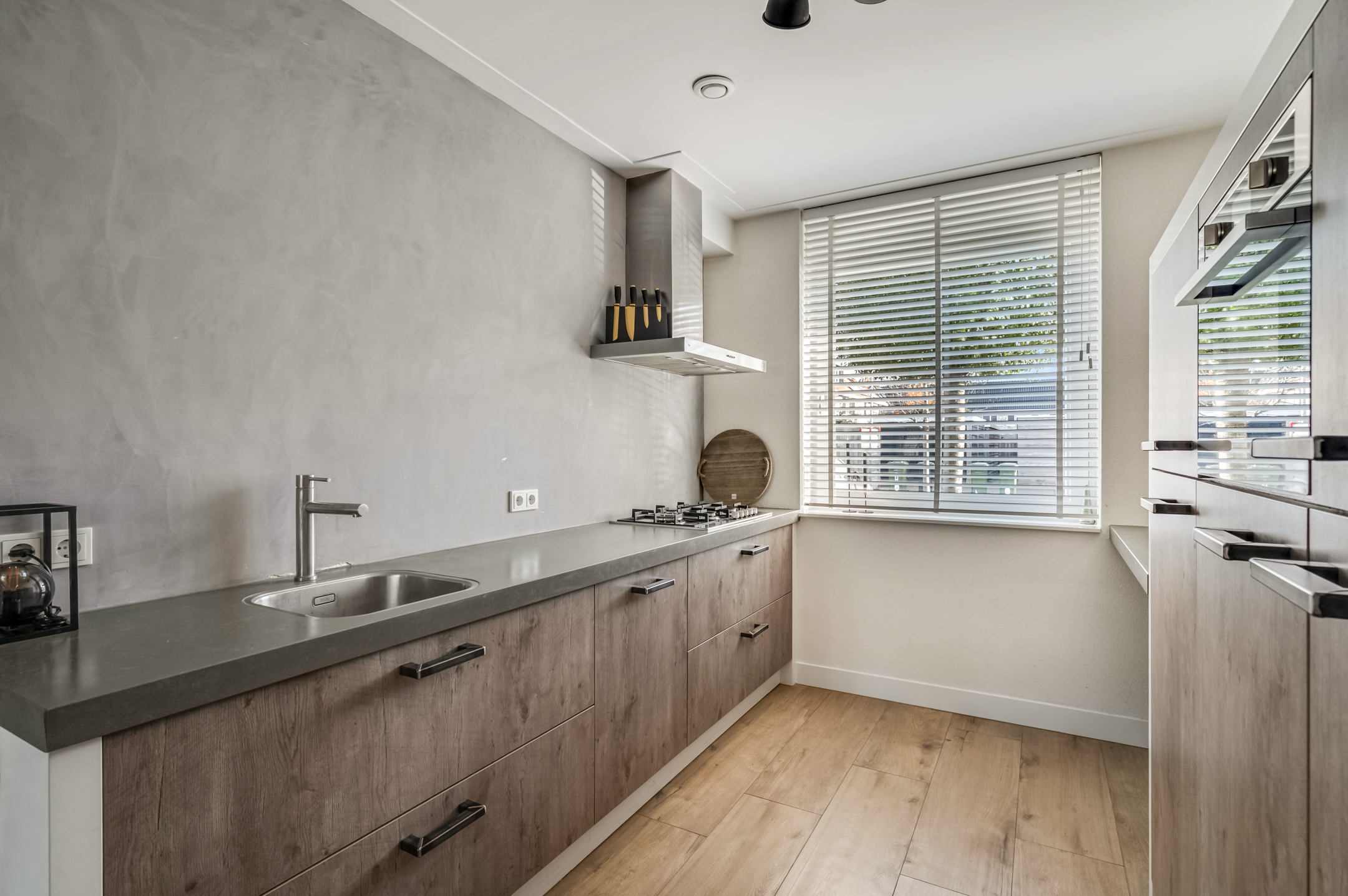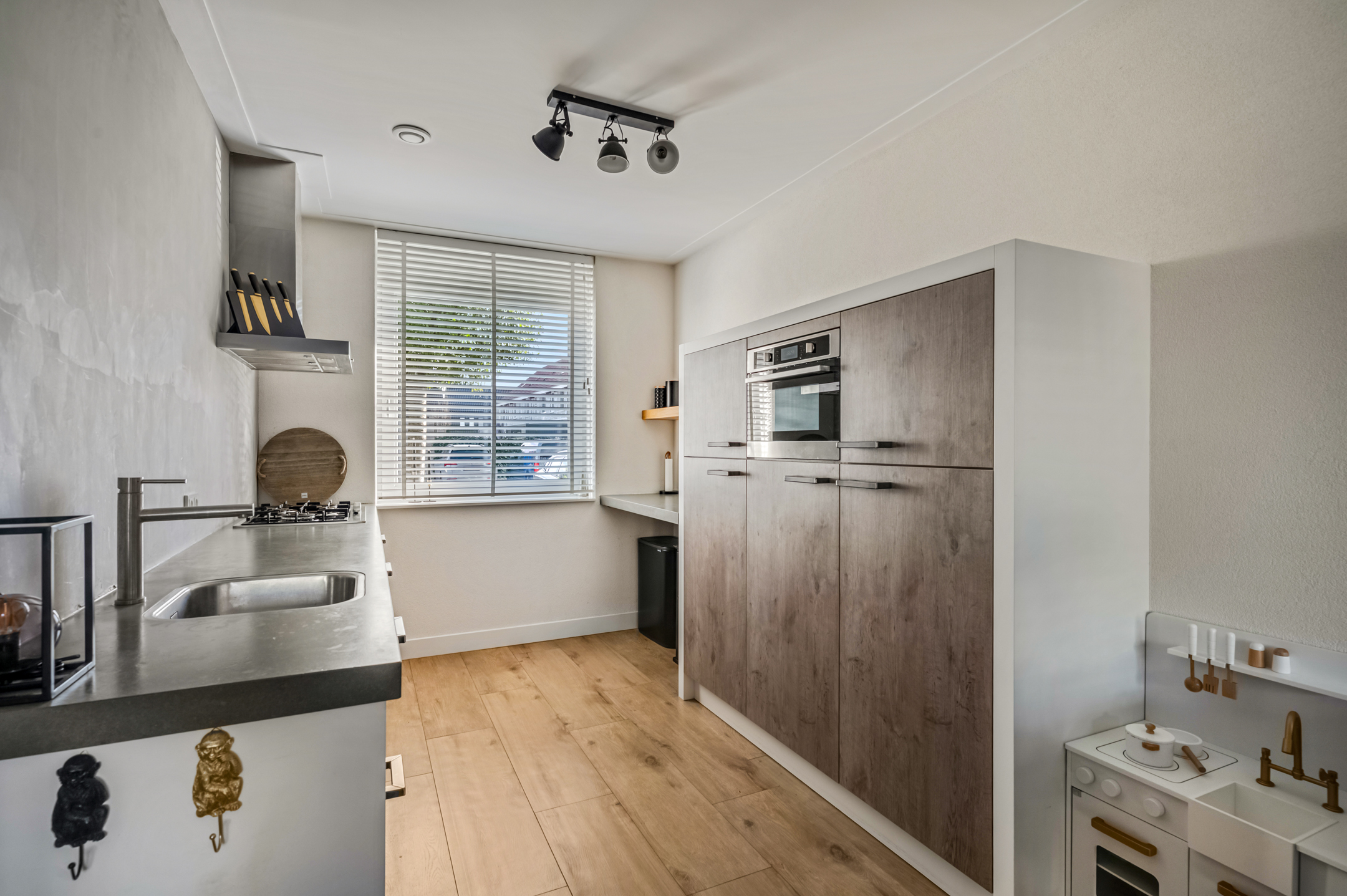 Entree, hal met toilet, meterkast en trapopgang. De lichte woonkamer is fraai afgewerkt met een keurige vloer, gestucte plafond-/wanden en voorzien van een cinewall met gashaard, ideaal voor sfeervolle avonden. Aan de achterzijde is een ruime serre met glazen schuifwanden toegevoegd, waardoor je hier het hele jaar door van het buitenleven kunt genieten. De open keuken aan de voorzijde heeft een moderne/stoere uitstraling en is uitgerust met diverse inbouwapparatuur, waaronder een gaskookplaat, afzuigkap, combi-oven, koelkast en vaatwasmachine.