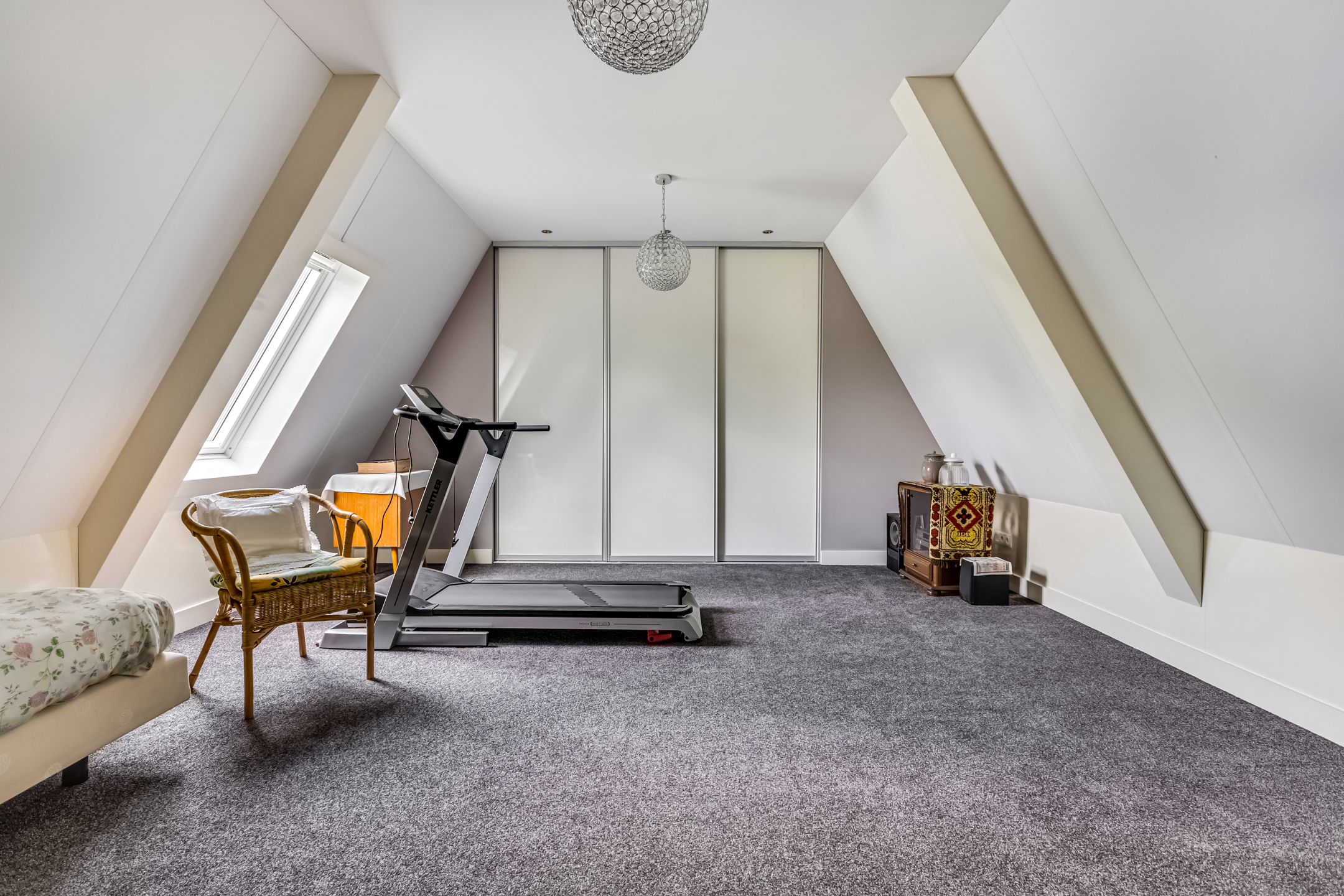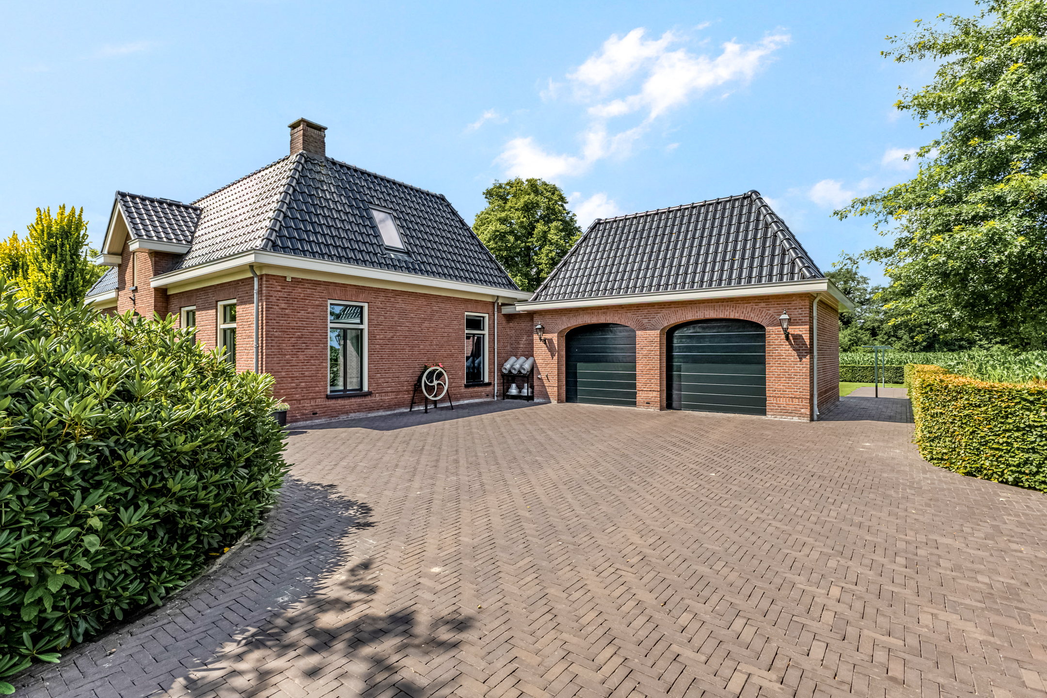 Zowel de garage als de hal hebben een achter entree. De ruime dubbele garage beschikt over automatisch op afstand bedienbare Horrmann deuren, een vaste kastenwand voorzien van een koel-/vriescombinatie, (stoom)oven en opstelplaats voor het stofzuigsysteem. Tot slot is er een zolderruimte welke bereikbaar is middels een vlizotrap.