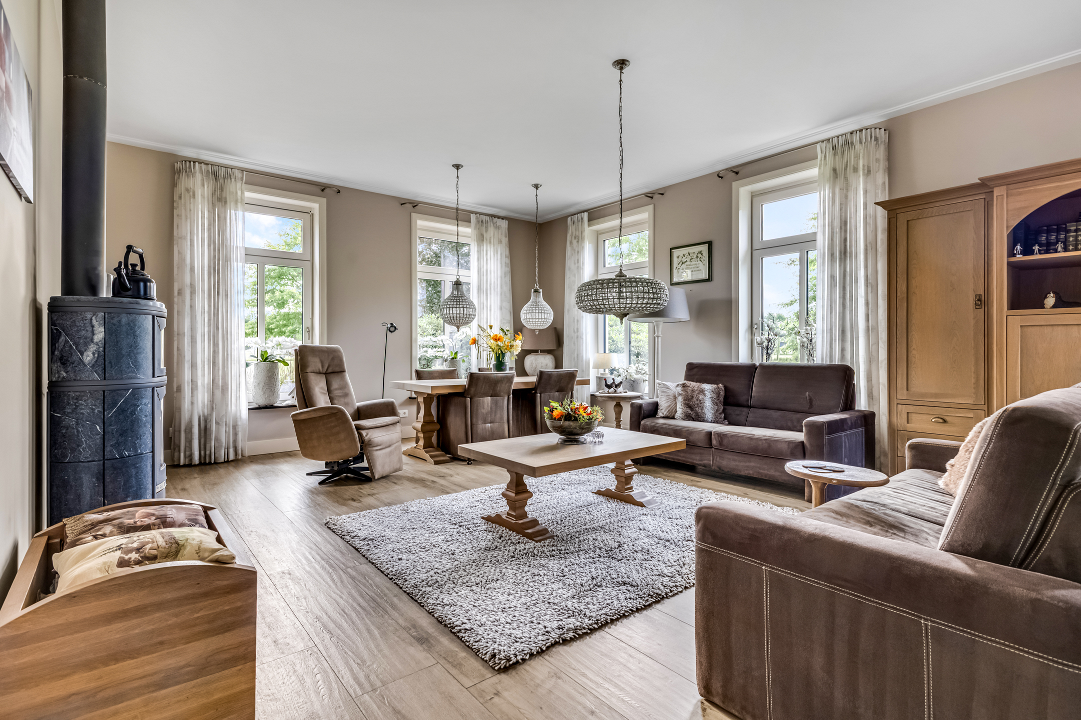 Aan de voorzijde van de woning is de ruime woonkamer gelegen, voorzien van een spekkachel. De woonkamer is en suite verbonden met de keuken en heeft ook dubbele openslaande deuren naar de hal.