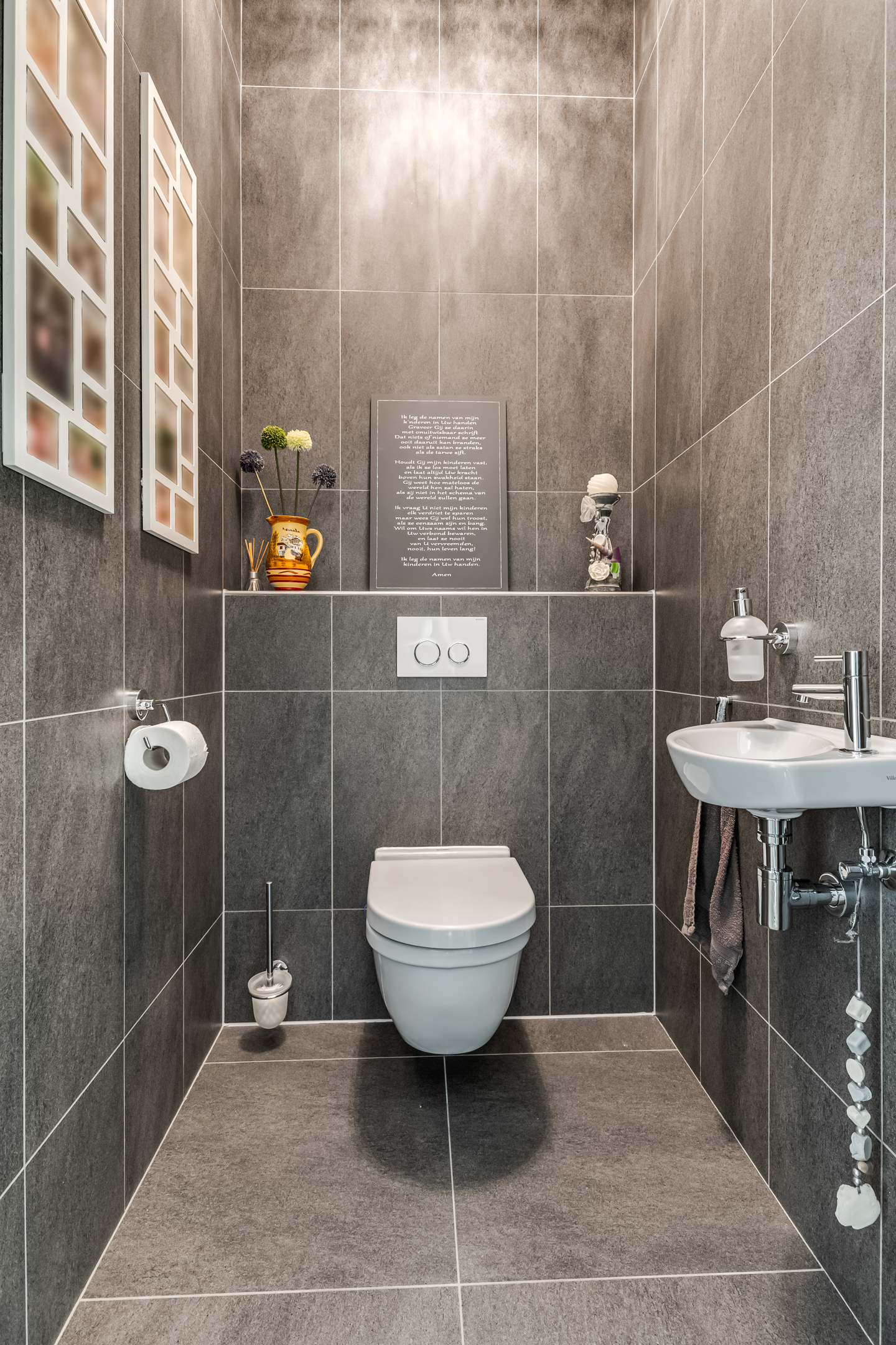 Op de begane grond bevindt zich een slaapkamer met aansluitend een ruime badkamer met ligbad, inloopdouche, wasmeubel, toilet en decorradiator om de handdoeken te drogen. Daarnaast is er ook een separaat toilet.