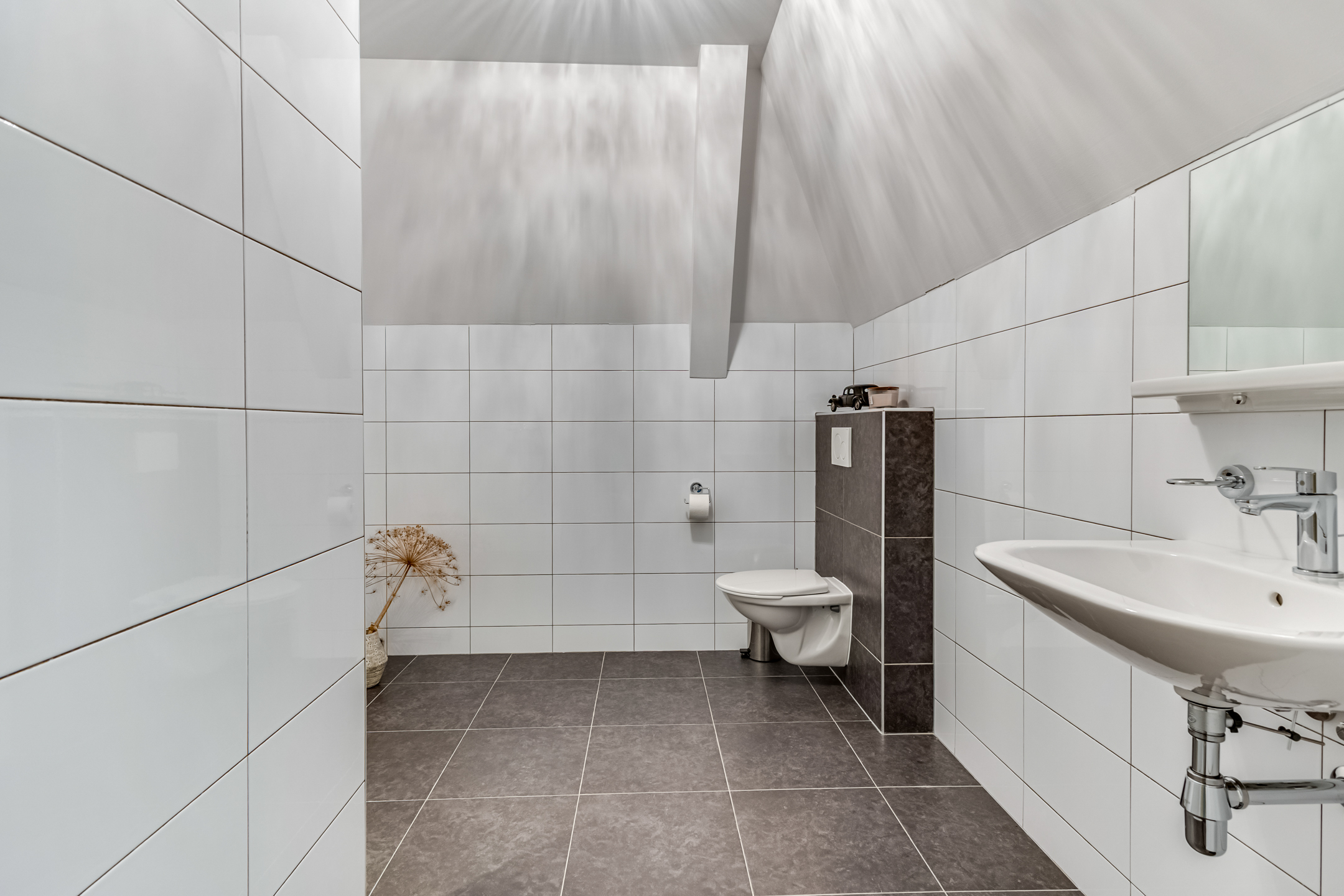 Ook bevindt zich op de verdieping een tweede badkamer in neutrale kleurstelling. Deze beschikt over een douche, wastafel en toilet.