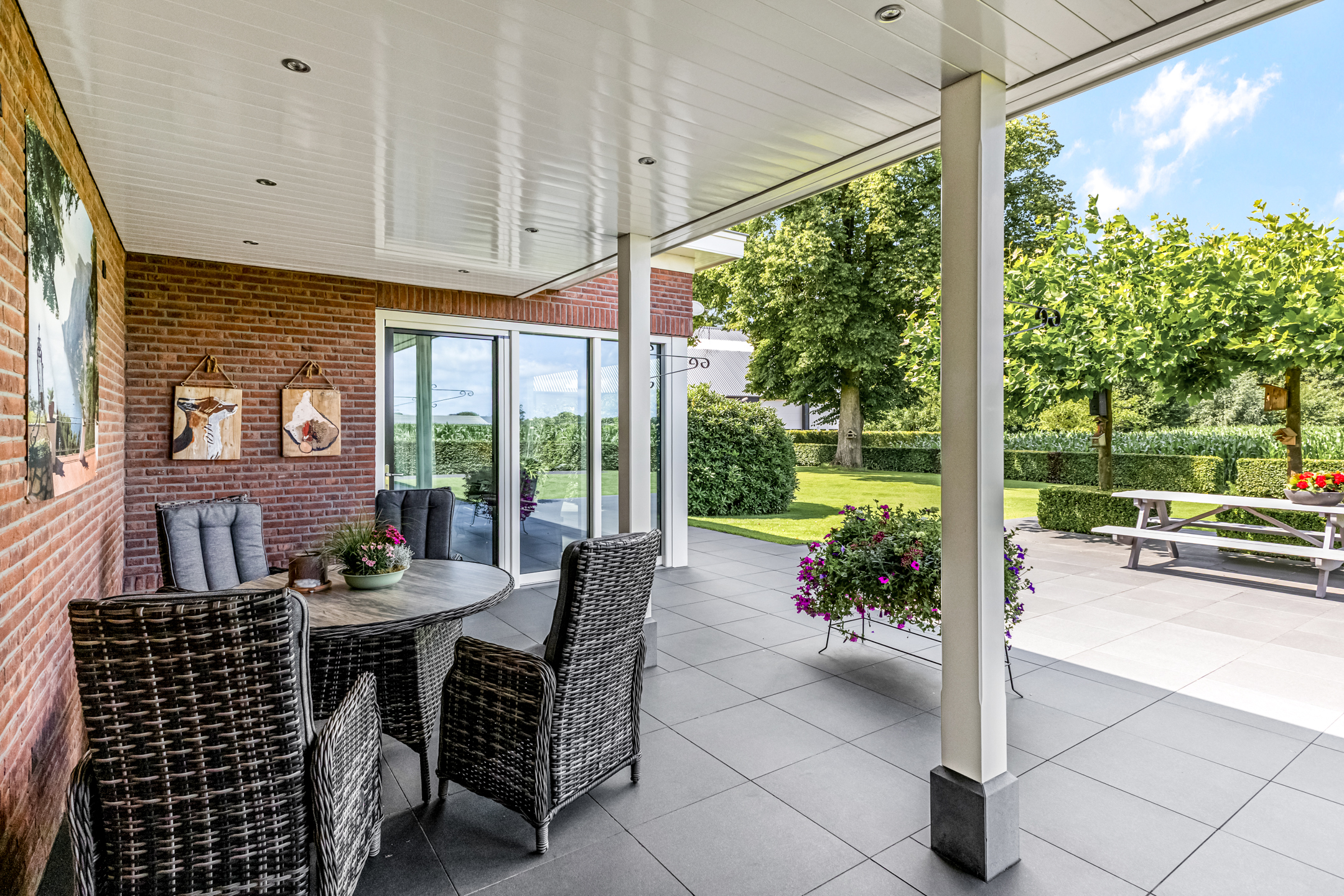 Het landelijke keukenblok met granieten blad is van alle gemakken voorzien, zoals onder andere een inductie-kookplaat, afzuigkap, heteluchtoven/magnetron, vaatwasser en koelkast. De woonkeuken biedt voldoende ruimte voor het plaatsen van een grote eetkamertafel voor het hele gezin en staat via een grote schuifpui in verbinding met de tuin en overkapping. De grote schuifpui geeft niet alleen prachtig zicht op de tuin en achterliggende landerijen, maar ook veel lichtinval in de ruimte.