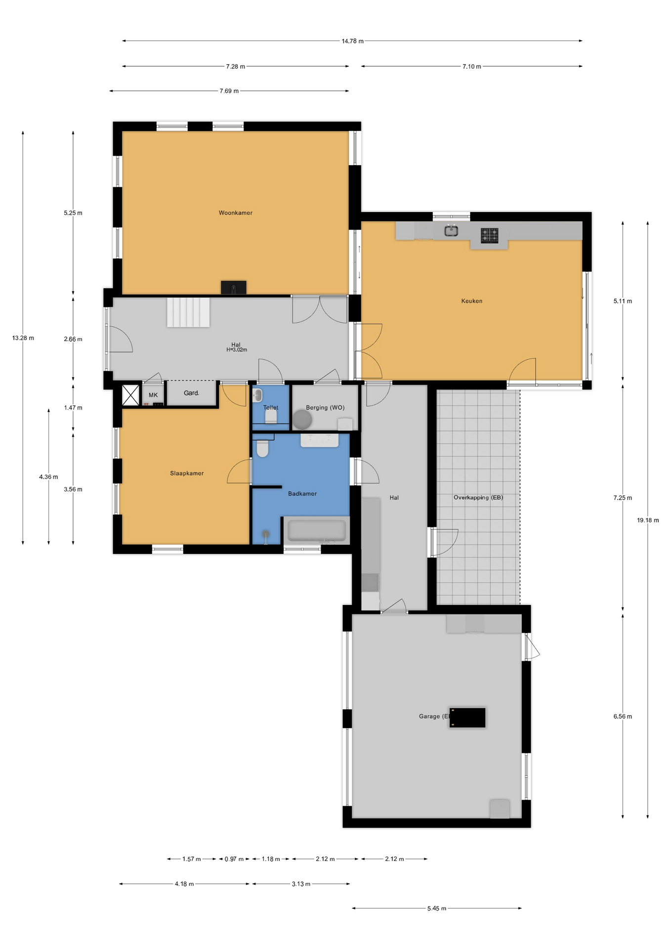 Aan de achterzijde van de woning verbindt een hal/bijkeuken de woning vanuit de keuken met de aangebouwde garage. In deze bijkeuken is er een vaste kastenwand geplaatst met aansluitingen voor de witgoedapperatuur.