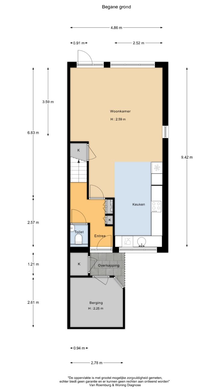 De woning beschikt over een ruime hal met een inbouwkast, toilet en trapopgang. De begane grond is ingericht met een grote open keuken aan de voorzijde, de keuken is voorzien van diverse inbouwapparatuur waaronder een inductiekookplaat, afzuigkap, oven, koel-vriescombinatie, vaatwasmachine en een Quooker. De keuken staat in open verbinding met de eethoek en de tuingerichte zithoek aan de achterzijde. Grote raampartijen zorgen voor een prettige lichtinval en bieden zicht op de achtertuin.
