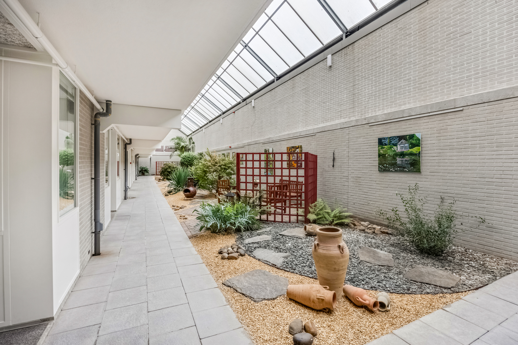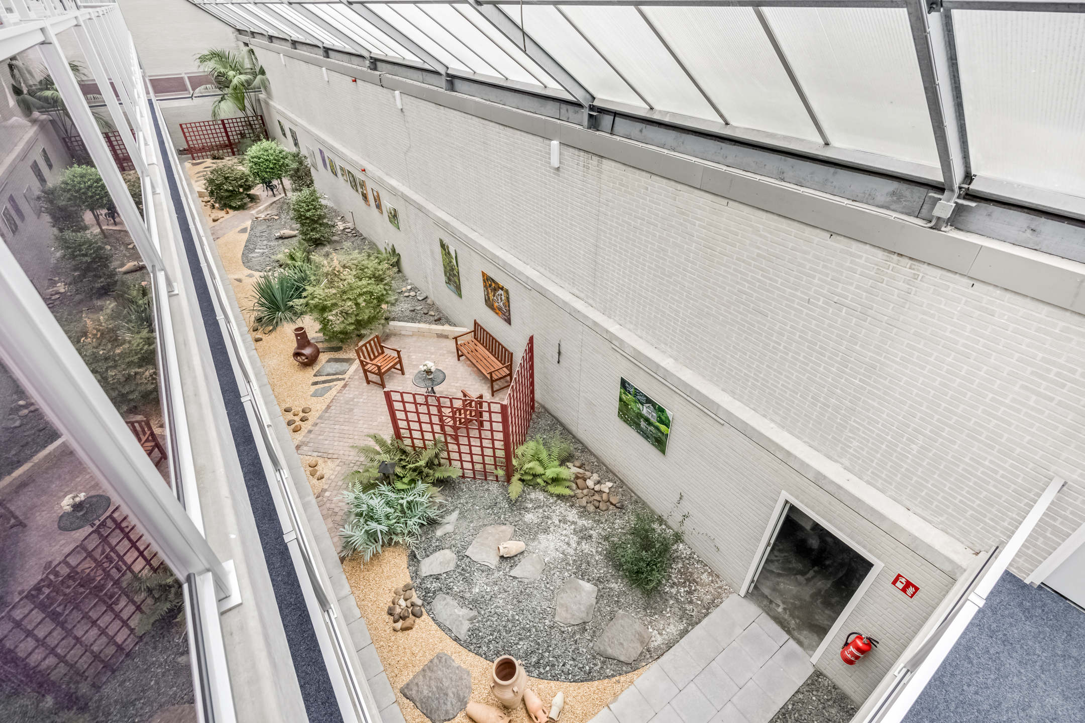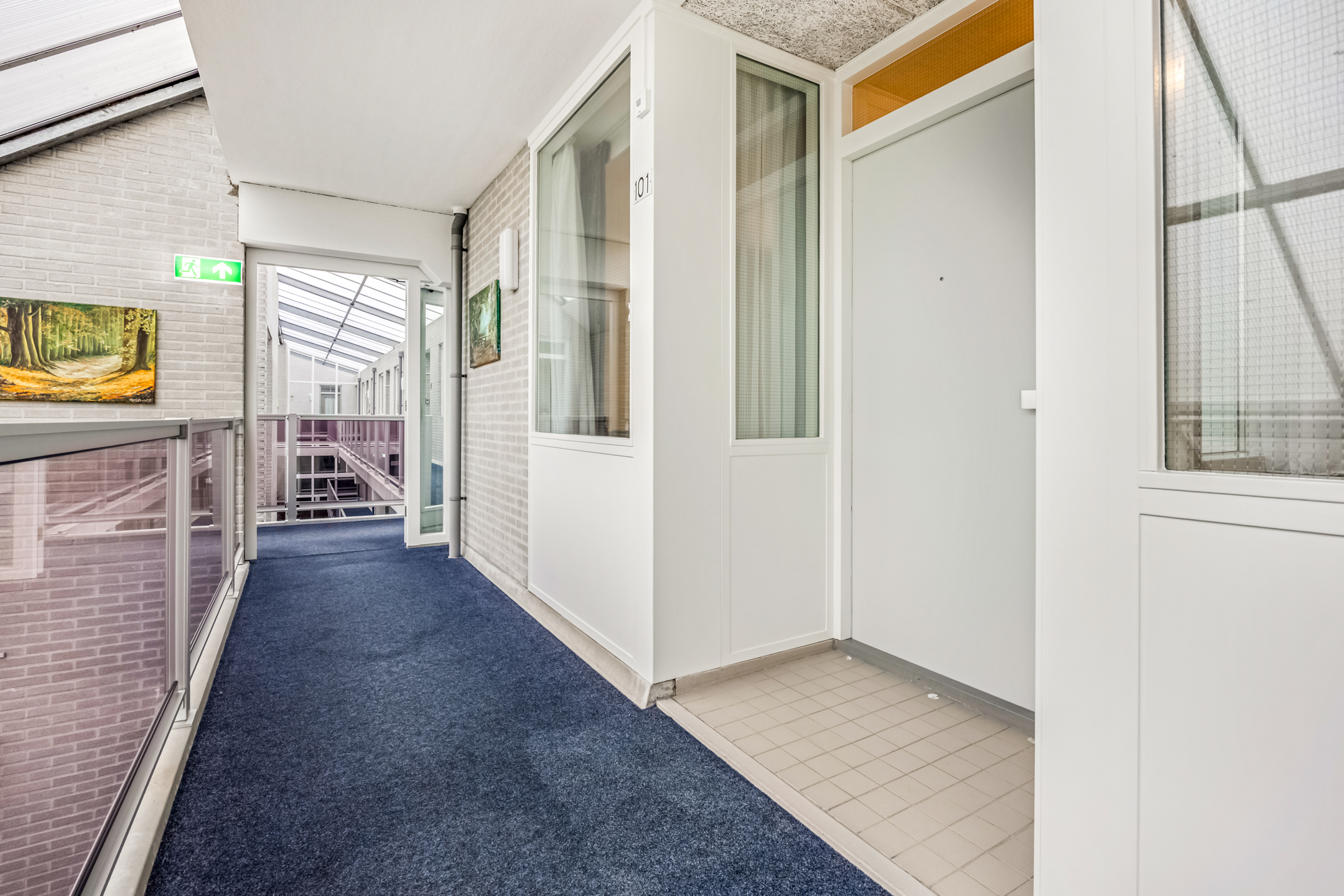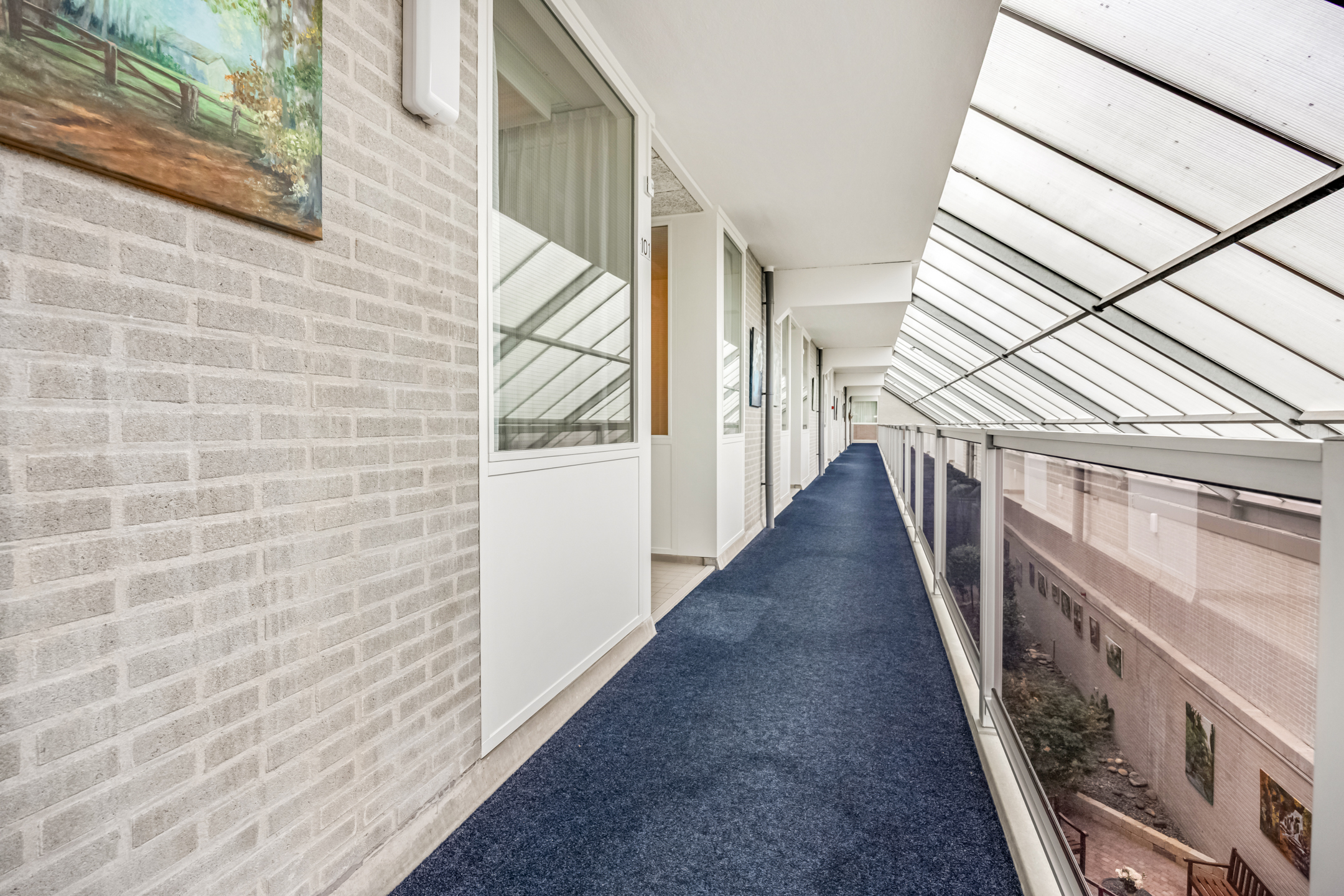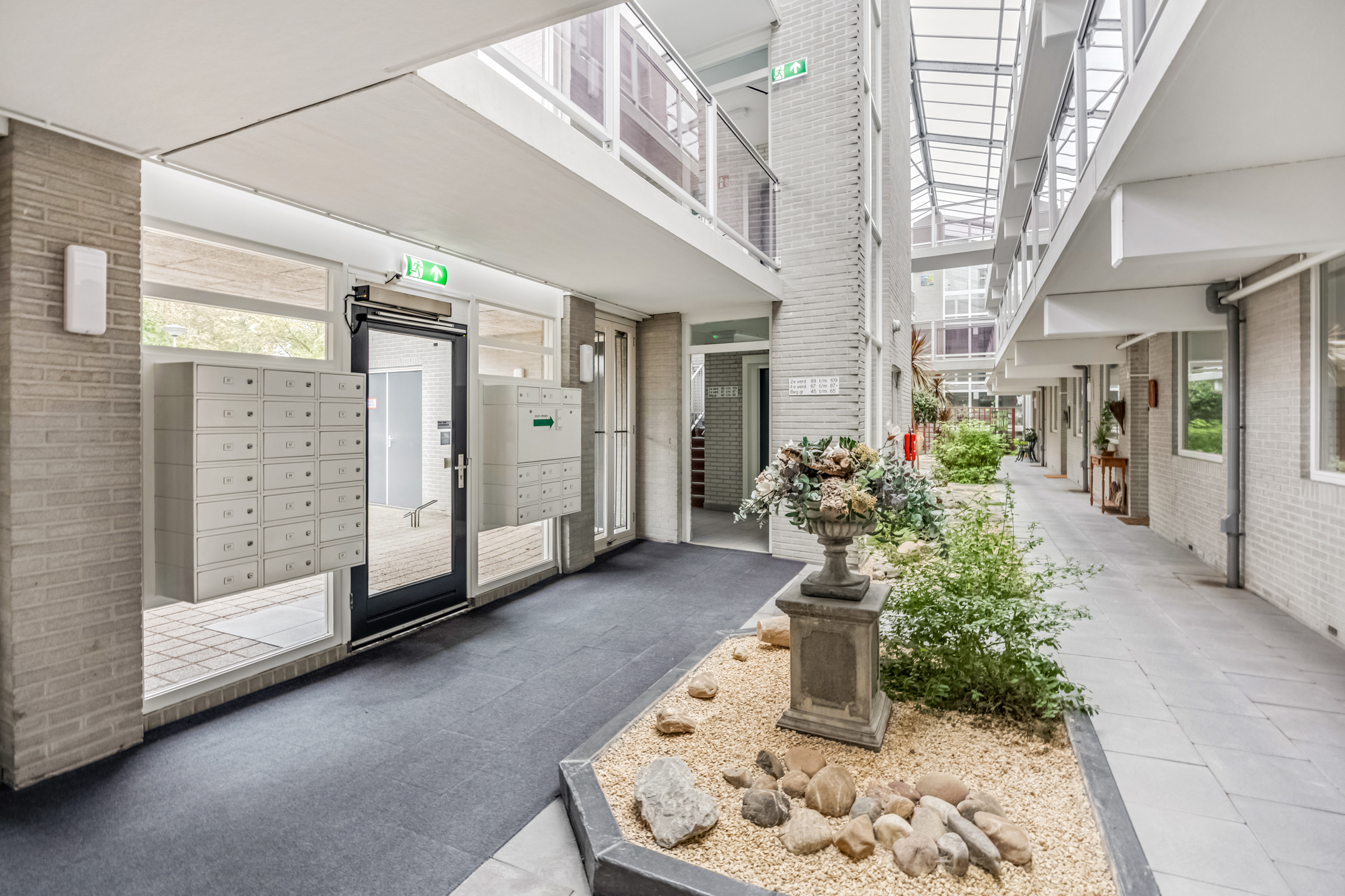 Aan de woonkamer grenst een balkon op het westen. Hier kunt u heerlijk buiten zitten met uitzicht op de omgeving. Daarnaast is er een gezamenlijke, overdekte binnentuin waar bewoners elkaar kunnen ontmoeten.